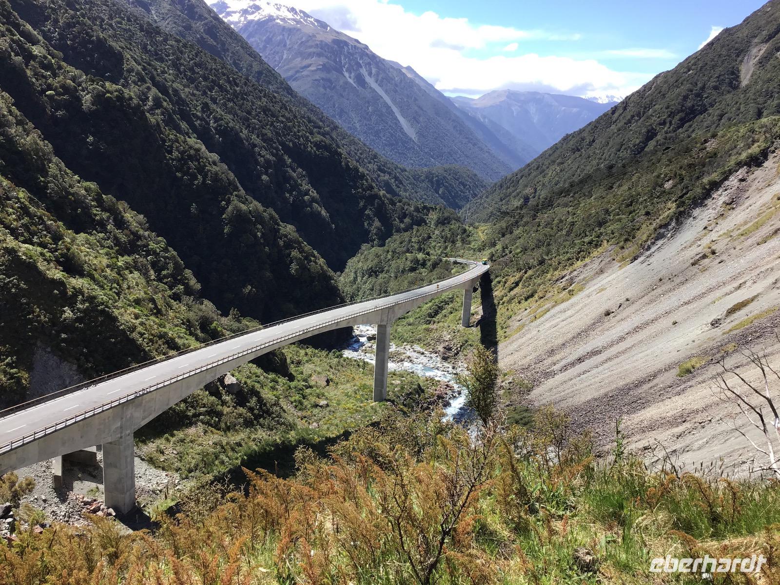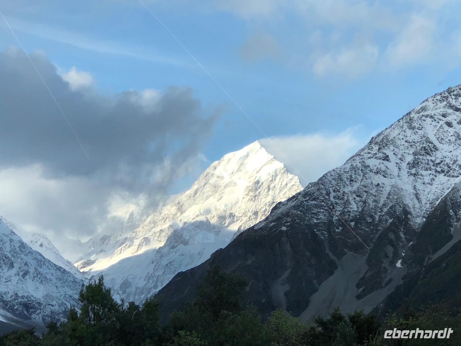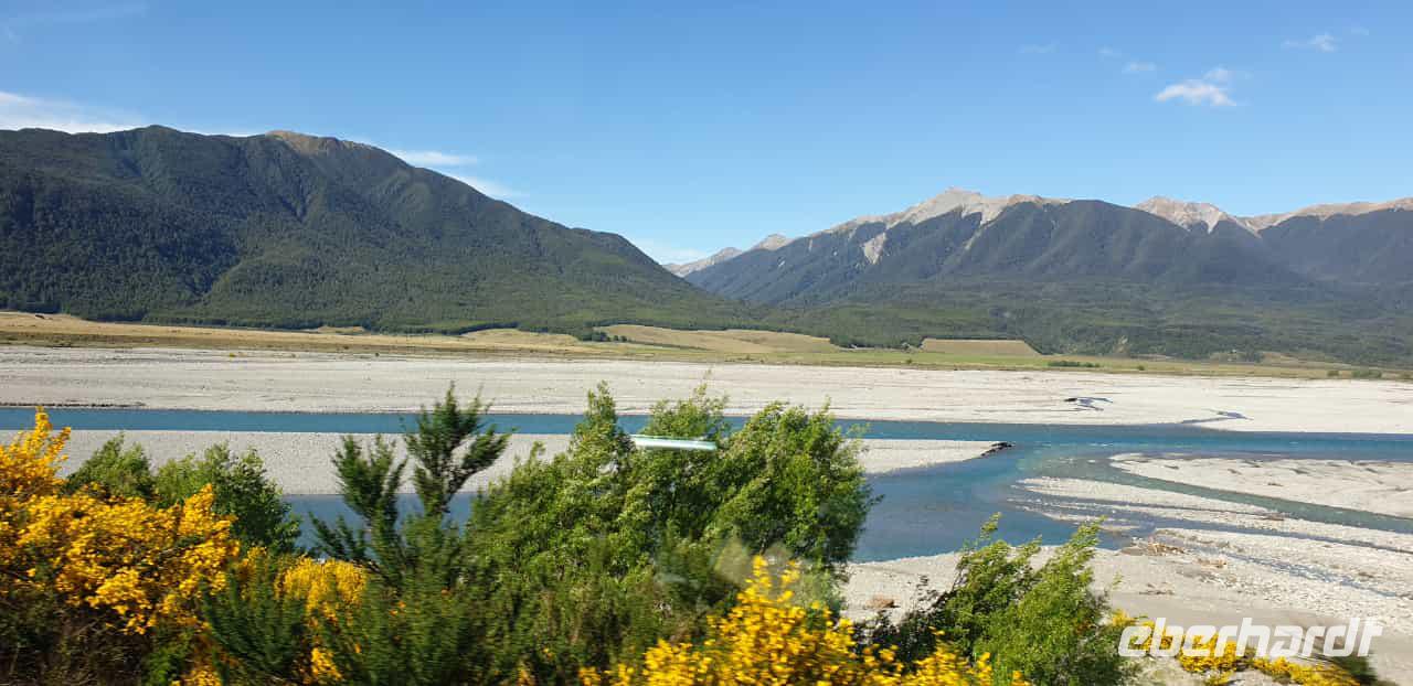 Nach Christchurch fahren wir ebenfalls mit der Bahn, natürlich nicht mit einer Museumsbahn. Die Fahrt führt durch eine spektakuläre Berglandschaft, die heute im schönsten Sonnenlicht glänzt.
