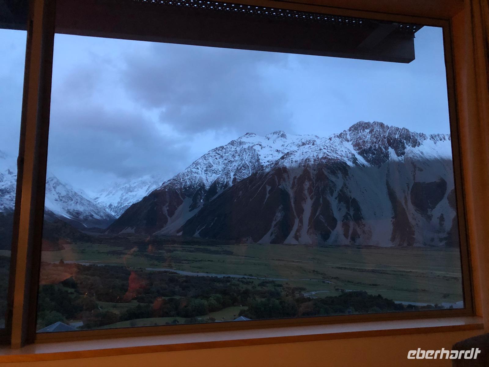 Gekrönt wird der Tag von einem köstlichen Abendessen im Panoramarestaurant mit Blick auf Mount Cook.