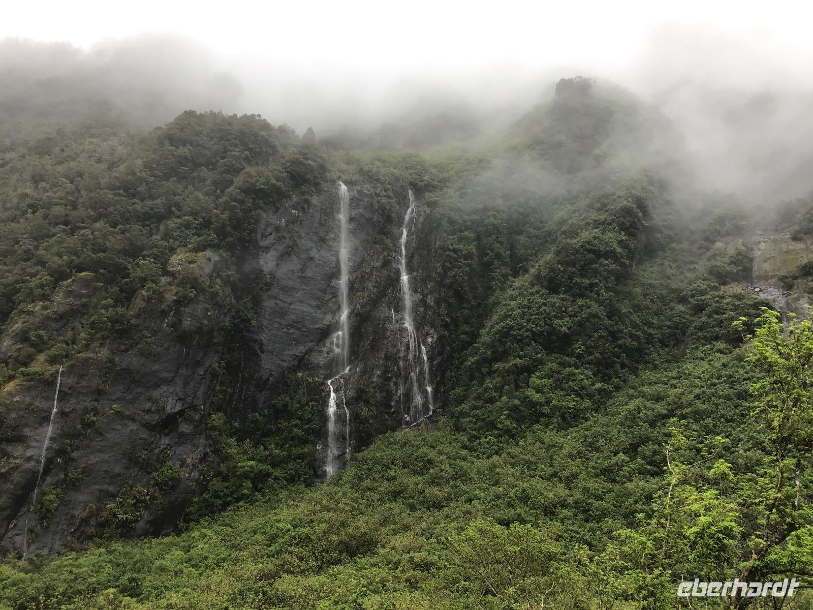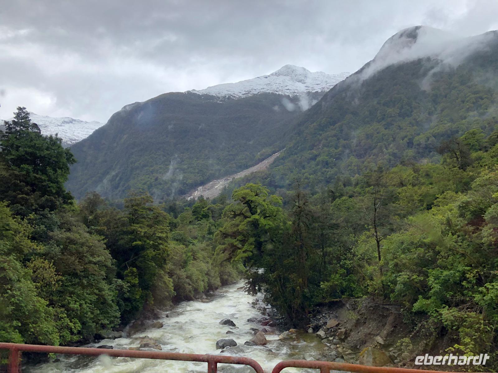 Die Helikopterflüge fallen aus, es regnet und der Himmel ist voller Wolken. Der Weg zum Fox-Gletscher ist gesperrt, der Franz-Josef-Gletscher verbirgt sich im Nebel.