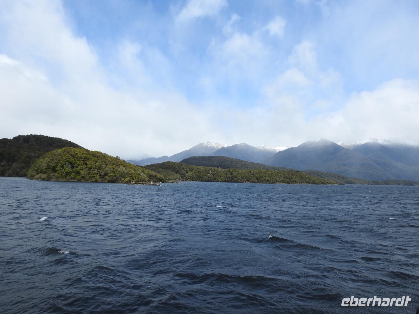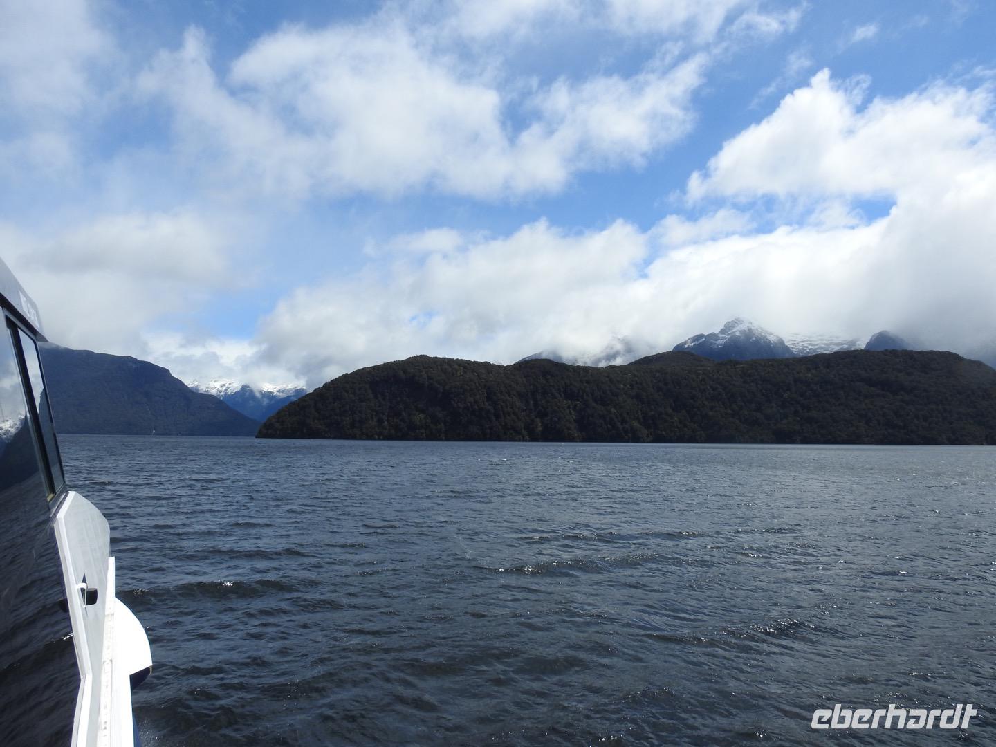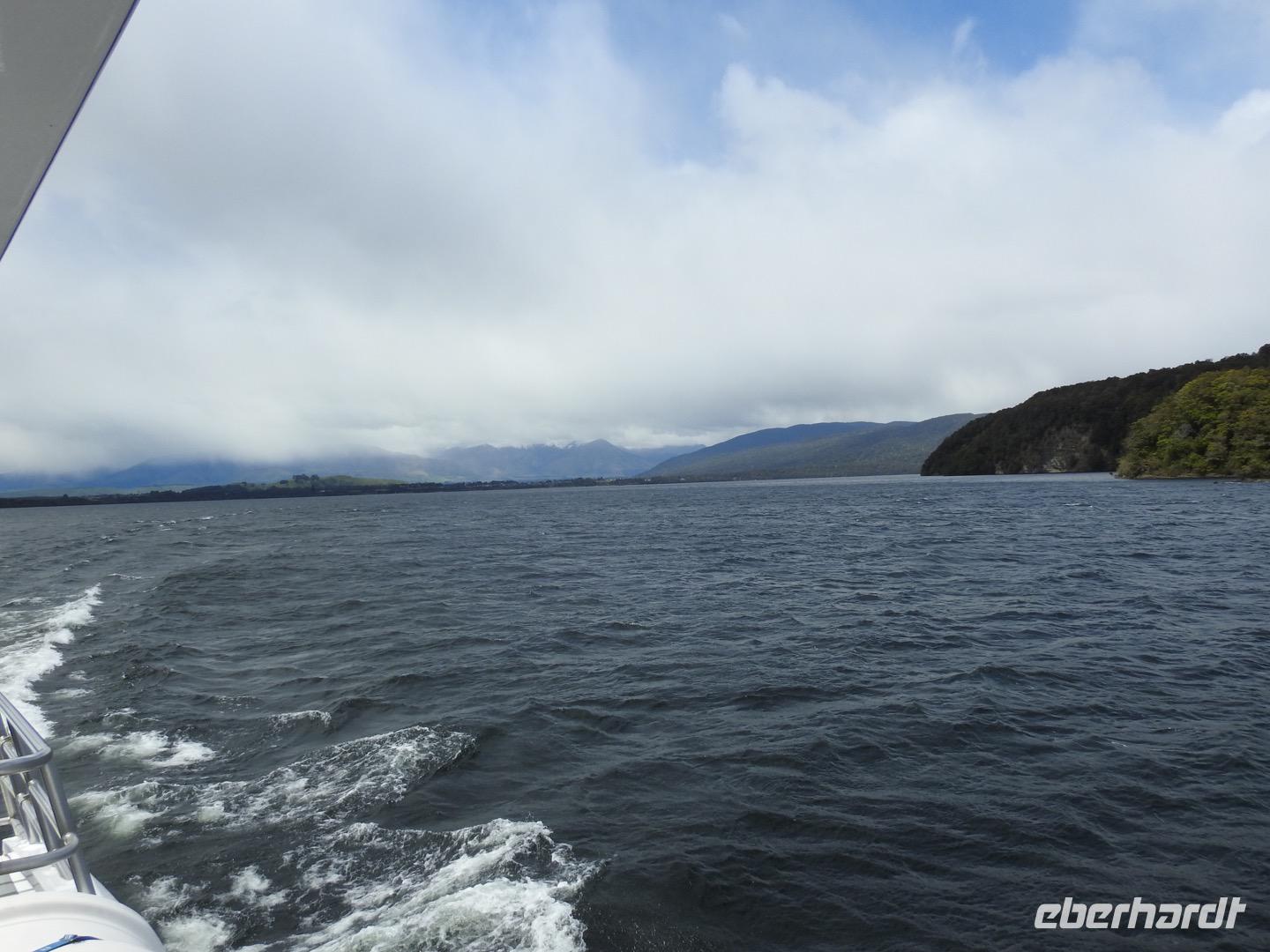 Wir unternehmen eine Kreuzfahrt im Doubtful Sound. Mittags erreichen wir Manapuri. Hier steigen wir auf einen Katamaran, mit dem wir den Manapurisee überqueren. Nach einer knappen Stunde erreichen wir das andere Ende des Sees. Zwei Reisebusse bringen die Kreuzfahrer zum Schiff NAVIGATOR (außer uns gibt es noch viele andere Gäste). Wir werden von der freundlichen Crew begrüßt. Im Salon gibt es eine Sicherheitsbelehrung und die Kabinenschlüssel. Wir sind auf verschiedenen Decks untergebracht, es gibt Doppelkabinen, Twins (das sind Doppelkabinen mit getrennten Betten) und Einzelkabinen. Jede Kabine ist mit einer eigenen Dusche und Toilette ausgestattet. Fön und Haarwaschmittel sind vorhanden. Alle Kabinen sind Außenkabinen. Wir werden auf einen Imbiss eingeladen, es gibt Gemüsesuppe nach Wahl. Uns treibt es hinaus an Deck. Unser Schiff nimmt Fahrt auf und rauscht in die Tasmanische See. Jetzt ist Festhalten angesagt, denn hier draußen stürmt es ordentlich. Die Lektorin zeigt uns, wo Pinguine und Seelöwen zu sehen sind. Im Salon werden Kaffee und Kuchen angeboten. Zurück vom offenen Meer fahren wir in den Doubtful Sound. Hier ist es etwas ruhiger. Wir werden eingeladen, an einer Tenderbootfahrt oder einer Kajaktour teilzunehmen. Raphaela, die Deutsch sprechende Mitarbeiterin der NAVIGATOR, ist Bootsführerin und fährt mit uns an die steilen Ufer des Fjords. Die Kajakfahrer müssen selber paddeln. Nach dem Abendessen sitzen wir bei einer gepflegten Flasche Wein zusammen im Salon und lassen den Abend ausklingen. Nach und nach verschwinden alle in ihren Kabinen.