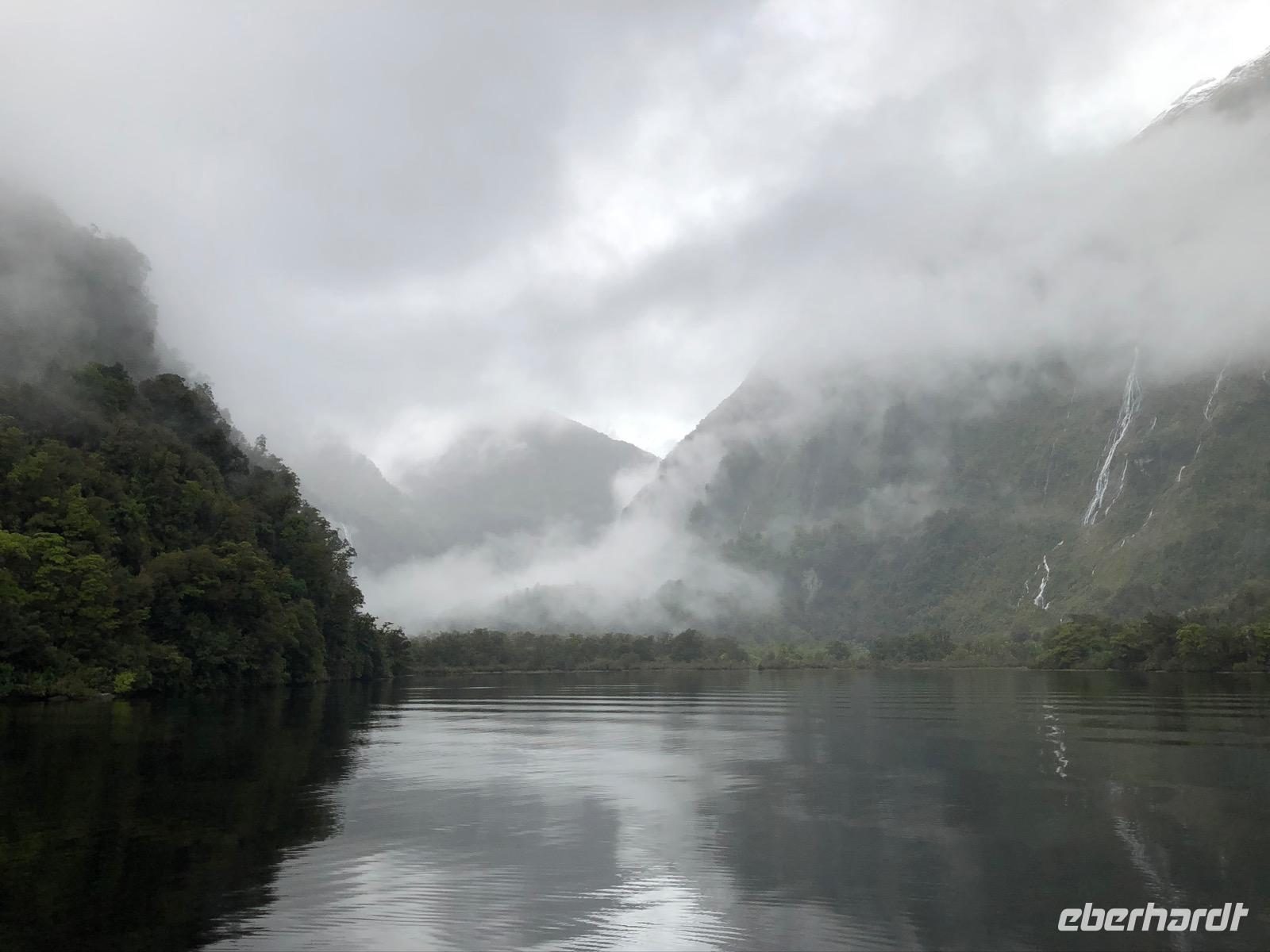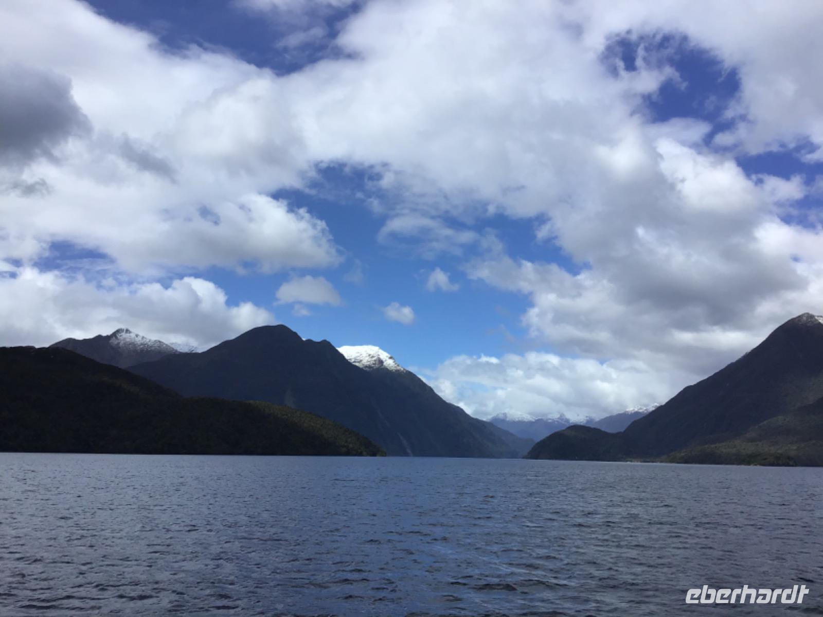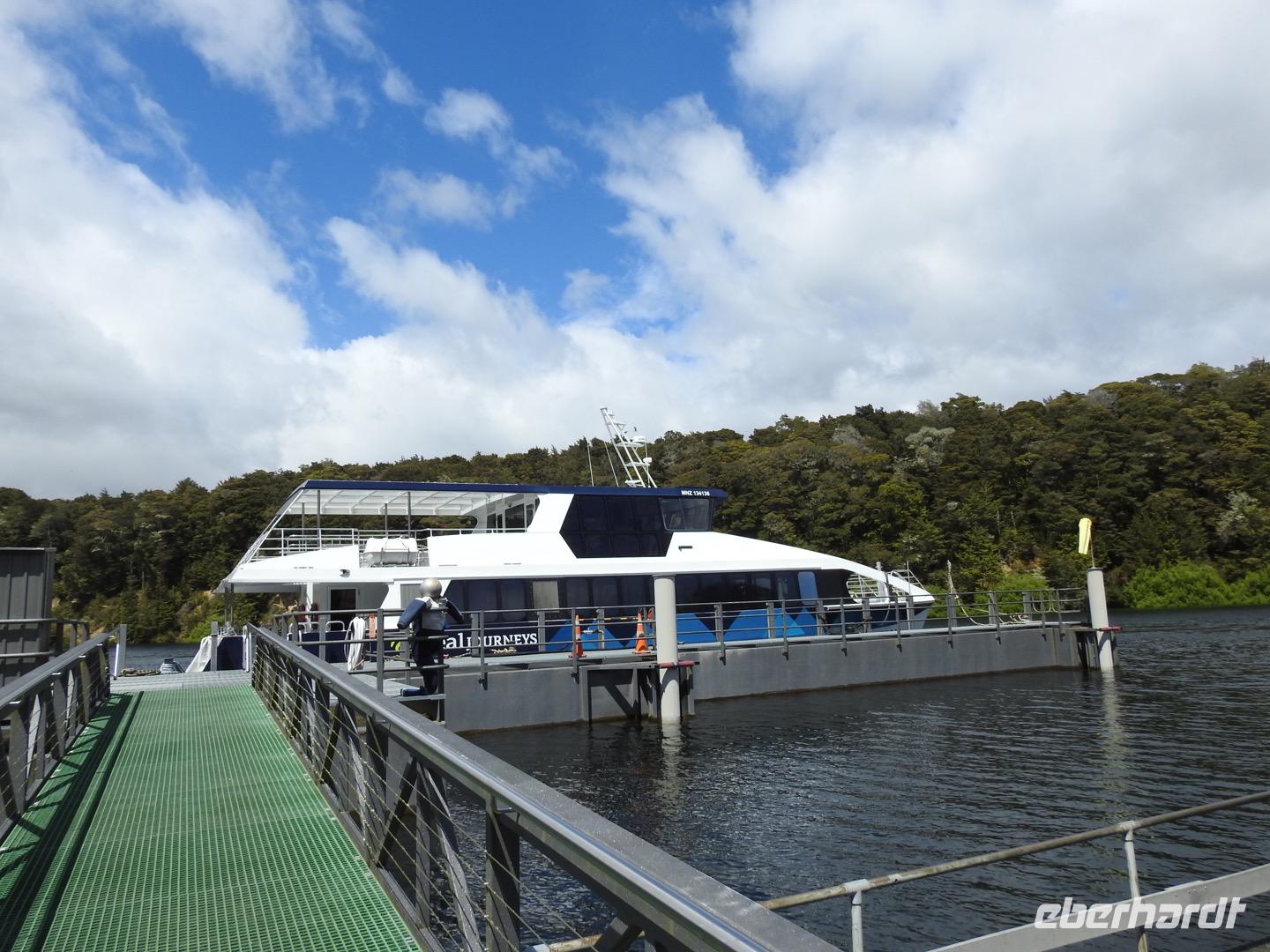 Wir unternehmen eine Kreuzfahrt im Doubtful Sound. Mittags erreichen wir Manapuri. Hier steigen wir auf einen Katamaran, mit dem wir den Manapurisee überqueren. Nach einer knappen Stunde erreichen wir das andere Ende des Sees. Zwei Reisebusse bringen die Kreuzfahrer zum Schiff NAVIGATOR (außer uns gibt es noch viele andere Gäste). Wir werden von der freundlichen Crew begrüßt. Im Salon gibt es eine Sicherheitsbelehrung und die Kabinenschlüssel. Wir sind auf verschiedenen Decks untergebracht, es gibt Doppelkabinen, Twins (das sind Doppelkabinen mit getrennten Betten) und Einzelkabinen. Jede Kabine ist mit einer eigenen Dusche und Toilette ausgestattet. Fön und Haarwaschmittel sind vorhanden. Alle Kabinen sind Außenkabinen. Wir werden auf einen Imbiss eingeladen, es gibt Gemüsesuppe nach Wahl. Uns treibt es hinaus an Deck. Unser Schiff nimmt Fahrt auf und rauscht in die Tasmanische See. Jetzt ist Festhalten angesagt, denn hier draußen stürmt es ordentlich. Die Lektorin zeigt uns, wo Pinguine und Seelöwen zu sehen sind. Im Salon werden Kaffee und Kuchen angeboten. Zurück vom offenen Meer fahren wir in den Doubtful Sound. Hier ist es etwas ruhiger. Wir werden eingeladen, an einer Tenderbootfahrt oder einer Kajaktour teilzunehmen. Raphaela, die Deutsch sprechende Mitarbeiterin der NAVIGATOR, ist Bootsführerin und fährt mit uns an die steilen Ufer des Fjords. Die Kajakfahrer müssen selber paddeln. Nach dem Abendessen sitzen wir bei einer gepflegten Flasche Wein zusammen im Salon und lassen den Abend ausklingen. Nach und nach verschwinden alle in ihren Kabinen.