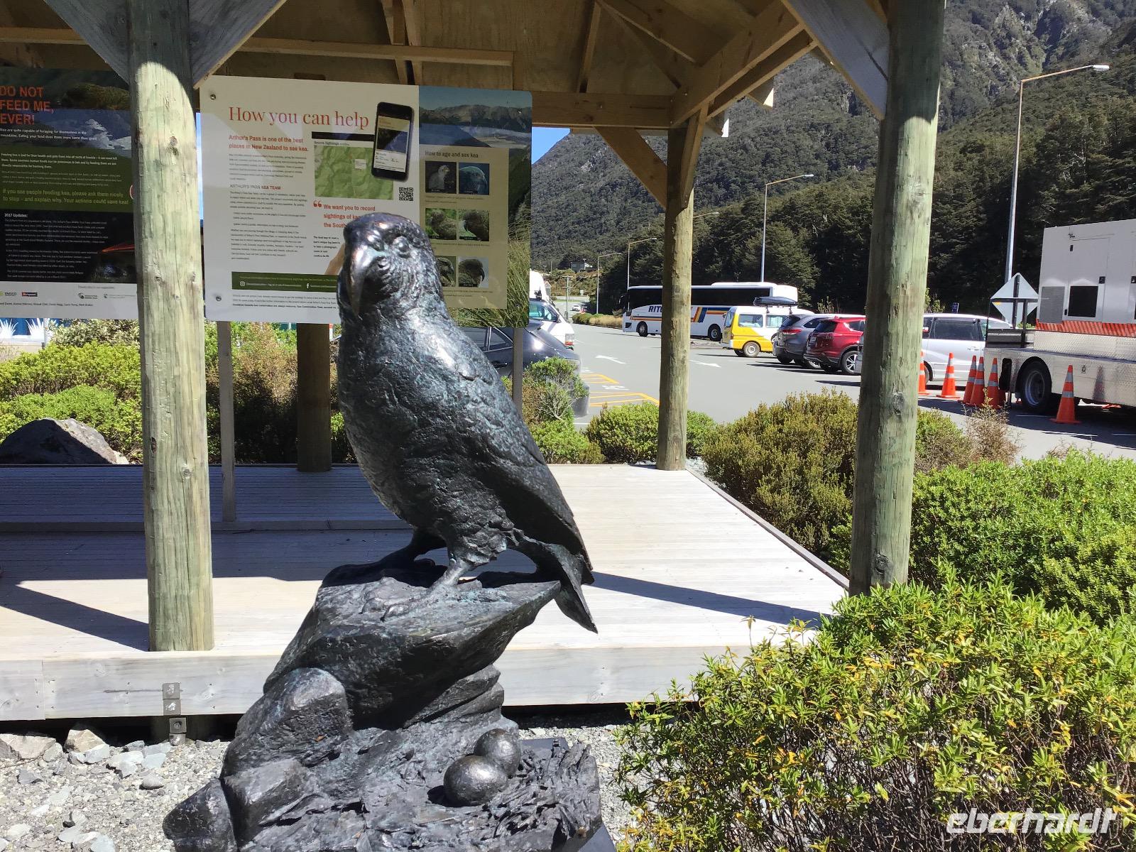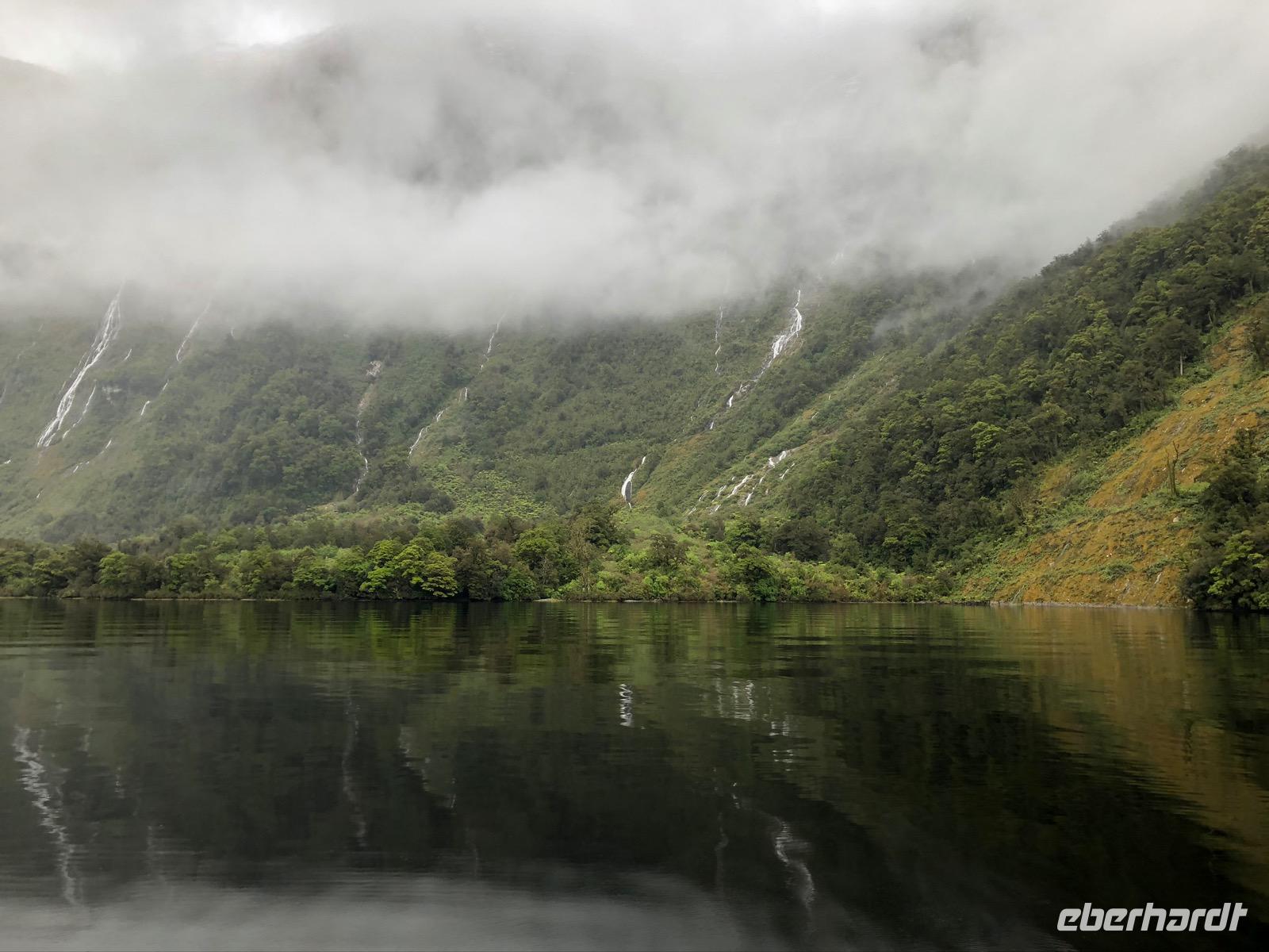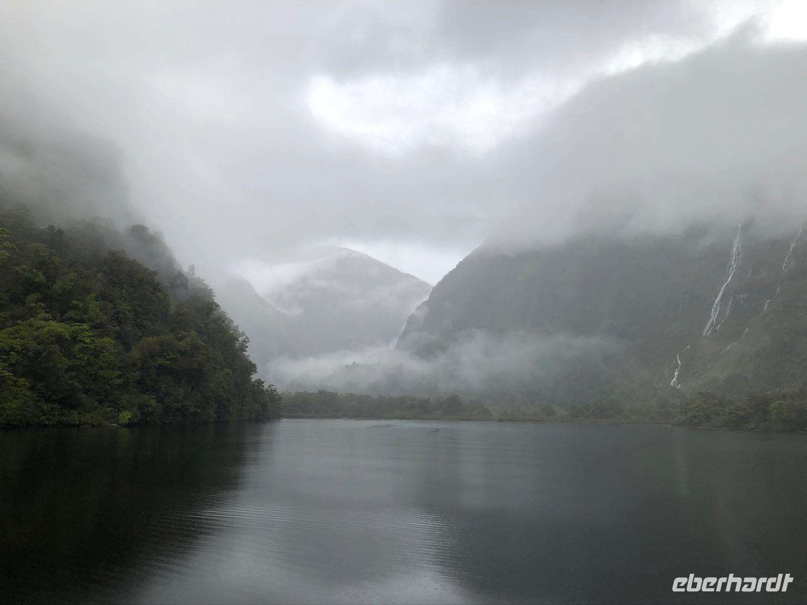 Nun geht es zügig zurück. Wieder überqueren wir mit dem Bus den Wilmot Pass. Das Wetter ist noch schlimmer als bei der Anreise. Es regnet und ist neblig. Der Wald hat sich in einen Zauberwald verwandelt, in Fetzen hängen die Flechten von den Bäumen. Die Fähre über den Manapourisee ist auf dem Rückweg nicht so bequem wie bei der Hinfahrt, aber das macht nichts, wir haben so schöne Erlebnisse hinter uns.