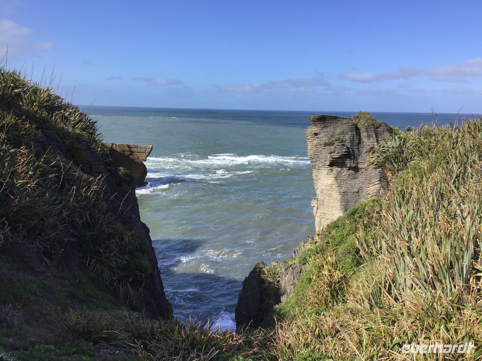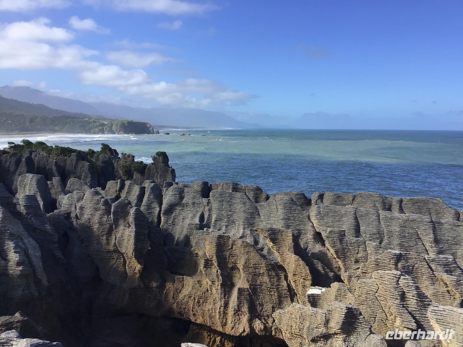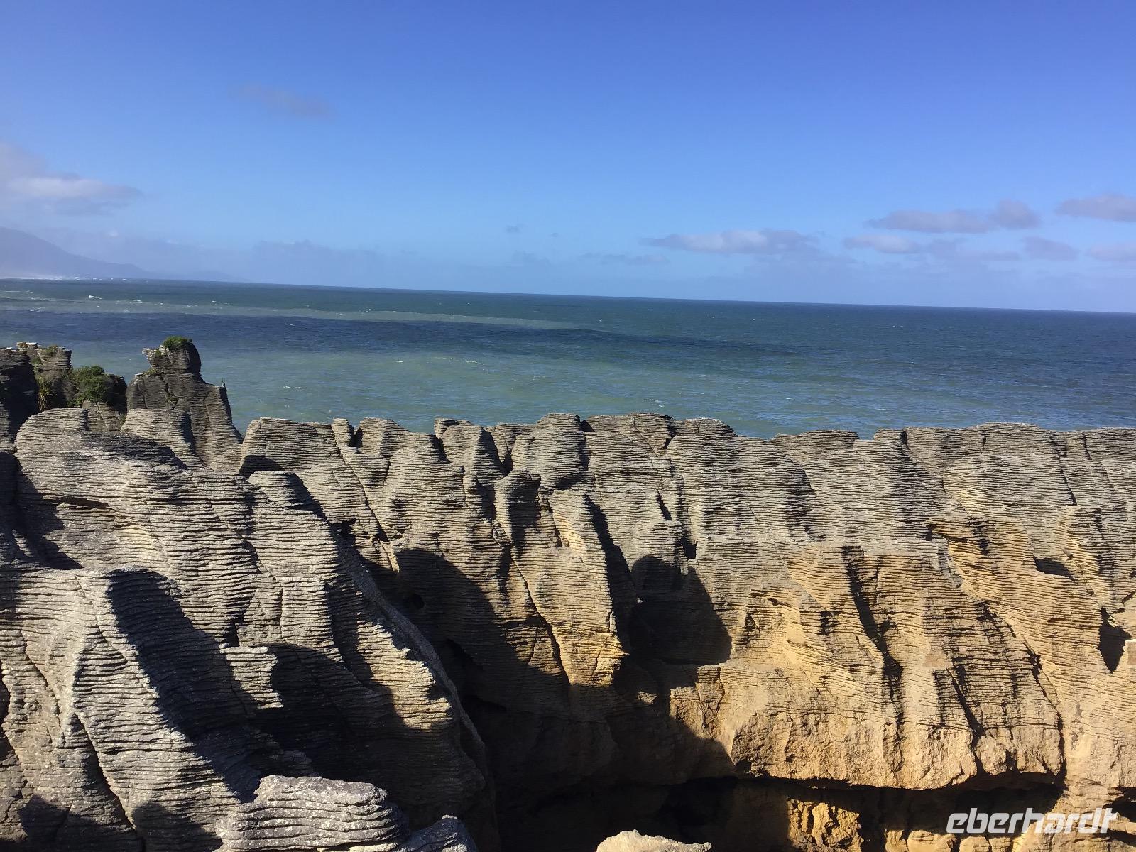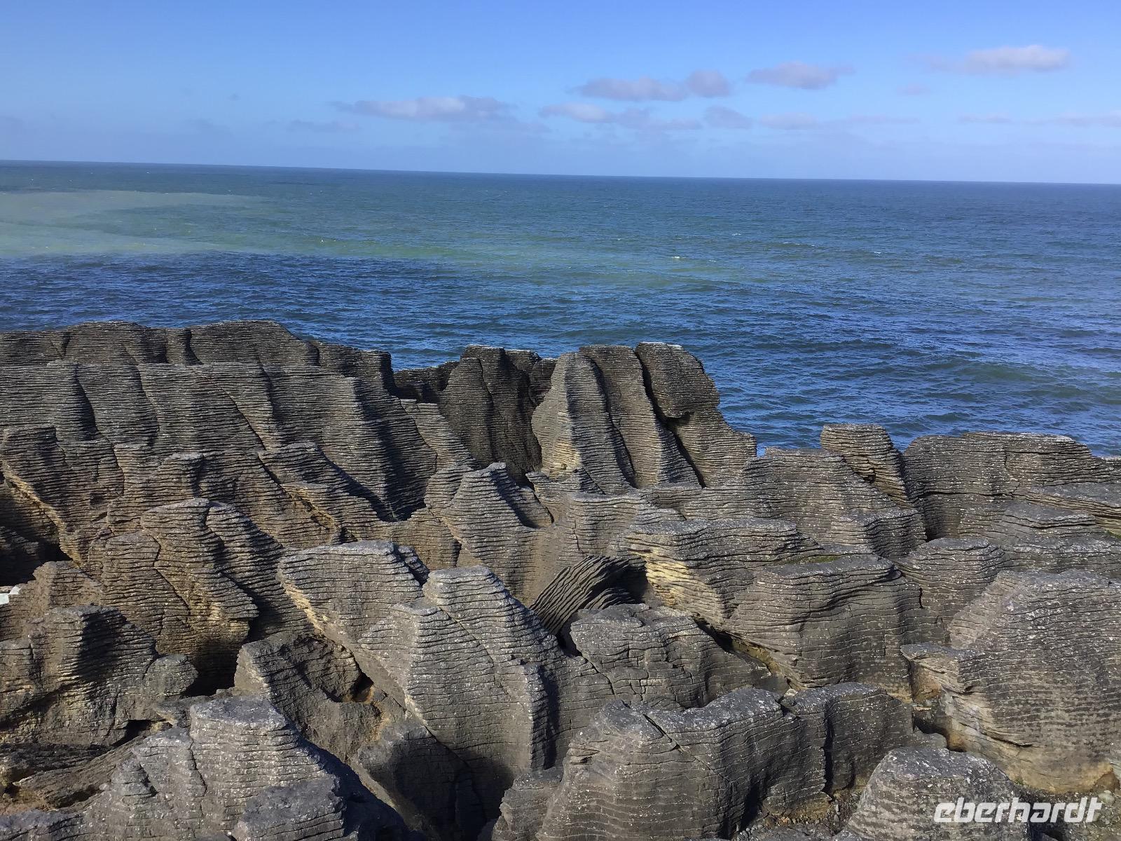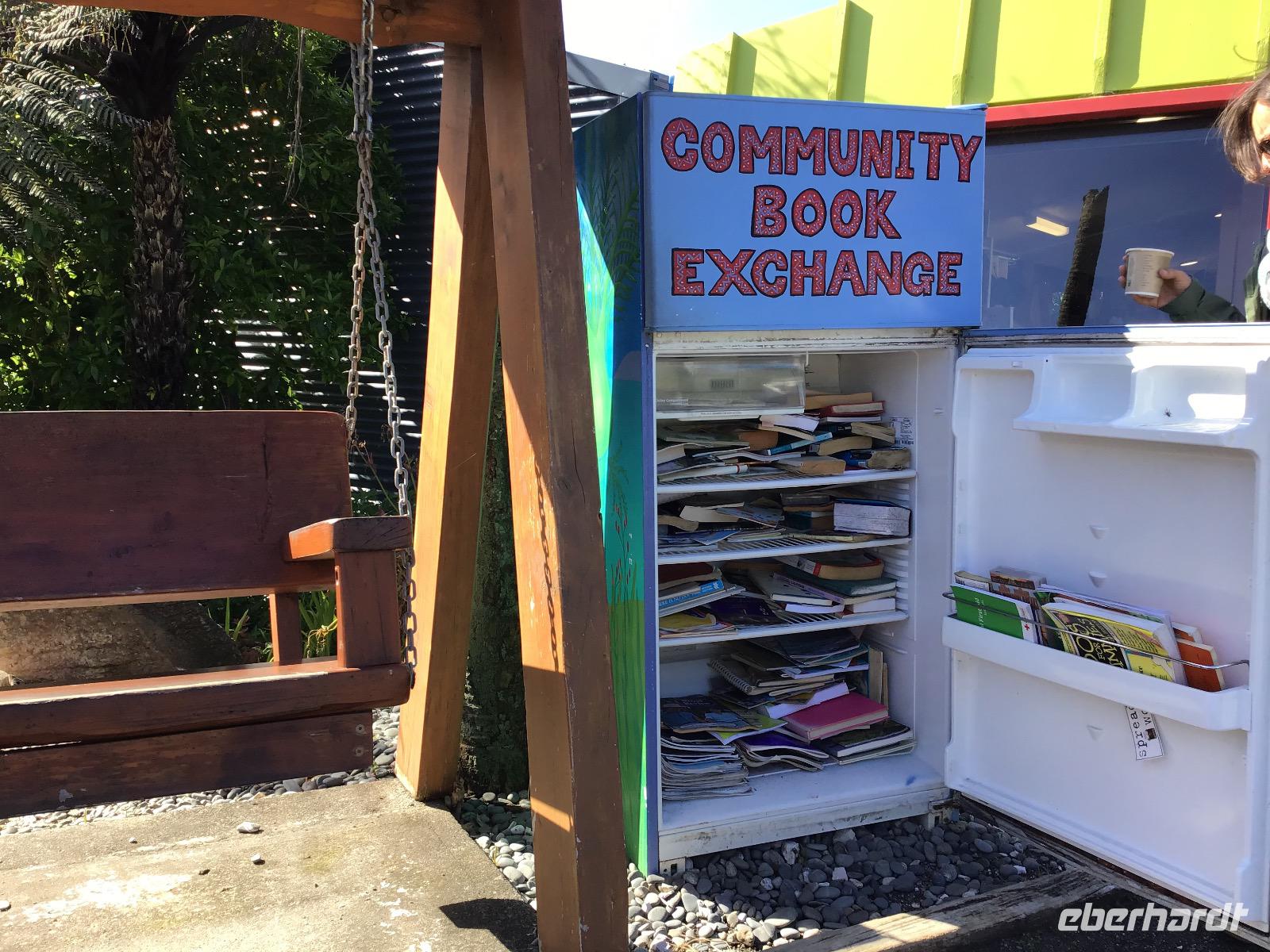 Endlich hat es aufgehört, zu regnen. Das kommt unserem Programm heute zugute. Nach dem Frühstück fahren wir zu den Pfannkuchenfelsen. Hier erwartet uns eine spektakuläre Felslandschaft. Auf einem Rundweg mit Aussichtsplattformen können wir bequem die Aussicht genießen. Die Felsen bestehen aus übereinander geschichteten Platten. Daher auch der Name - wir würden Eierkuchenfelsen sagen. Mehr als dreißig Millionen Jahre hat es gebraucht, um diese bizarre Landschaft entstehen zu lassen. Der Vorgang wird Stylobledding genannt. Man versteht darunter das Absinken von Schalentieren und Muscheln auf den Meeresgrund, die durch Druck versteinerte Kalkschichten bildeten und von Wind, Meer und Regen geformt wurden. Zwischen den Felsformationen befinden sich sogenannte Blowholes, das sind Löcher, durch die die Brandung schießt und sich manchmal zu riesigen Wasserfontänen aufbäumt. Der Spaziergang dauert vielleicht eine halbe Stunde und wir haben noch Zeit für einen Kaffee. Vor dem Café steht eine blaue Box mit der Aufschrift Community Box Exchange. Diese Box entpuppt sich als ein alter Kühlschrank, der in eine besondere Art von Bibliothek verwandelt wurde. Das bedeutet, jeder der vorbei kommt, kann sich etwas zum Lesen heraus nehmen, aber auch gern etwas hinein tun. Ein kurzes Stöbern bringt wahre Schätze zum Vorschein. Hier war offensichtlich lange niemand mehr zu Gange. Die Zeitschriften haben auf jeden Fall historischen Wert. Diesmal haben wir nur mitgenommen, aber beim nächsten Besuch werde ich auch etwas hinein legen, versprochen.