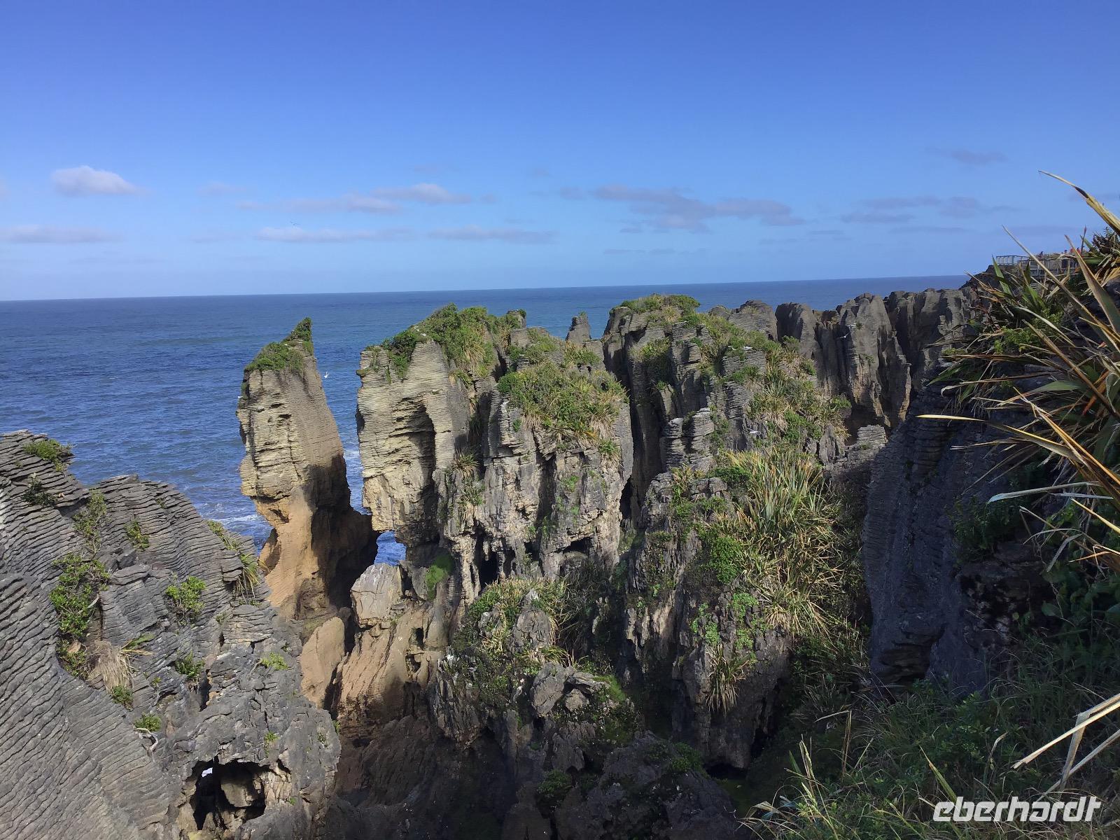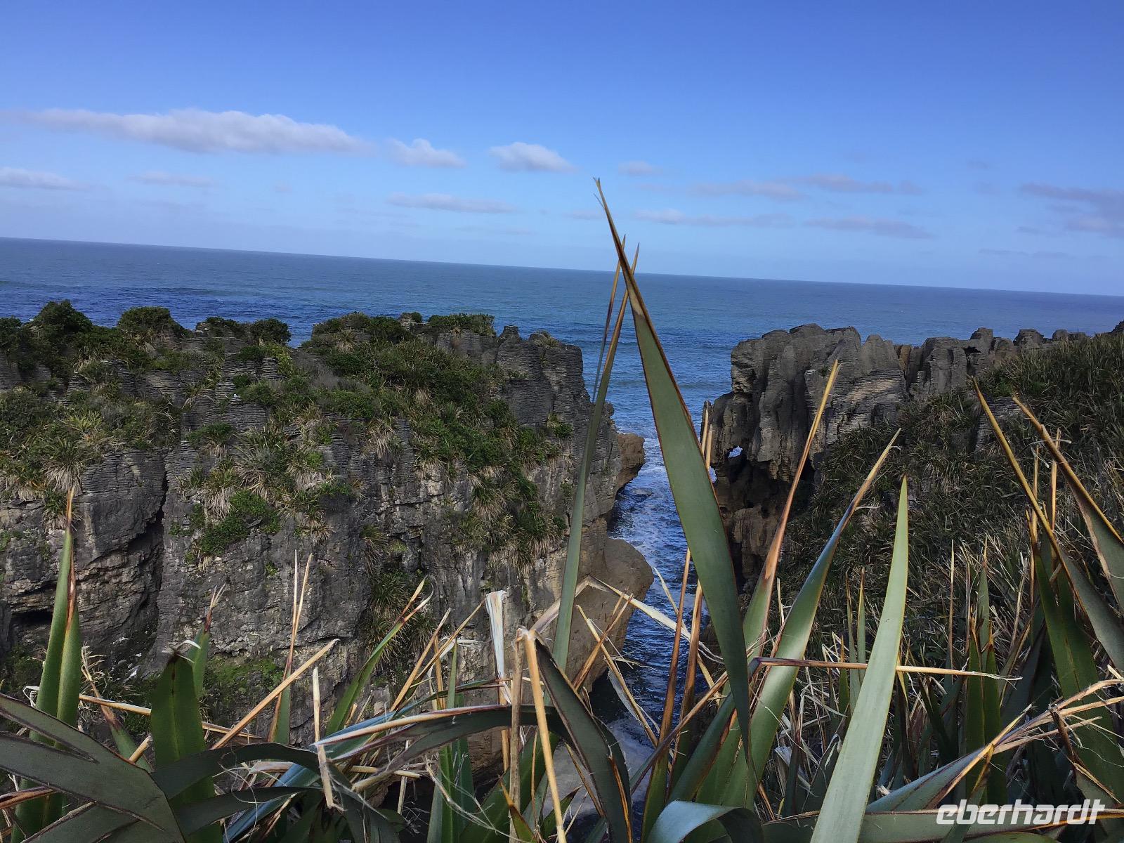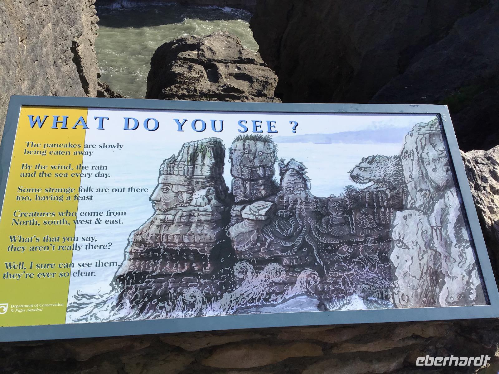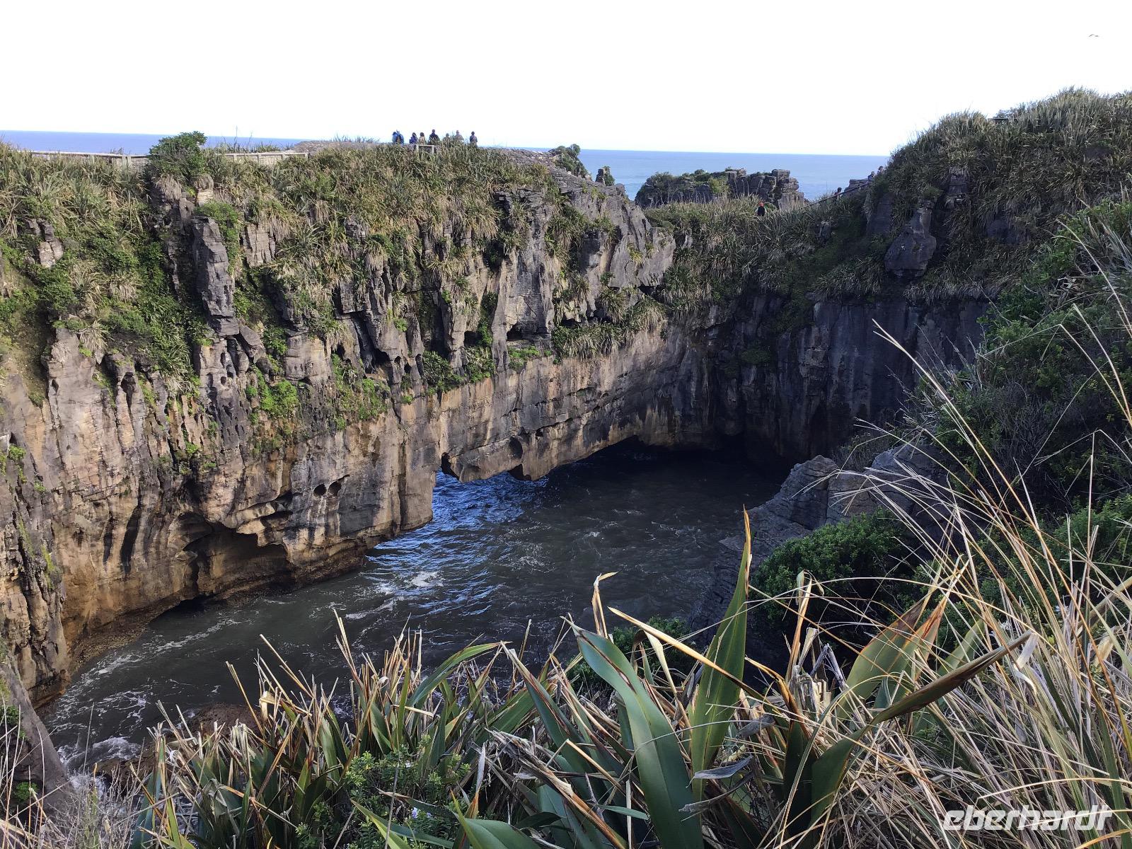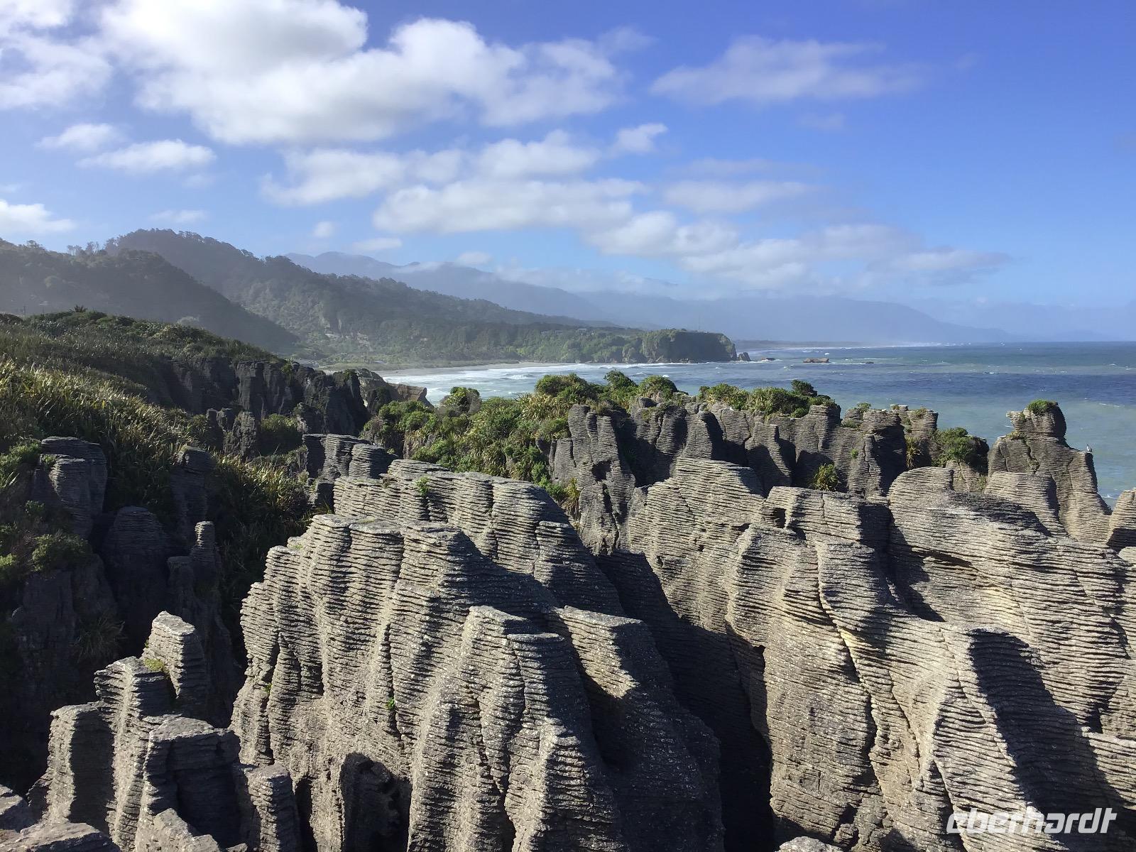 Endlich hat es aufgehört, zu regnen. Das kommt unserem Programm heute zugute. Nach dem Frühstück fahren wir zu den Pfannkuchenfelsen. Hier erwartet uns eine spektakuläre Felslandschaft. Auf einem Rundweg mit Aussichtsplattformen können wir bequem die Aussicht genießen. Die Felsen bestehen aus übereinander geschichteten Platten. Daher auch der Name - wir würden Eierkuchenfelsen sagen. Mehr als dreißig Millionen Jahre hat es gebraucht, um diese bizarre Landschaft entstehen zu lassen. Der Vorgang wird Stylobledding genannt. Man versteht darunter das Absinken von Schalentieren und Muscheln auf den Meeresgrund, die durch Druck versteinerte Kalkschichten bildeten und von Wind, Meer und Regen geformt wurden. Zwischen den Felsformationen befinden sich sogenannte Blowholes, das sind Löcher, durch die die Brandung schießt und sich manchmal zu riesigen Wasserfontänen aufbäumt. Der Spaziergang dauert vielleicht eine halbe Stunde und wir haben noch Zeit für einen Kaffee. Vor dem Café steht eine blaue Box mit der Aufschrift Community Box Exchange. Diese Box entpuppt sich als ein alter Kühlschrank, der in eine besondere Art von Bibliothek verwandelt wurde. Das bedeutet, jeder der vorbei kommt, kann sich etwas zum Lesen heraus nehmen, aber auch gern etwas hinein tun. Ein kurzes Stöbern bringt wahre Schätze zum Vorschein. Hier war offensichtlich lange niemand mehr zu Gange. Die Zeitschriften haben auf jeden Fall historischen Wert. Diesmal haben wir nur mitgenommen, aber beim nächsten Besuch werde ich auch etwas hinein legen, versprochen.