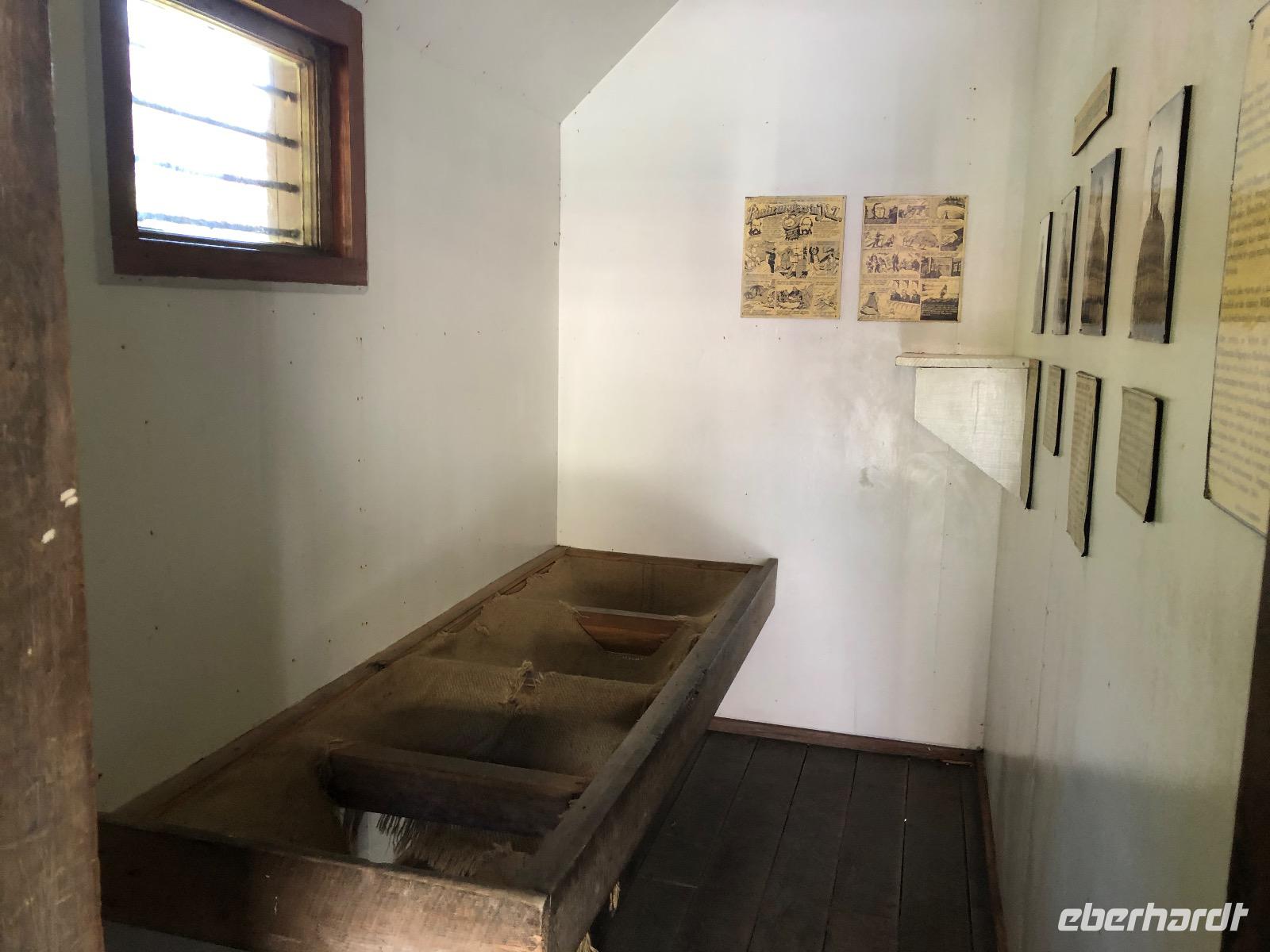 Im Kintop läuft ein Film über die alten Zeiten, die für die vom Goldrausch erfassten Männer nicht gerade einfach waren. Auch wird über den Mord an einem Straßenmeister berichtet. Im Gefängnis hängen die Fotos von den Straßenräubern, die ihr Unwesen mit dem Leben bezahlen mussten. Wir fahren mit einer alten Eisenbahn durch den Regenwald und bekommen eine Vorstellung davon, wie schwierig es war, hier eine Eisenbahn zu bauen. An der nächsten Station werden wir zum Goldwaschen eingeladen. Jeder bekommt eine Schüssel mit Steinchen und Schutt, die in Wasser getaucht und geschüttelt werden. Übrig bleiben winzig kleine Goldkörnchen, die für uns in Fläschchen gefüllt werden und die wir als Souvenir mit nach Hause nehmen können.