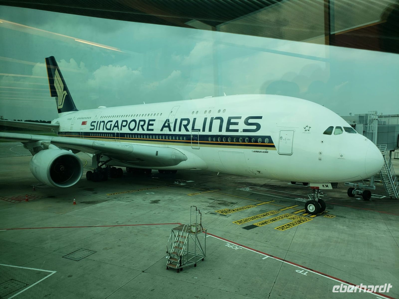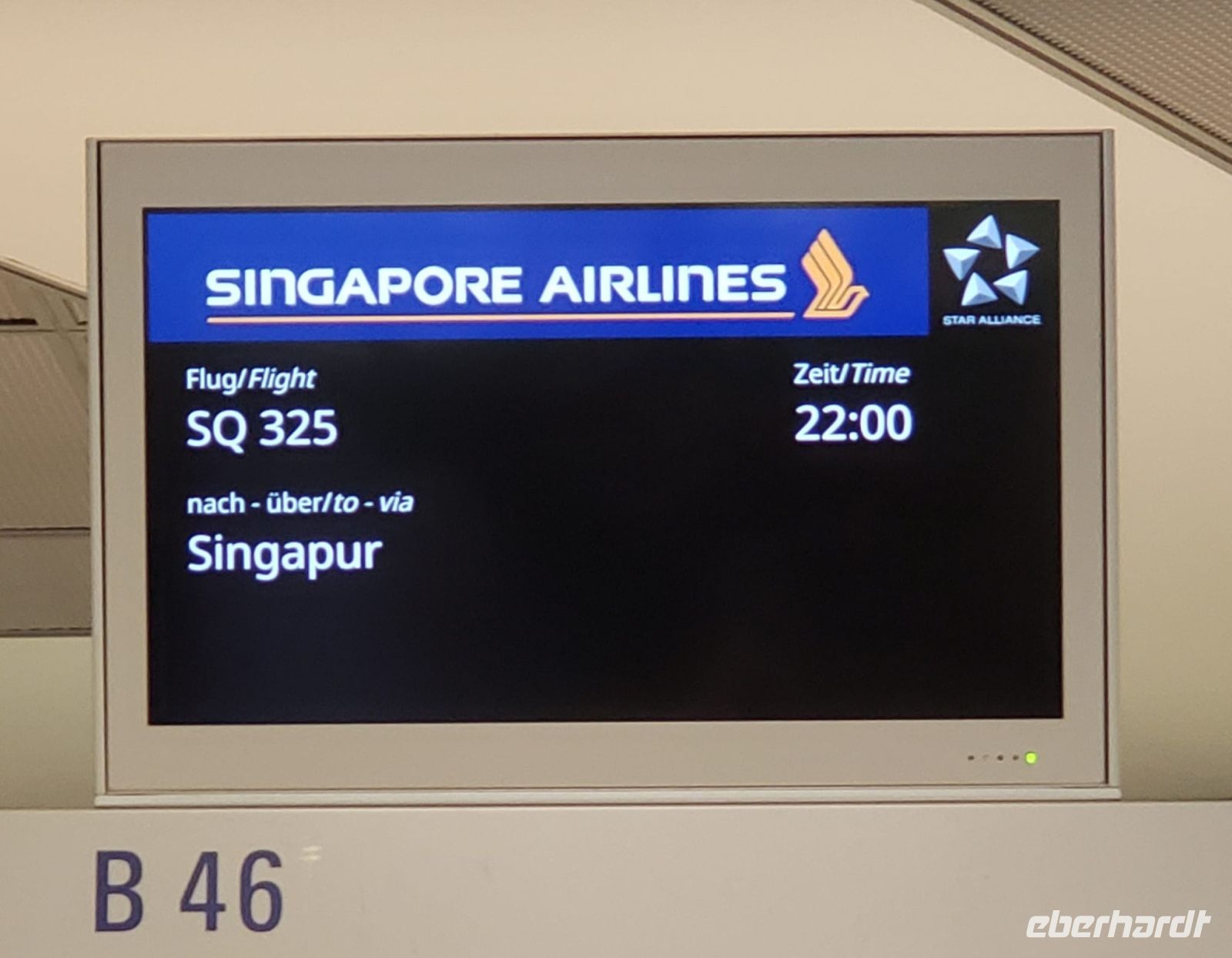 Wir kommen alle aus verschiedenen Richtungen und treffen uns schließlich am Flughafen Frankfurt am Boarding-Gate. Pünktlich um 22 Uhr startet unser Singapur - Airlines Flug SQ 325 nach Singapur.