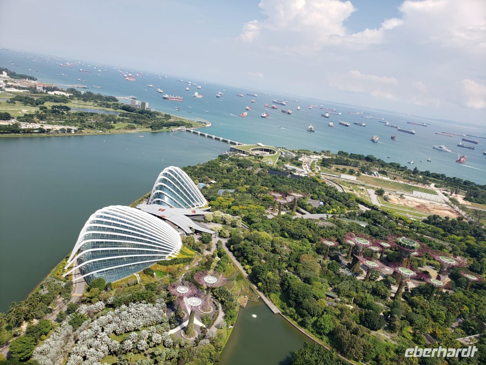 Das Wahrzeichen der Stadt, den Merlion, sehen wir von der Aussichtsplattform des Marina Bay Sands. Von hier aus haben wir eine Übersicht über die gesamte Stadt, auch die Größe des Hafens, wird uns von hier oben bewusst.