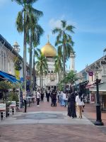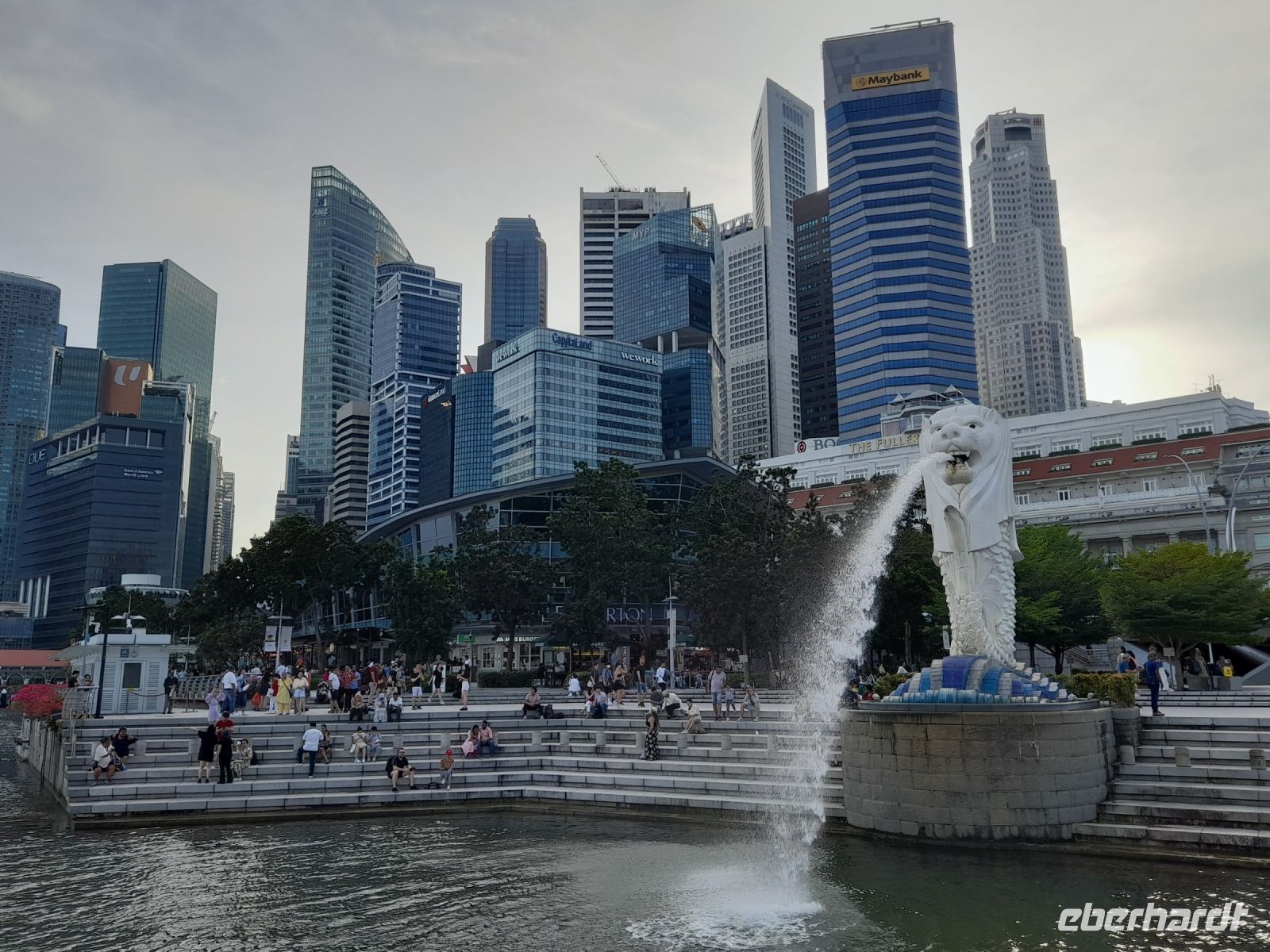 Unsere Stadtrundfahrt führt uns dann weiter ins arabische Viertel, während Martine uns allerhand über das Leben in Singapur erzählt. Schließlich geht es dann zurück zu den Ursprüngen der englischen Kolonie, denn auch die Gebäude aus dem 19. Jahrhundert sind neben all den modernen Hochhäusern nichtsdestotrotz erhalten geblieben. Am Ufer des Singapore Rivers treffen wir dann auch auf den Gründer des modernen Singapurs, Sir Thomas Stamford Raffles. Zu guter Letzt fehlt uns nur noch das Maskottchen des Singapur-Tourismus, der Merlion. Das Fabelwesen, halb Löwe, halb Fisch, spielt auf die Gründungslegende, sowie die Verbundenheit zum Meer an.