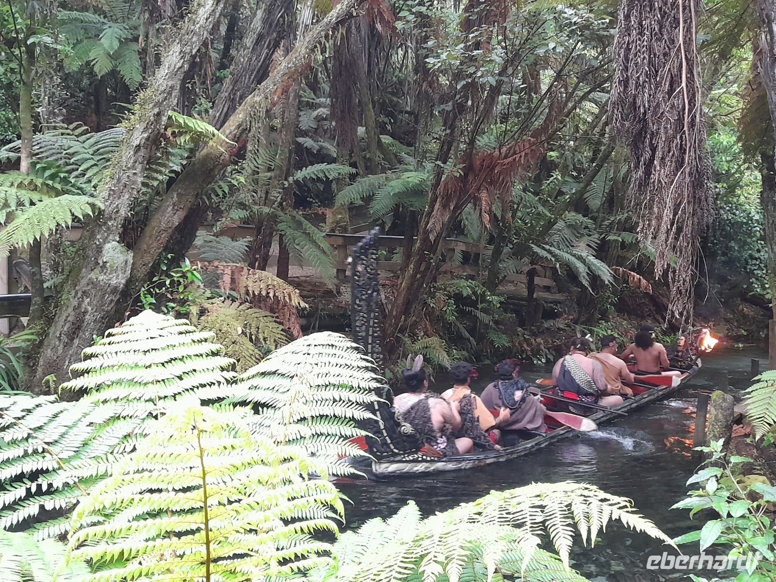 Am Abend folgt dann noch ein kulturelles Highlight: wir besuchen das Mitai Village, ein Kulturzentrum der lokalen Maori. Dort gibt es zunächst eine Ansprache, bei der wir einiges Wissenswertes über die Geschichte und die Herkunft der Maori, sowie über deren Sprache erfahren. Dann machen wir einen Spaziergang in den Wald und lernen dort die traditionellen Boote, die Waka der Krieger kennen. Danach folgt die offizielle Begrüßungszeremonie, bei der ein Auserwählter dem Maori-Oberhaupt gegenübertreten muss, gefolgt von einer Rede und einem Konzert. Zum Abschluss wird zu Ehren der Besucher dann ein Haka aufgeführt, den die meisten von uns vorher nur bei großen internationalen Sportveranstaltungen von der Neuseeländischen Nationalmannschaft gesehen haben.