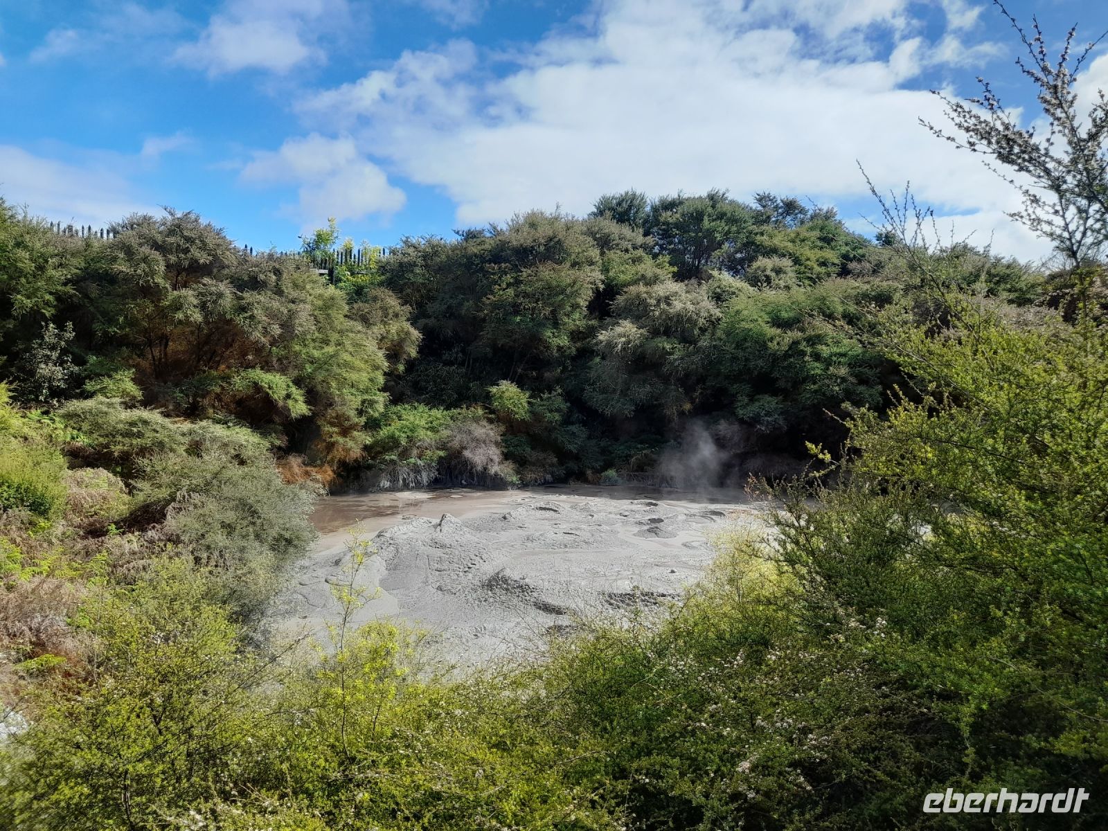 Wir wären gerne noch ein bisschen geblieben, aber leider müssen wir die Coromandel-Halbinsel heute schon wieder verlassen. Relativ früh brechen wir auf, denn ein Teil von uns hat eine Verabredung. Die Kleinstadt Matamata nennt sich seit einigen Jahren sehr selbstbewusst Hobbiton, denn ganz in der Nähe befindet sich tatsächlich die Farm, die als Drehort für die Filmtrilogie des „Herrn der Ringe“ gedient hat. Einige aus unserer Gruppe haben sich für den Besuch des Filmsets angemeldet und werden von uns standesgemäß dort abgesetzt. Für den Rest geht es weiter ins Zentrum der Maori-Kultur Neuseelands und Hauptstadt der geothermalen Aktivität, Rotorua. Die Stadt liegt am südlichen Ufer des gleichnamigen Sees und ist schon von weitem durch Dampfwolken zu erkennen und bald auch zu riechen, denn es gibt kaum einen Ort, der hier nicht nach Schwefel duftet. Wir machen eine kleine Orientierungsfahrt durch das Zentrum und besichtigen dabei den Kurpark mit dem prächtigen Badehaus aus dem beginnenden 20. Jahrhundert.