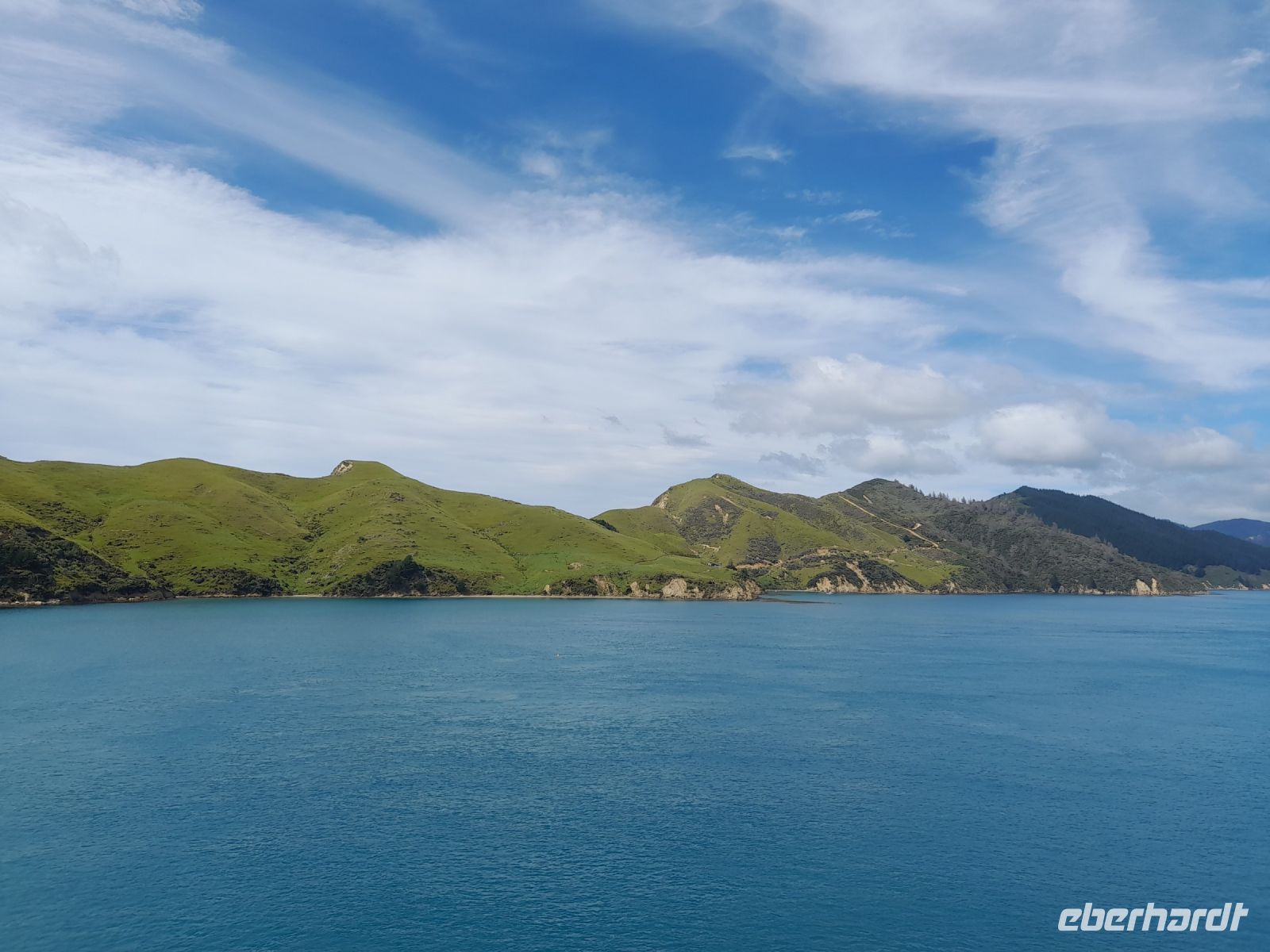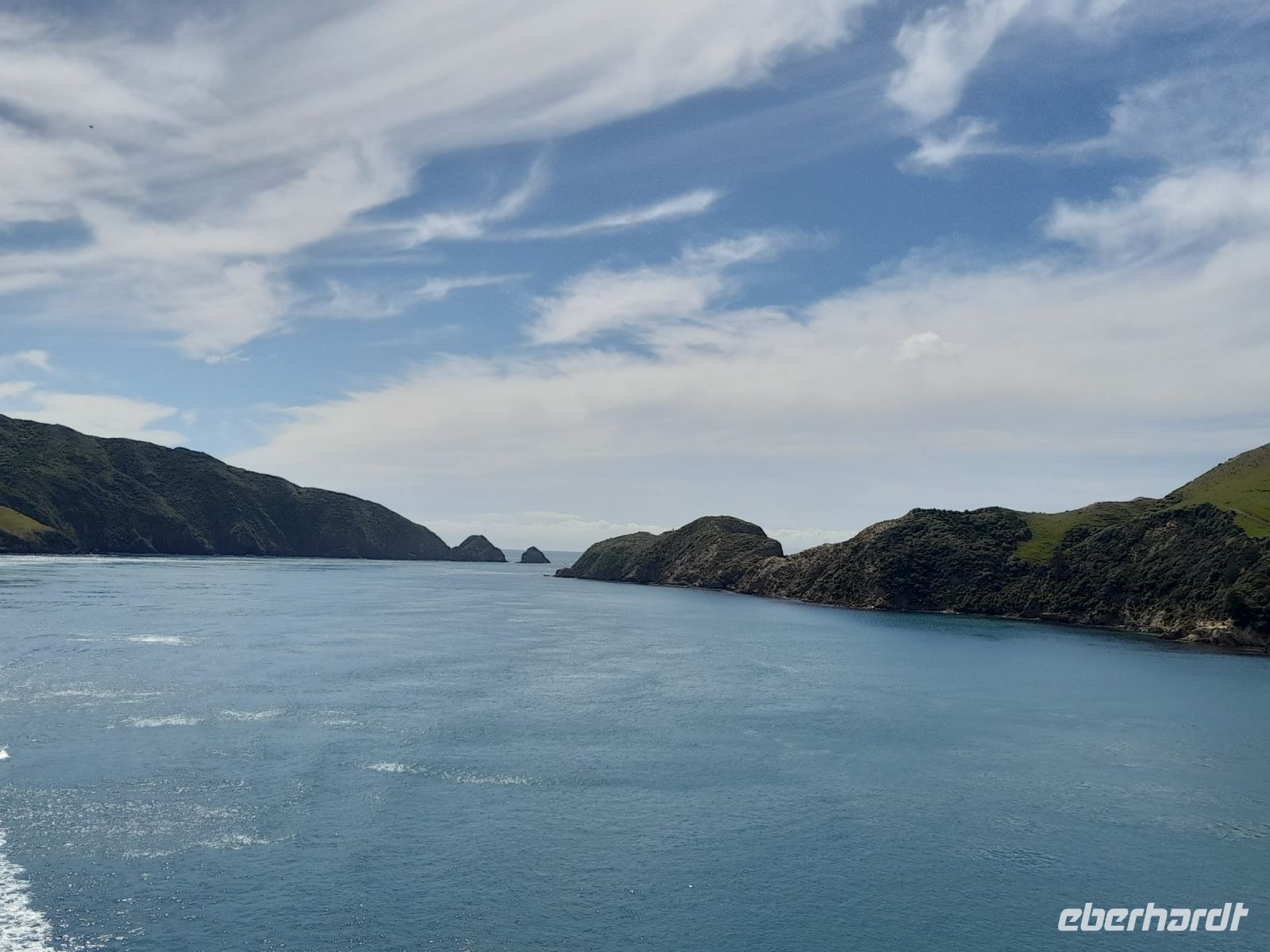 Zu früher Stunde geht es heute schon los in Richtung Fähre. Selbst das Frühstück wird dann erst an Bord der Interislandes eingenommen, aber das ist kein Problem, denn bei schönstem Wetter verspricht selbst die so berüchtigte Cook Straße heute freundlich zu uns zu sein. Wir genießen die dreieinhalbstündige Überfahrt in vollen Zügen. Vor allem die Einfahrt in den Queen Charlotte Sound und der Blick in die verschiedenen Einschnitte der Marlborough Sounds sind landschaftlich spektakulär und erinnern uns an Norwegen.