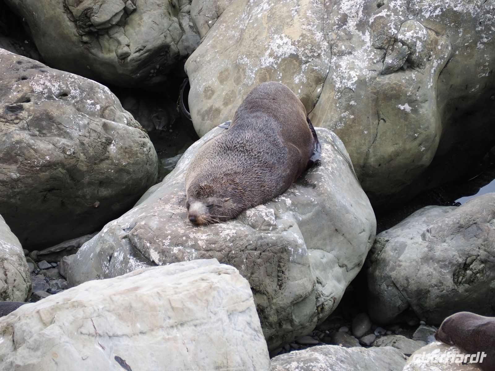 Unser Weg führt uns nun weiter entlang der Küste bis nach Kaikoura. Unterwegs begegnen wir einer riesigen Kolonie von Pelzrobben, die vor ein paar Tagen erst ihre Jungen zur Welt gebracht haben – wie niedlich. Wir beobachten die dahindösenden Muttertiere und die neugierigen Heuler eine Weile bevor wir weiterfahren. Kai-koura bedeutet übrigens Krebse essen in Maori – und das kann man hier tatsächlich gut, um jede Kurve herum entdeckt man eine neue Imbisshütte.