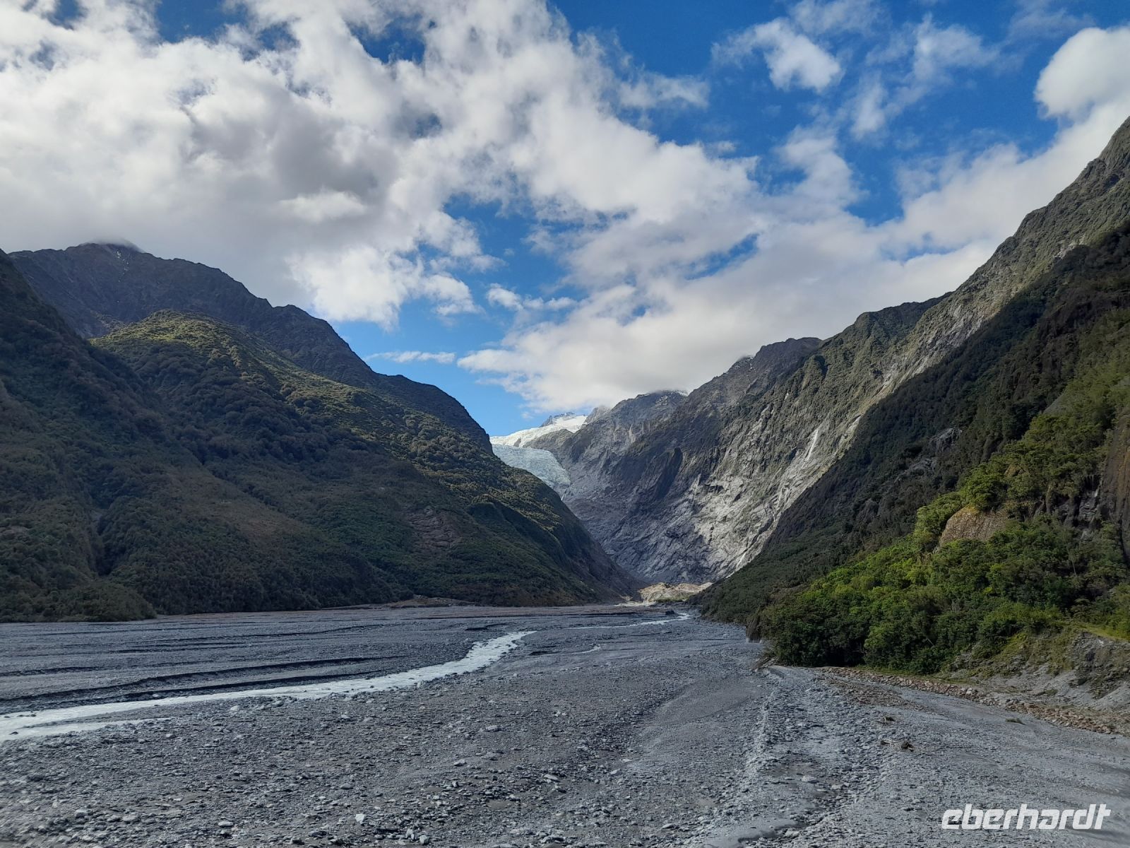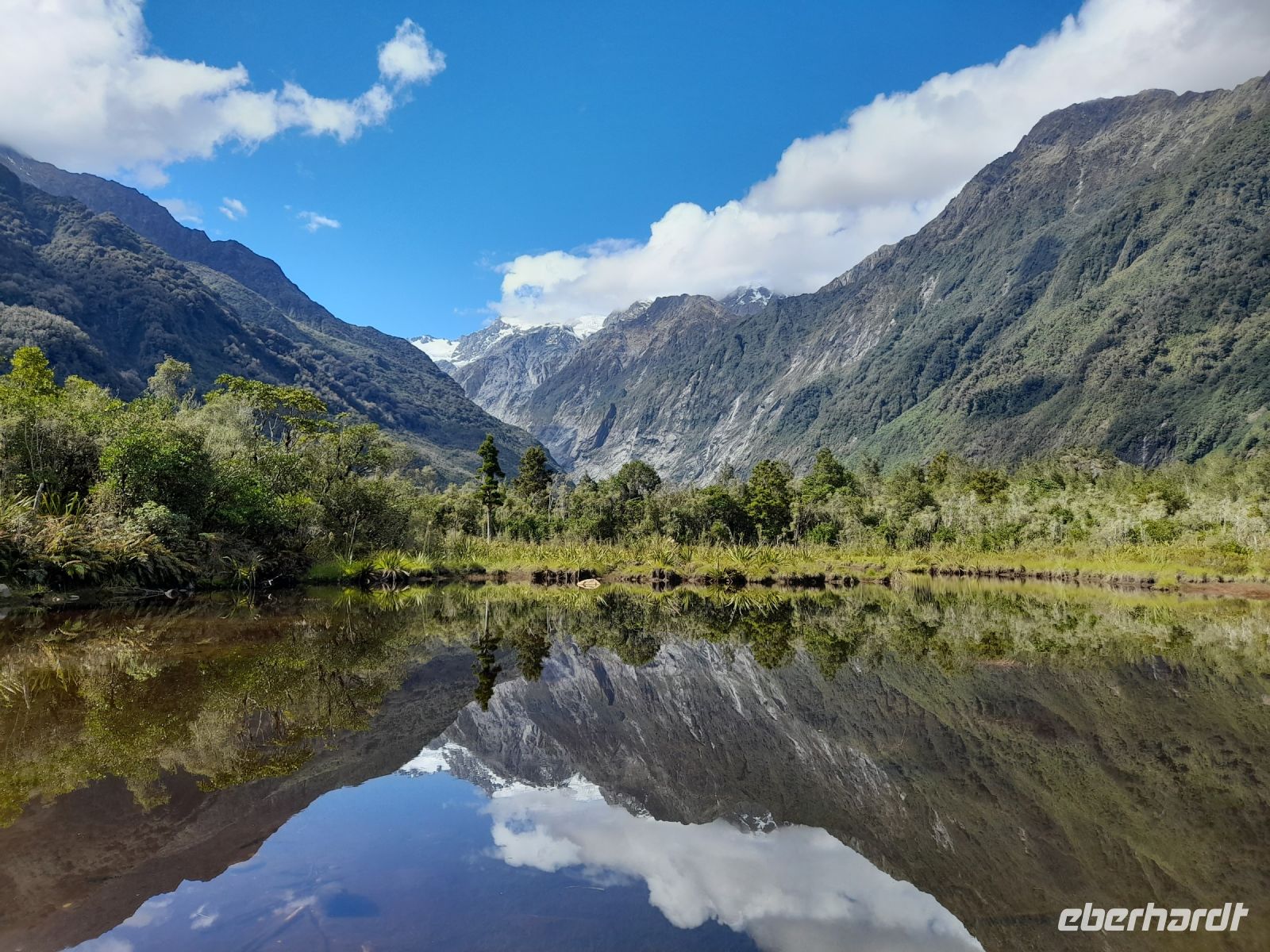 Für einige von uns geht es am nächsten Morgen schon früh hoch hinaus zum Helikopterflug zum Fox und Franz Josef Gletscher inklusive Landung im ewigen Eis. Der Rest darf ein wenig länger schlafen und fährt dann mit unserem Bus weiter in den nächsten Ort, Franz Josef Glacier. Im Zentrum sammeln wir unsere glücklichen Helikopterflieger ein und fahren dann gemeinsam zum Ausgangspunkt für einige größere und kleinere Wanderungen am Fuße des immerhin vom Tal sichtbaren Franz Josef Gletschers – doch auch hier lässt sich schnell feststellen, dass sich das Eis in den letzten Jahren beachtlich zurückgezogen hat. Nichtsdestotrotz genießen wir die kleinen Spaziergänge zu den verschiedenen Aussichtspunkten bei strahlendem Sonnenschein.