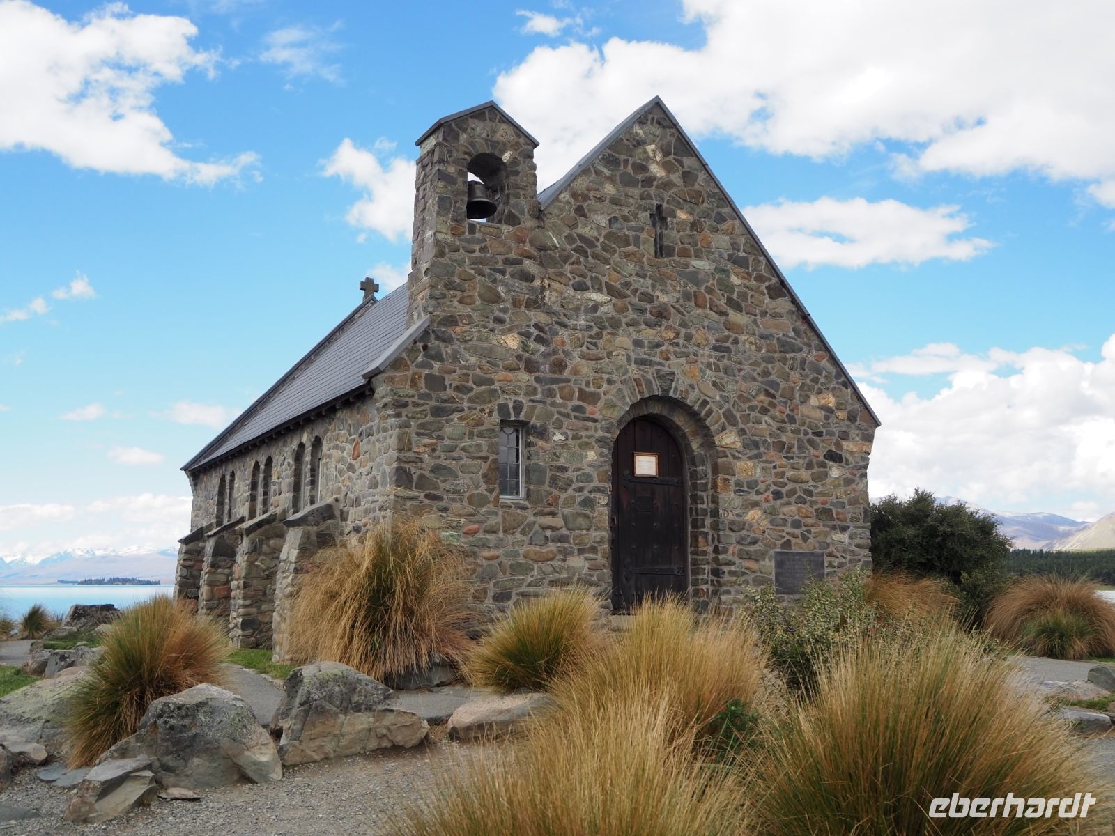 Von Geraldine aus ist es nicht mehr weit zu unserem Tagesziel: Tekapo mit dem gleichnamigen See. Der Gletschersee ist vor allem während der Lupinenblüte zwischen Ende November und Anfang Januar ein riesiger Magnet für Touristen und Fotografen. Auch wenn das Gewächs hier als Unkraut gilt und an vielen Orten streng bekämpft wird, müssen doch selbst die Kiwis zugeben, dass die lila-pinke Blütenpracht wirklich ein tolles Bild abgibt. Auch wir halten an der berühmten Kirche des guten Hirten und machen unsere obligatorischen Fotos.