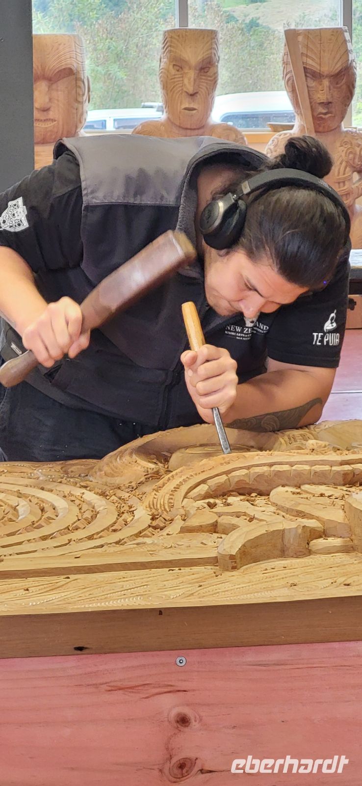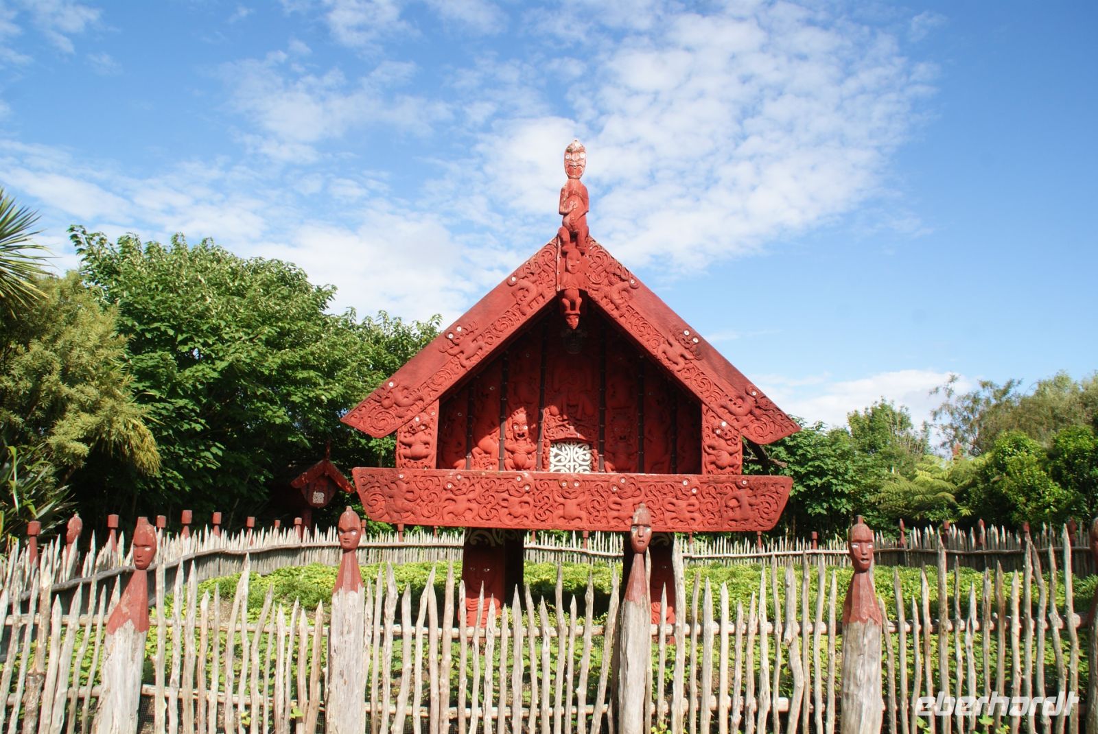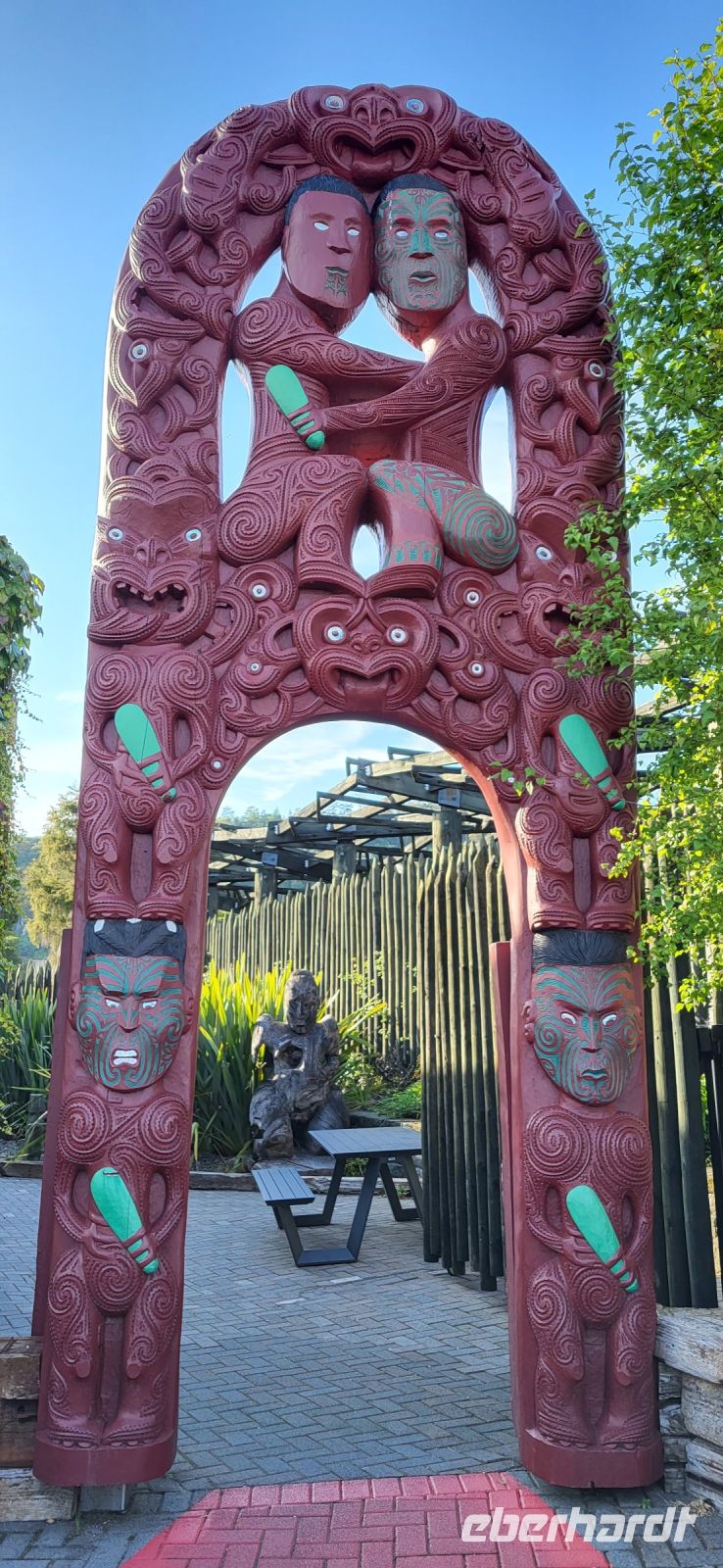 Nochmals herrlich übernachtet und im Hula Café vorzüglich gefrühstückt, werden wir von Motelbesitzer David herzlich verabschiedet und führen unsere Rundreise fort. Auf unserer Reiseroute werden wir wieder sehr informativ von Reiseleiter Martin unterhalten. Dieser erklärt uns die erste Begegnung von Kapitän Cook mit den Maori im Jahre 1769, als dieser mit Übersetzern aus Tahiti an Land ging, da diese eine ähnliche Sprache wie die Maori hatten. Er erklärt uns die Begrüßungsriten dieser und somit eine erste Einstimmung auf den heute Abend folgenden Maori Abend des Mitai Stammes. Wir sind gespannt, was uns dort erwartet, wenn uns Bräuche, Gesänge, Tänze und traditionelle Speisen näher gebracht werden. In Waihi erfolgt ein kurzer Stopp und wir haben die Gelegenheit die riesiger Martha Mine anzusehen, wo einst und noch Gold und Silber abgebaut werden. Mittags erreichen wir das Filmset von Hobbiton, wo die gebuchten Gäste eine 2-stündige Führung erleben und per Transport zum Tagesziel nach Rotorua, der Thermalstadt, gebracht werden. Die anderen Gäste bleiben bei Martin und mir und fahren zu einer Kiwi Aufzuchtstation, wo viel Wissenswertes zum Nationalvogel Neuseelands vermittelt wird. Vom nachtaktiven Kiwi gab es einst mehrere Millionen, dessen Population heute auf 60.-70.000 Tiere reduziert ist. Bedroht sind die flugunfähigen Vögel durch mit den Siedlern eingeführte Tiere wie Hunde, Katzen, Schweine, Igel, Wiesel und Opossums, die entweder die Eier oder die Vögel selbst rauben. Da in freier Natur nur ca. 5% der Jungtiere überleben, entschied man sich für eine Aufzuchtstation, um somit einen Zuwachs der Population zu bewirken. Das ganze Projekt finanziert sich durch Eintrittsgelder und Spenden, denn auf diesem Weg konnten bereits 2000 der bis zu 50 Jahre alt werdenden Tiere aufgezogen und wieder ausgewildert werden. Abends fahren die meisten von uns zu Mitai Maori Village, um am kulturellen Abend teilzunehmen. Hier sehen wir den Nachbau eines ehemaligen Maori Dorfes, mit Sitten und Gebräuchen, Musik und Tanz, sowie dem beeindruckenden Haka. Der Haka ist ein uralter Kriegstanz der Maori, der traditionellerweise auf dem Schlachtfeld wie auch beim friedlichen Zusammentreffen verschiedener Gruppen getanzt wurde. Im Anschluss findet das Abendessen statt, bei dem neben Huhn und Lamm, Kumara (Süßkartoffeln), etc. serviert werden.
