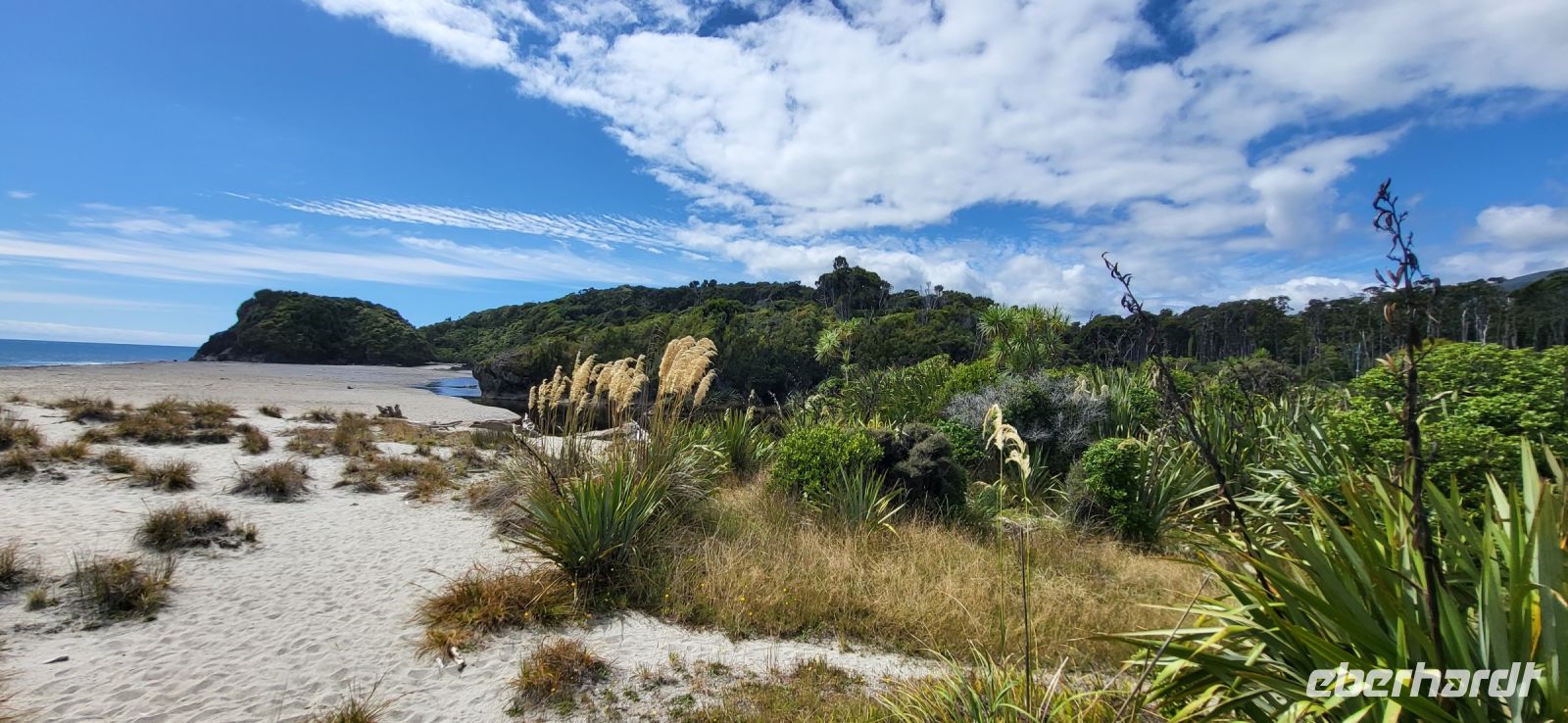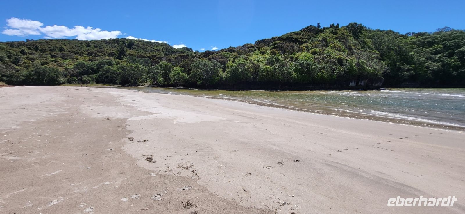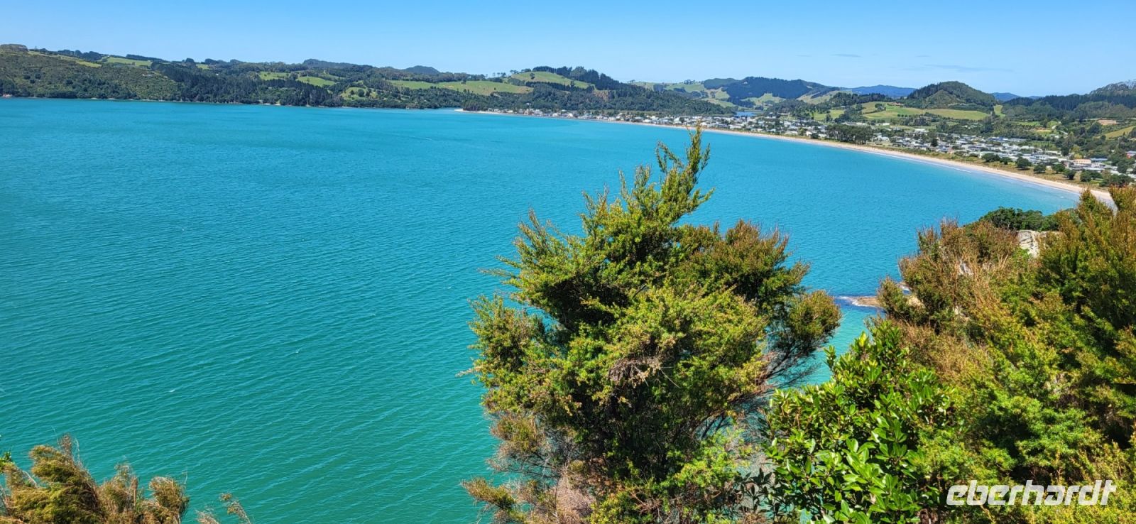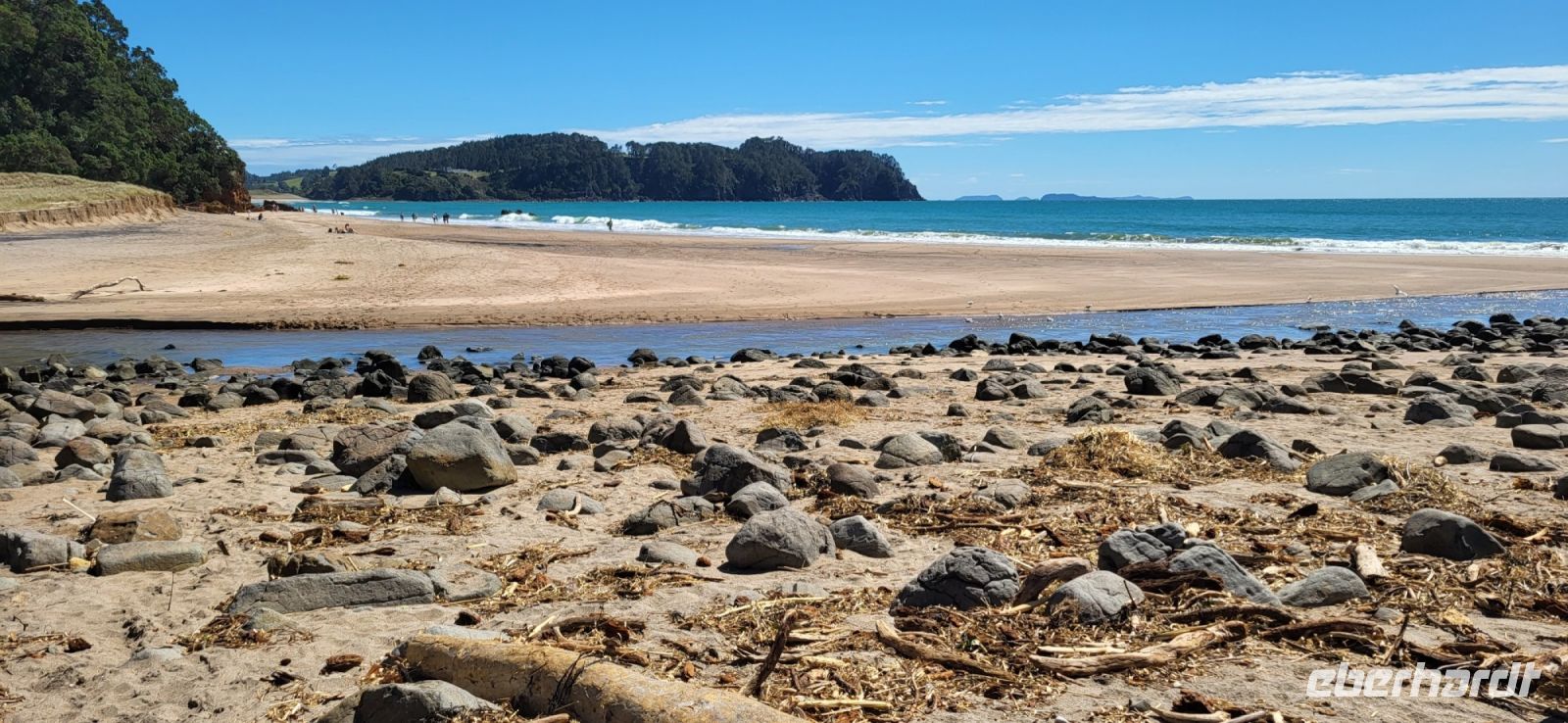 Nach einem schönen Frühstück im Hula Café starten wir heute Morgen zum Hot Water Beach. Hier gelangt bei Ebbe Thermalwasser an die Oberfläche und man kann seine eigene Badewanne schaufeln, indem das heiße Wasser aus dem Boden strömt und man es mit kühlem Meerwasser zur passenden Temperatur mischt. Bei perfekten Bedingungen wird dieser Strandabschnitt zum dicht besiedelten „Sandkasten“ Neuseelands. Da wir zur perfekten Zeit eintreffen, haben sich bereits einige Touristen entsprechende Badewannen kreiert und auch wir beginnen kräftig zu schaufeln-und es funktioniert. Noch ein schöner Strandspaziergang entlang des Südpazifiks bei blauem Himmel und Sonnenschein und wir fahren zum Mittagsstopp ins schönen Colenso Café. Dieses liegt herrlich in der Natur und einer Gartenanlage, in der wir Kaffee und Kuchen mehr als genießen. Anschließend geht es weiter zur Cathedral Cove. Dieser Bereich ist jedoch leider durch die Unwetter der vergangenen Tage so arg in Mitleidenschaft gezogen, dass die Straße dorthin und auch der Spazierweg gesperrt wurden. Also Plan B- Cooks Beach und Shakespeare Cliff Lookout. Zwei herrliche Orte, wo wir nochmals einen malerischen Blick auf das vor-und unter uns liegende Meer sowie die vorgelagerte Bucht haben. Für den Rückweg entscheiden wir uns die Fähre nach Whitianga zu nehmen, die uns in nur fünf Minuten zurück zum anderen Ufer bringt, sodass jeder den restlichen Tag nach freiem Gusto genießen kann.