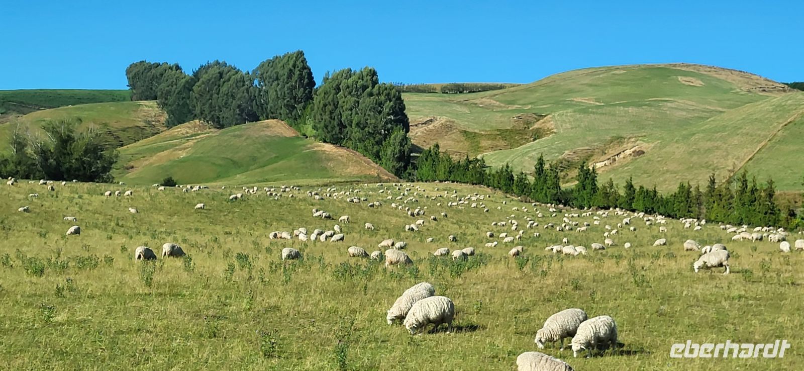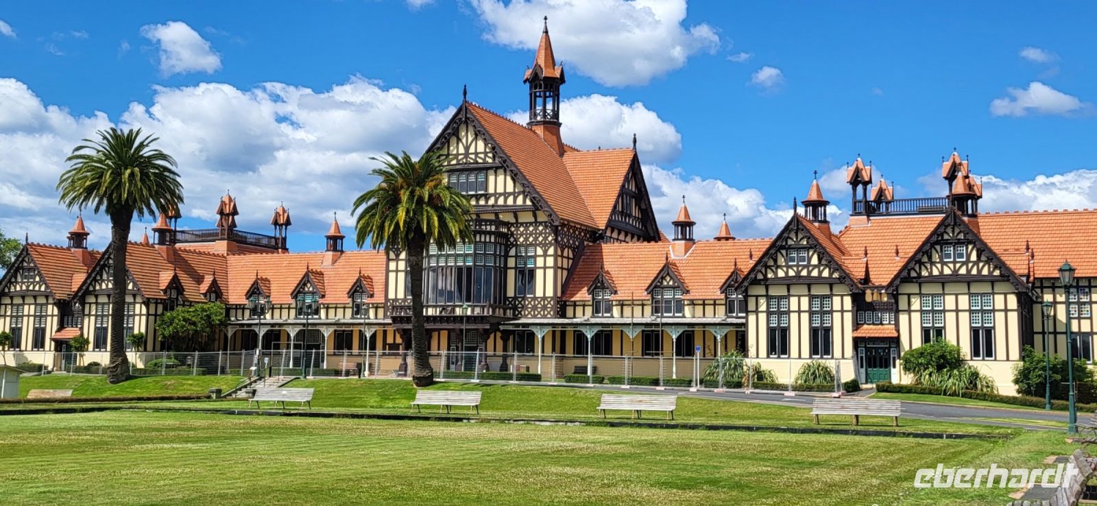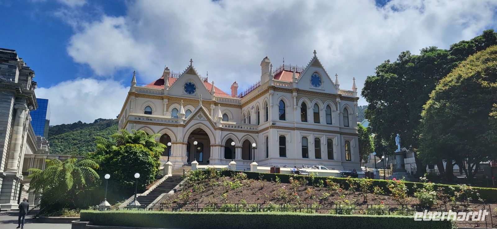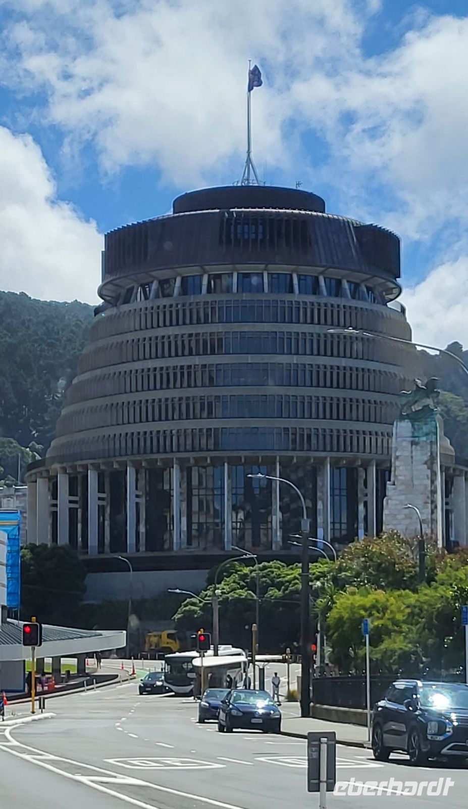 Heute heißt es-Auf in die windigste Stadt Neuseelands … Richtung Neuseelands Hauptstadt Wellington passieren wir so manch kuriosen Ort, wie beispielsweise Taihape, der als Wahrzeichen einen Gummistiefel hat und hier alljährlich das Gummistiefelweitwerfen stattfindet. Der aktuelle Rekord liegt momentan wohl bei 65 m. Natürlich müssen wir es ebenfalls ausprobieren und schlagen uns gar nicht so schlecht. Weiter passieren wir den Ort „Bulls“, der nach Joseph Bulls benannt wurde und wo die landesweit größte Molkerei ansässig ist. Somit wohl der einzige Platz Neuseelands, wo man vom Bullen Milch bekommt. Vom Mülleimer bis hin zur Polizeistation findet sich stets das Thema Rindvieh wieder … Unser Mittagsstopp erfolgt in Foxton, dessen Wahrzeichen, eine Windmühle, in Ortsmitte thront, da sich hier in der niederländisch, flachen Gegend so manche Holländer angesiedelt haben. Unterhaltsam geht die Fahrt weiter. Wir hören, dass unser Tagesziel Wellington nicht auch als „die windige Stadt“ bekannt ist, hier selbst der Radiosender „Radio Windy“ heißt. Es befinden sich hier sämtliche Ämter, das Parlament, welches aufgrund seines Designs scherzhaft „Bienenkorb“ genannt wird, der Hafen und auch ein recht waghalsiger Flughafen mit kurzer Landebahn. Benannt wurde die Hauptstadt nach dem Duke von Wellington, der bekannt für seine Gummigamaschen und somit der Erfinder des Gummistiefels war. So wurden die ersten Schuhe dieser Art auch „Wellingtons“ genannt. Nach unserer Ankunft und einer orientierenden Stadtrundfahrt genießen wir zunächst die Aussicht vom Mount Victoria, welcher sich in 196 m Höhe befindet. Von hier haben wir einen tollen 360° Ausblick über die um uns herum liegende Bucht und können somit die Dimensionen so richtig begreifen. Auf unserer Stadtrundfahrt sehen wir u.a. das Sky Stadium, den Hafen, den Hauptbahnhof, das Zollgebäude, das Bienenkorb-Parlament, den Obersten Gerichtshof, die Nationalbücherei mit Nationalarchiv. Vorbei an der neuen und alten St. Paul Cathedral fahren wir zu unserem Hotel und nach dem Check-in kann jeder noch den restlichen Nachmittag nach Lust und Laune die Stadt in Eigenregie erkunden. Am Abend finden wir uns zu einem köstlichen Buffet extra für uns Eberhardt Gäste im Hotel ein und schlemmen nach Lust und Laune.
