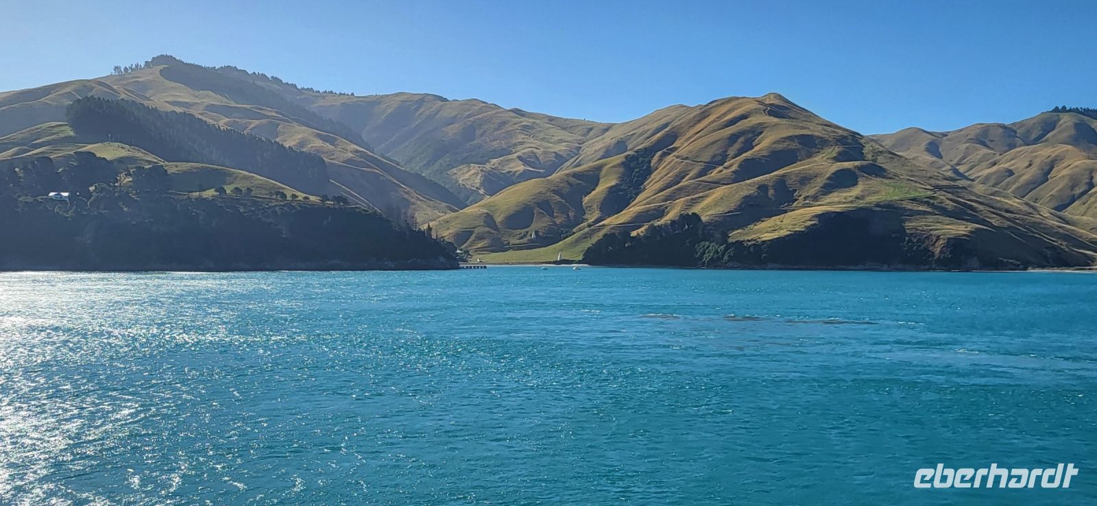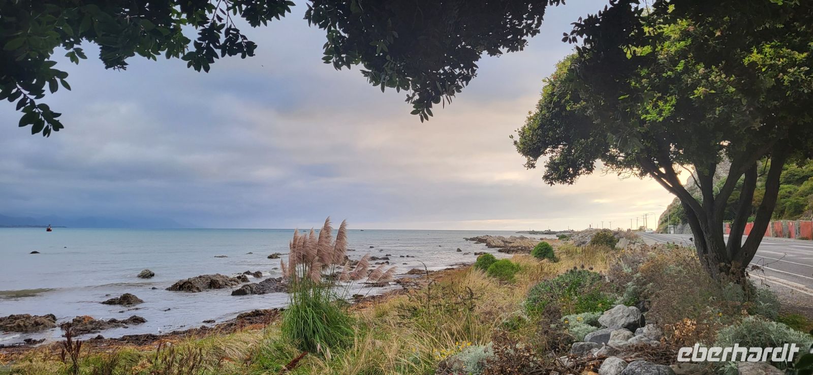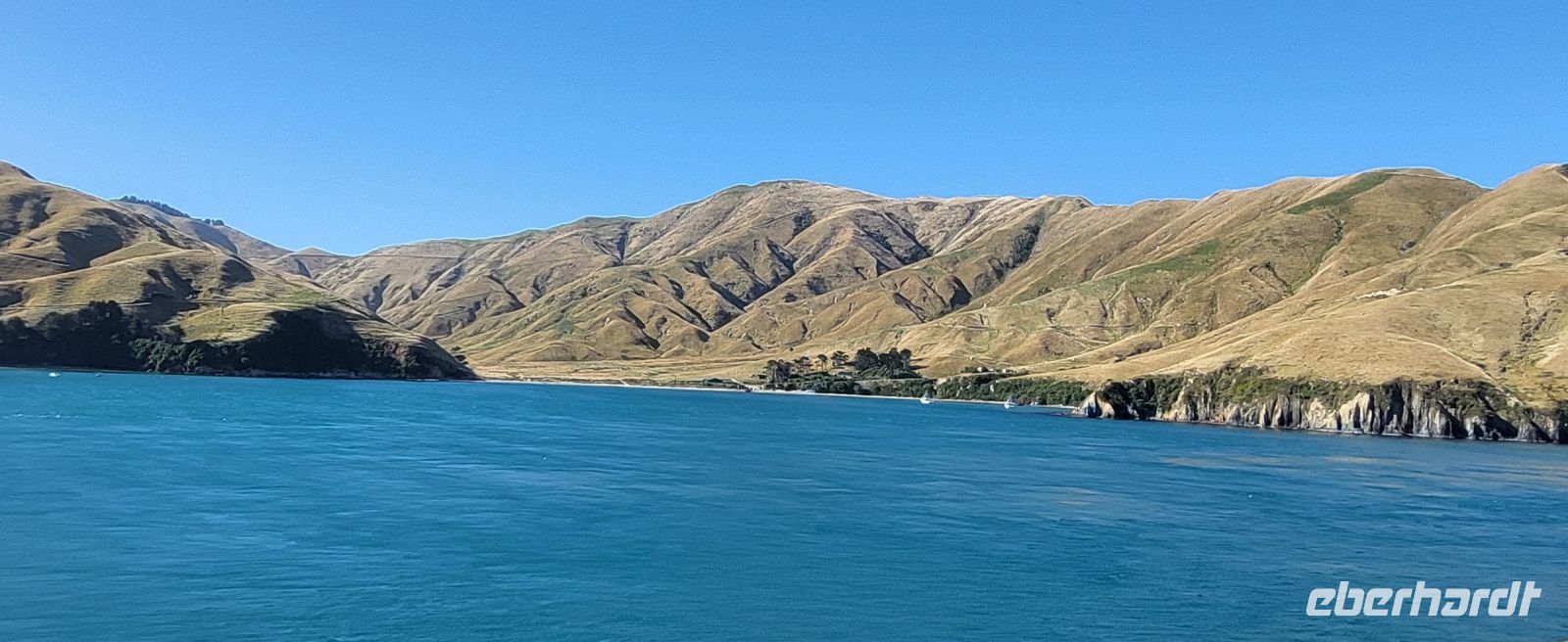 Es erreicht uns die Nachricht, dass heute unsere morgendliche Fähre leider gecancelt wurde und wir auf die Nachmittagsfähre umgebucht wurden. Somit haben wir noch die schöne Gelegenheit außerplanmäßig noch mehr Zeit in Wellington zu verbringen. Nach einem gemütlichen Frühstück, verladen des Gepäcks in unseren Bus, fährt uns Martin hoch zum Botanischen Garten, der den Besuchern sogar kostenlos zur Verfügung steht. Ein herrlich weitläufiges Areal führt uns durch traumhafte, üppige Natur und wir sind sehr erstaunt, eine solche Idylle so nah der Großstadt vorzufinden. Vom Baumhaus über Rosengarten, zum Begonienhaus und Kräutergarten, wird uns Gästen viel geboten. Über einen uralten Friedhof gelangen wir final wieder in die Stadt zurück und spazieren wieder zu unserem Hotel, von wo aus wir mit Martin zum Hafen fahren und unsere Überfahrt nach Picton/Südinsel starten. Es erfolgt eine Traumüberfahrt und wir können uns vor Fotomotiven nicht retten. Eine wunderbare Fjordlandschaft bei gutem Wetter und ruhiger See lässt uns schwärmen, dass wir so viel Glück haben. Nach Ankunft in Picton, dem nördlichen Hafen der Südinsel, geht es weiter Richtung Kaikoura. Wir passieren das Weinanbaugebiet Marlborough mit schier unzähligen Weinreben links und rechts unseres Weges. Wir hören, dass die Südinsel ca. 1,6 Millionen Bewohner hat, genauso wie die Stadt Auckland alleine. Im Gegensatz zur Nordinsel, die die zarte Insel genannt wird, spricht man von der Südinsel von der dramatischen Insel. Wir fahren weiter am Pazifik entlang, der auch ‚das stille Meer‘ genannt wird und erreichen am Abend unsere nächste Unterkunft, das Panorama Hotel. Wir sind sehr begeistert von der tollen Lage und Gemütlichkeit unserer Zimmer. So schlafen wir hier bestens bei Sternenhimmel, Blick aufs Meer und Meeresrauschen. Gerne würden wir noch länger bleiben …