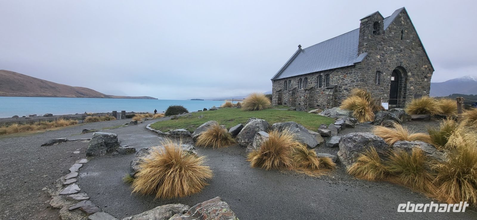 Petrus zeigt sich heute etwas verstimmt und so ist es zunächst vorbei mit blauem Himmel und Sonnenschein. Wolkenverhangen und regnerisch geht es weiter die Küste entlang nach Christchurch, wo wir unseren Driverguide Martin verabschieden müssen, mit dem wir sehr gerne die letzten acht Tage verbracht haben. Ab heute werden wir von Rheinländer Klaus betreut, der uns nach unserer Mittagspause abholt und weiter Richtung Süden führt. In sehr engagierten Vorträgen erfahren wir von ihm viel über geschichtliche Zusammenhänge, Maorikultur und der sich verändernden Landwirtschaft Neuseelands. Während unserer Fahrt ändert sich die Landschaft, gefühlt von Allgäu bis zur Tundra. Wir passieren die Kleinstadt Geraldine, wo wir Käsespezialitäten kosten und auf einen Kaffee einkehren. Weiter passieren wir die Mc Kenzie Country Region mit tollem Ausblick auf die Südalpen, auf deren Wipfeln es frisch geschneit hat. Hier stehen ca. 10 Exemplare der Berge über 3000 m und unzählige 2000 m hohe Berge. Am Lake Tekapo erfolgt ein kleiner Spaziergang zum Denkmal des berühmten Hirtenhundes sowie zur Kirche des guten Hirten mit herrlicher Kulisse auf den Gletschersee und umliegende Gebirgskette. Den abwechslungsreichen Tag schließt ein schmackhaftes Abendessen in unserem Peppers Bluewater Hotel ab.