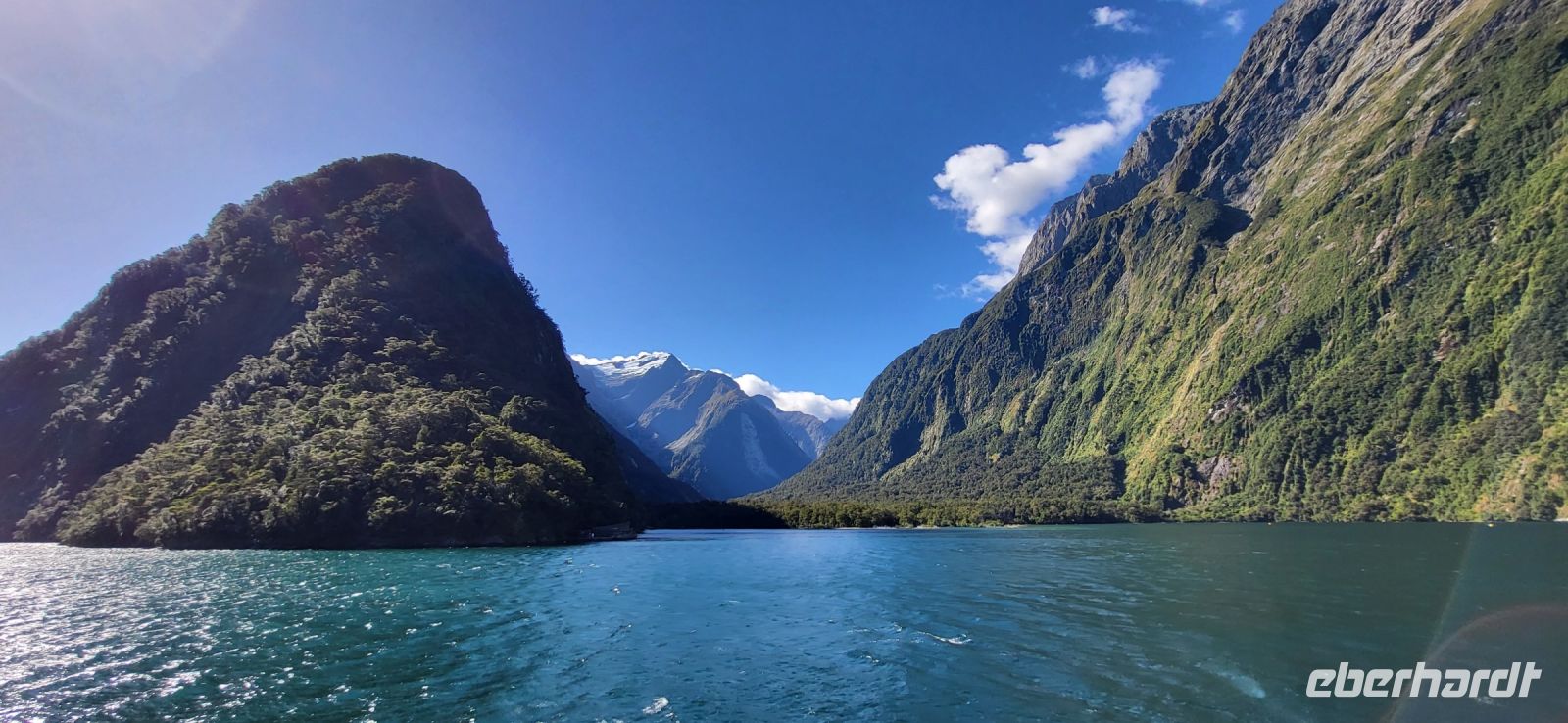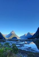 Der heutige Reisetag führt uns an die Westküste und somit in die Fjordregion der Südinsel. Die Fahrt dorthin erleben wir bei Traumwetter und wechselnder Landschaft, sodass auch dieser Weg wieder ein Genuss ist. Unser Tagesziel, der Milford Sound, liegt an der Westküste der Südinsel Neuseelands, welche mit nur 45.000 Einwohnern sehr dünn besiedelt ist. Der Fjord, 14 Km lang und ca. 300 m tief, wurde von seinem Entdecker John Grono im Jahre 1823 nach der walisischen Küste Milford Haven benannt. Einen ersten Halt machen wir im Farmversorgungsstädtchen Gore, wo wir uns ein wenig die Füße vertreten. Wie immer vergeht die Fahrt sehr informativ und so bringt uns Klaus viel Wissenswertes über das Leben in Neuseeland näher. Entlang unserer Strecke sieht man auch neben vielen Schafen und Rindern, Wildfarmen mit Rotwild. Diese fressen so gehalten lediglich Gras und verlieren somit ihren intensiven Wildgeschmack, der auf der natürlichen Ernährung beruht, indem sie auch Blätter und Rinden, was ein Wald eben sonst noch bietet, verspeisen. Unsere Mittagspause erfolgt in Te Anau mit gleichnamigem See, was übersetzt so viel wie „Meer der Tränen“ bedeutet. Von hier aus geht es in den Nationalpark, wo wir am Eglinton Valley an einem Drehort zu Herr der Ringe halten, wo einst einige Schlachtszenen gedreht wurden. Die riesige Ebene umrahmt von Bergen lässt uns im Kino Gesehenes wieder aufleben. Anschließend halten wir noch am sogenannten Spiegelsee und es entstehen herrliche Landschaftsaufnahmen. Pünktlich erreichen wir die Anlagestelle, an der die Milford Mariner bereits auf uns wartet. Mit weiteren Reisegästen sind wir 50 Personen, die nun das Schiff exklusiv für sich haben und die Reise kann beginnen. Wir fahren in den Fjord hinein zu einem sehr imposanten Wasserfall, an dem wir erst mal eine Schiffstaufe erleben. In einer ruhigen Bucht ankernd, dürfen wir zu Wasser. Sei es zu einer geführten Kajaktour oder in einem der beiden Beiboote um uns die nähere Umgebung anzuschauen. Wer das nicht möchte, genießt einfach die traumhafte Kulisse an Deck, das herrliche Wetter, es fühlt sich an, als hätten wir das Schiff jetzt für uns komplett alleine. Am Abend erhalten wir ein reichhaltiges Buffet und mit viel Humor informiert uns die Crew über Ablauf und Speisen. Abschließend können wir noch an einem Diavortrag teilnehmen, wo schöne Impressionen über den Fjord, Flora und Fauna gezeigt und erklärt werden. Eine herrliche Nacht verbringen wir ohne jeglichen Seegang, lediglich das plätschernde Wasser um uns herum erinnert daran, dass wir uns zu Wasser befinden und so mancher beobachtet dazu noch den grandiosen Sternenhimmel.