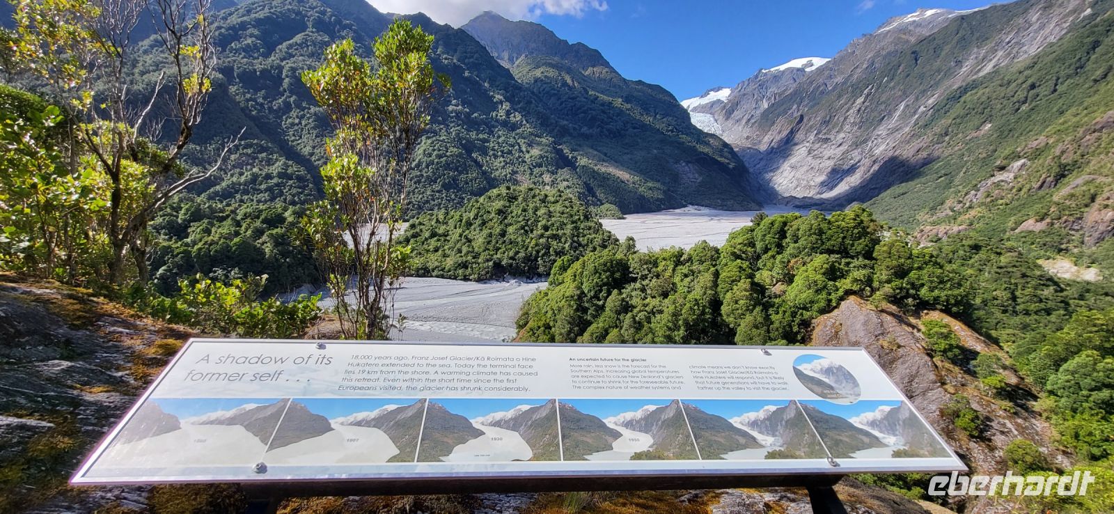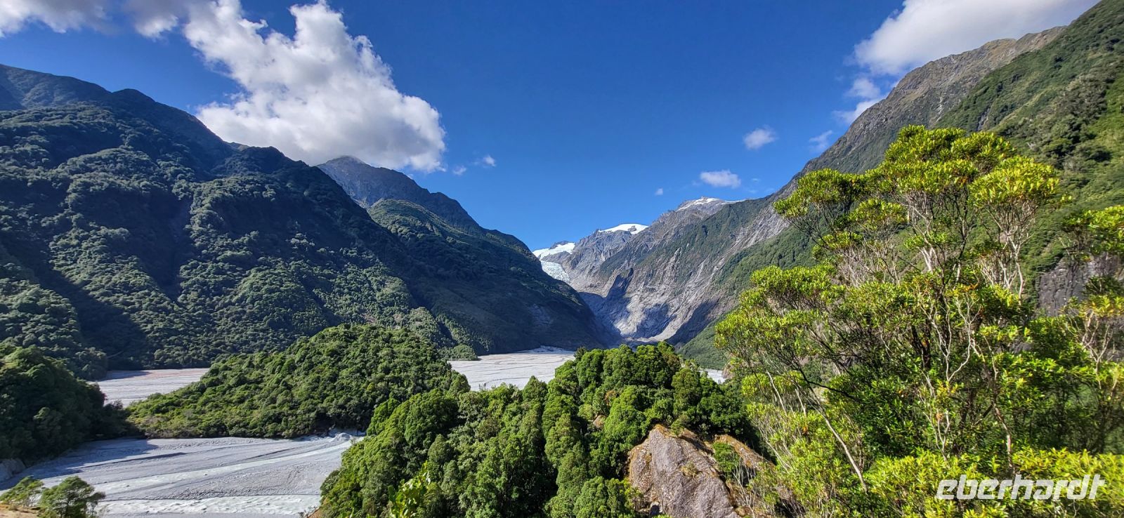 Unser erster Halt des heutigen Tages führt uns in das historische Goldgräberstädtchen Arrowtown. Da wir bereits zur frühen Stunde im Ort sind, erleben wir die unter Denkmalschutz stehende Hauptstraße noch menschenleer. Es gibt viele schöne Läden anzuschauen, die sich in historischen Bauten von 1860 befinden und einen guten Eindruck vermitteln, wie es hier einst in Zeiten des Goldrausches ausgesehen hat. Auf unserer Fahrt zum Tagesziel Fox, halten wir für viele schöne Fotomotive und tolle Aussichten wie beispielsweise die beeindruckenden Seen Lake Wanaka und Lake Hawea. Beide Seen sind nur durch einen schmalen Landstreifen voneinander getrennt. Nach einer Mittagspause im Makarora Country Café fahren wir den Haast Pass entlang und befinden uns bald auf 580 m Höhe und nach dessen Überquerung und Passieren des Haast Flusses wechseln wir zur Westcoast, die auch Nass-oder Regenbogenküste genannt wird. Wie auch schon die Tage zuvor ist von Regen keine Spur und es herrscht Bilderbuchwetter. Klaus berichtet, dass die Westküste die am wenigsten besiedelte Region Neuseelands ist und deren Bewohner (Coaster genannt) als besonders hartgesotten gelten. Hier lebt man vom Kohle-und Jadeabbau sowie Fischfang. Es umgibt uns eine unwirkliche Natur, Berge um uns herum, die alle von oben bis unten komplett bewaldet sind. Der Wasserfall „ Thunder Creek Falls“ lädt zum Fotostopp ein und bei einem anschließenden kleinen Spaziergang landen wir direkt am Meer mit Blick auf die Tasmanische See. Die Reise führt uns weiter vorbei an den beiden Zwillingsgletschern Fox und Franz Josef, die noch jeweils zehn und sieben Km lang sind. Die jeweiligen Flüsse in Form von Gletscherwasser sehen wir entlang unserer Strecke und diese fließen in den sogenannten gemäßigten Regenwald. Am Nachmittag erreichen wir das verschlafene Örtchen Fox, in dem sich alles rund um die Helikopterflüge zu den Gletschern dreht. All unsere Gäste haben heute das Glück, ihre gewünschten Heliflüge antreten zu können. Strahlende Gesichter kehren zurück von einem unvergesslichen Rundflug, inklusive Ausstieg auf dem Gletscher. So gibt es beim Abendessen einen schönen Austausch der heutigen Erlebnisse.