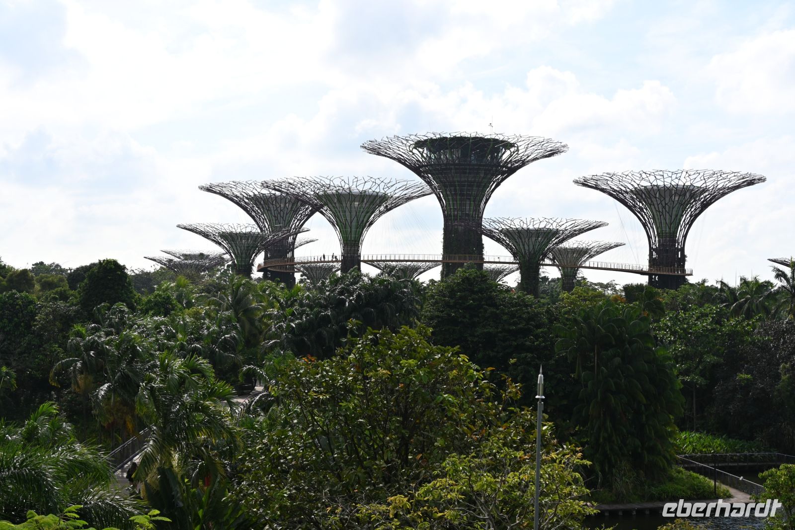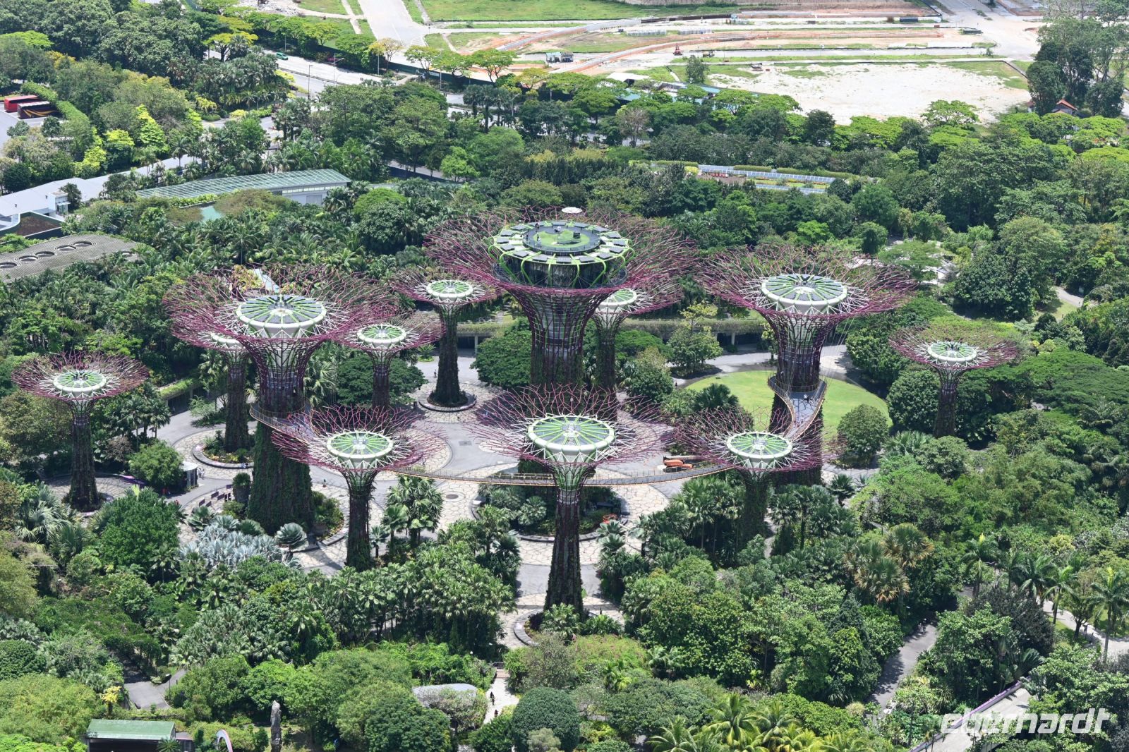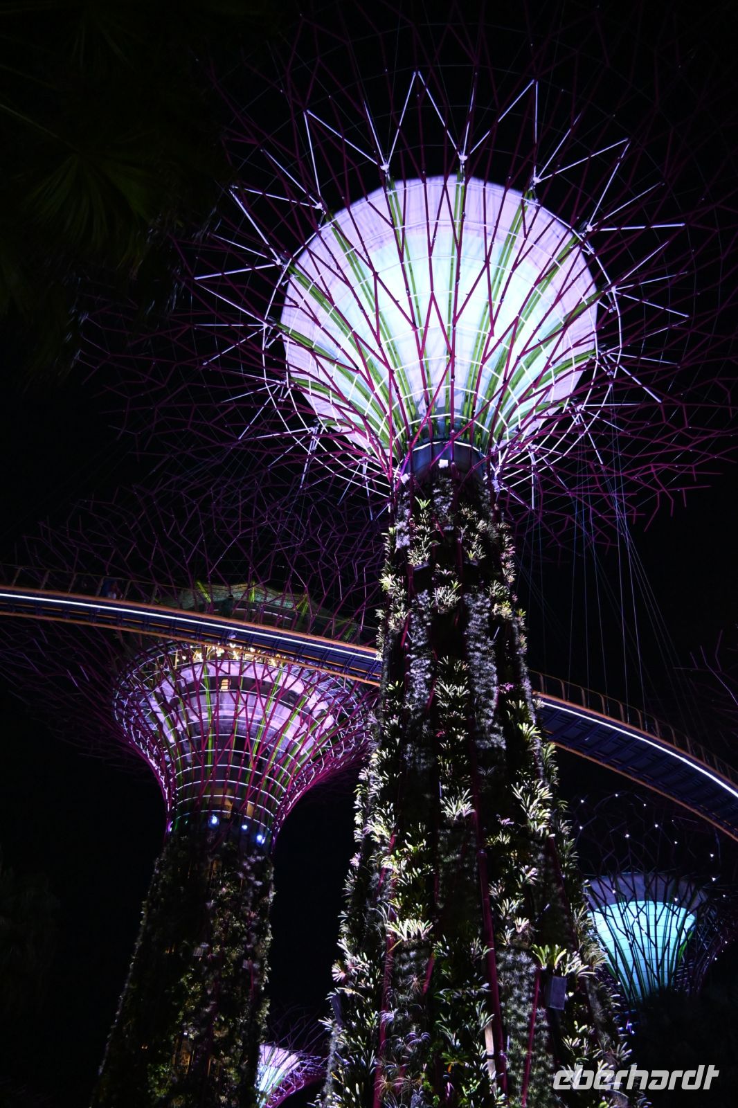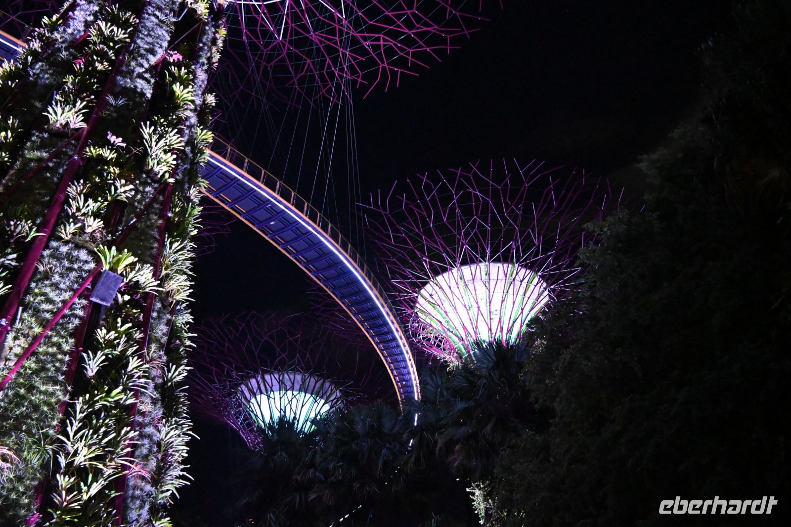 Unser Spaziergang führt uns zur Marina Bay, wo jeden Abend eine beeindruckende Licht- und Wassershow gezeigt wird. Das alles mit dem einzigartigen „Marina Bay Sands“ Hotel im Rücken, welches wir bisher nur aus dem Fernsehen kannten. Gleich im Anschluss nehmen wir den Weg durch das Einkaufszentrum, vorbei am Hotel, in die „Gardens by the Bay“ – also die Gärten an der Bucht. Ein faszinierender Park, welcher erst 2012 fertig gestellt wurde. Spektakulär sind vor allem die „Supertrees“. Diese 18 errichteten Bäume sehen nicht nur futuristisch aus, sondern haben noch einen nachhaltigen Nutzen. Das Wetter Singapurs wird hier voll ausgenutzt, die Bäume sammeln das Regenwasser, wandeln die Sonneneinstrahlung in Energie um und liefern den anliegenden Gewächshäusern frische Luft. Auch hier findet noch am Abend eine einzigartige Lichtershow statt. Zum Glück meint es das Wetter gut mit uns und wir können die Liegeflächen unter den Bäumen nutzen und die Lichter und Musik auf uns wirken lassen.