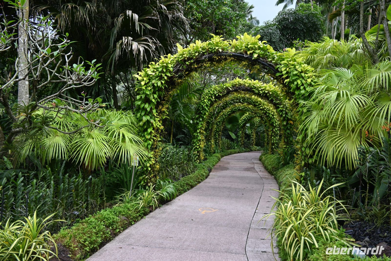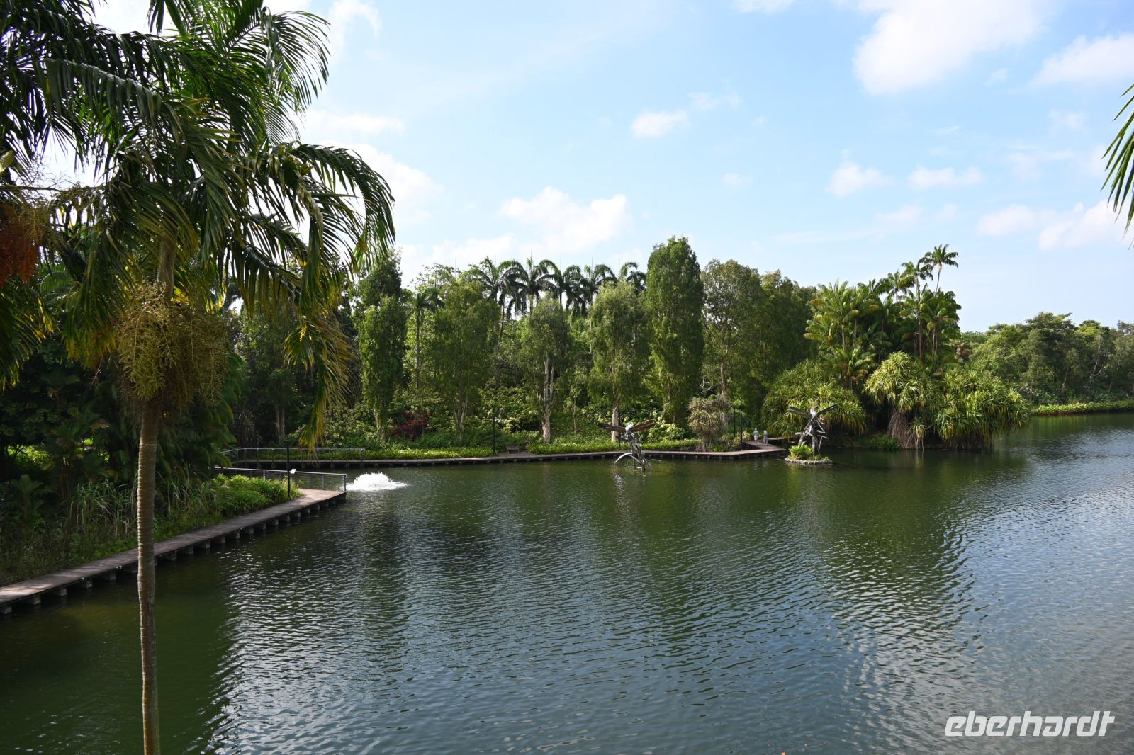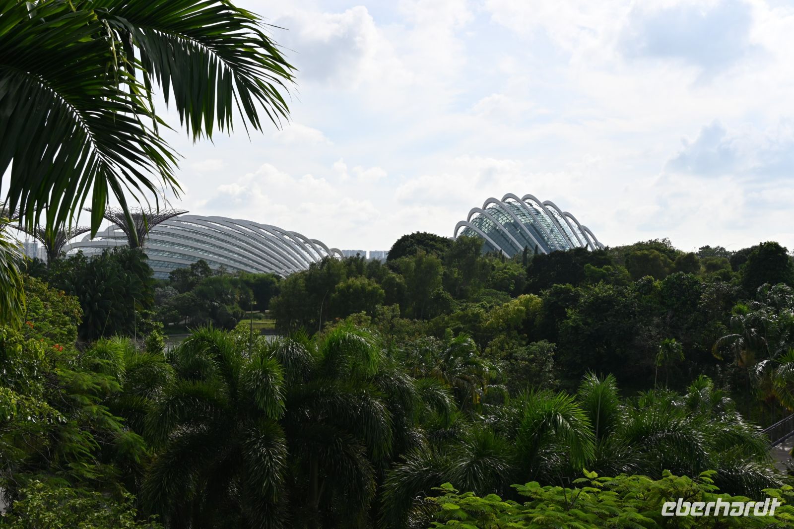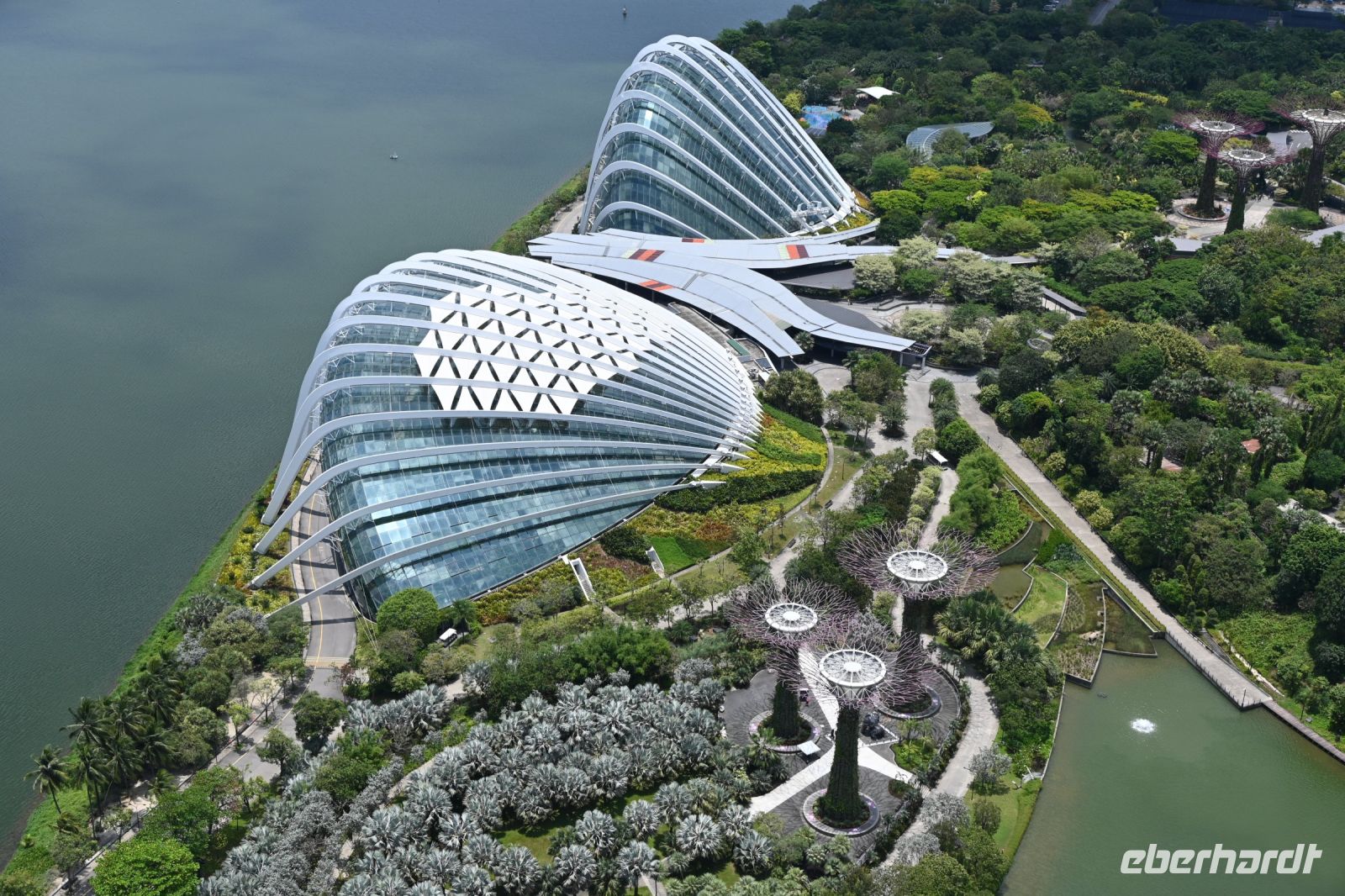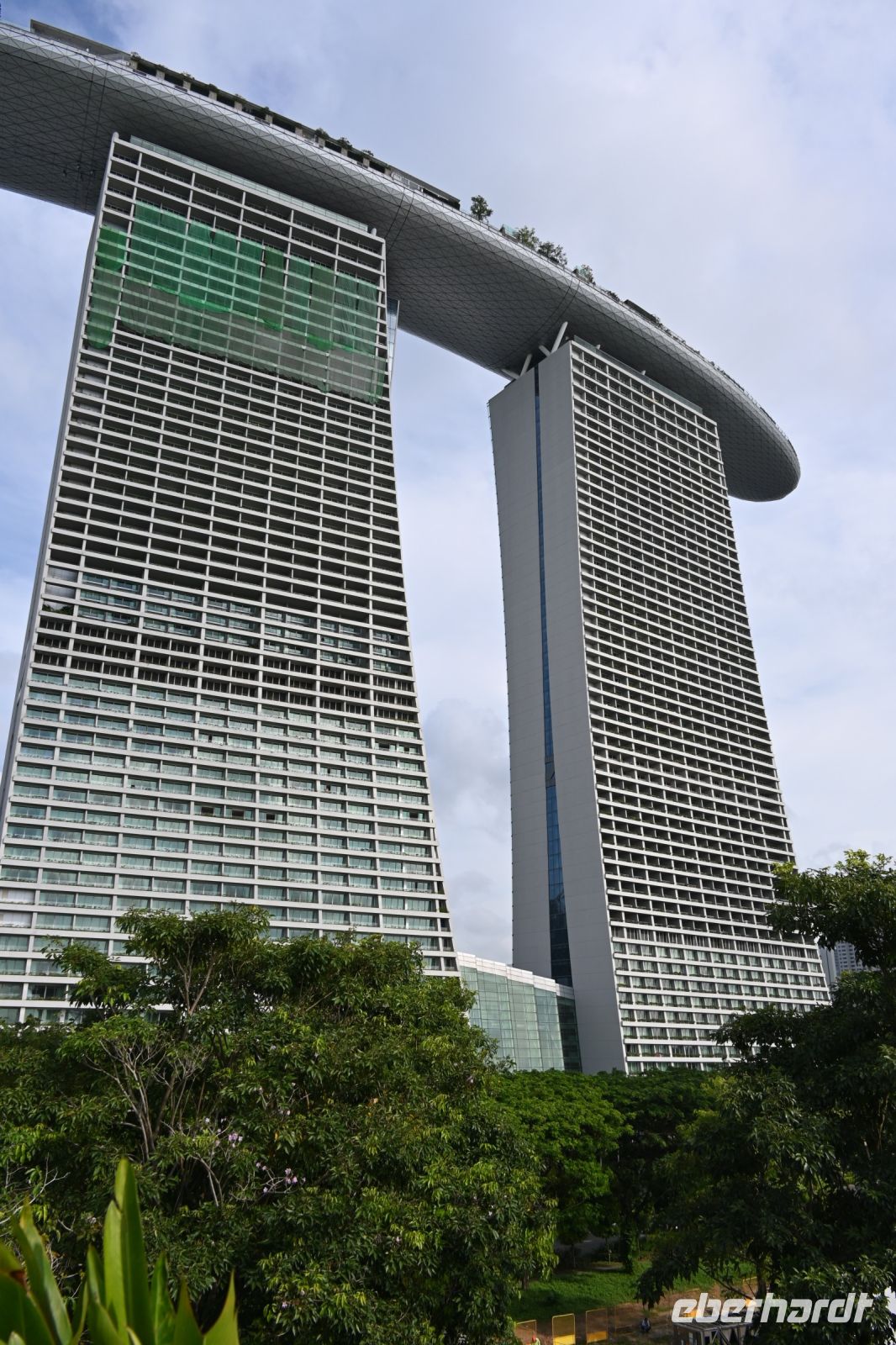 Unser Spaziergang führt uns zur Marina Bay, wo jeden Abend eine beeindruckende Licht- und Wassershow gezeigt wird. Das alles mit dem einzigartigen „Marina Bay Sands“ Hotel im Rücken, welches wir bisher nur aus dem Fernsehen kannten. Gleich im Anschluss nehmen wir den Weg durch das Einkaufszentrum, vorbei am Hotel, in die „Gardens by the Bay“ – also die Gärten an der Bucht. Ein faszinierender Park, welcher erst 2012 fertig gestellt wurde. Spektakulär sind vor allem die „Supertrees“. Diese 18 errichteten Bäume sehen nicht nur futuristisch aus, sondern haben noch einen nachhaltigen Nutzen. Das Wetter Singapurs wird hier voll ausgenutzt, die Bäume sammeln das Regenwasser, wandeln die Sonneneinstrahlung in Energie um und liefern den anliegenden Gewächshäusern frische Luft. Auch hier findet noch am Abend eine einzigartige Lichtershow statt. Zum Glück meint es das Wetter gut mit uns und wir können die Liegeflächen unter den Bäumen nutzen und die Lichter und Musik auf uns wirken lassen.