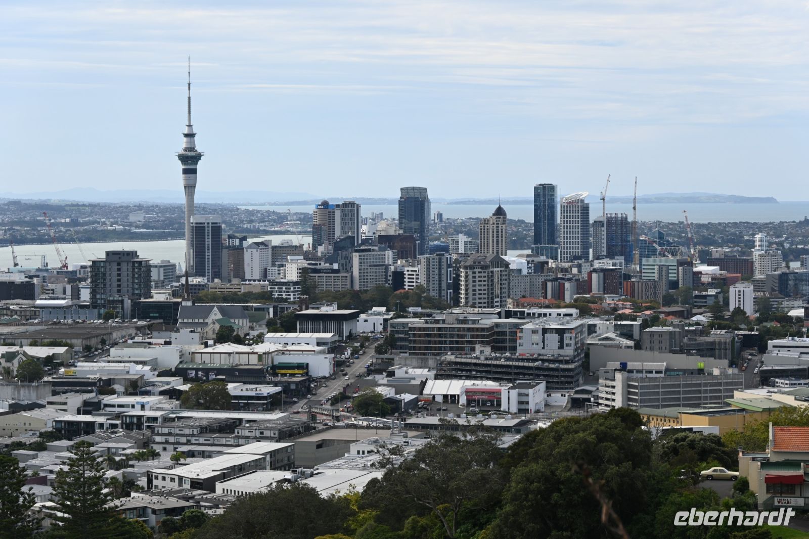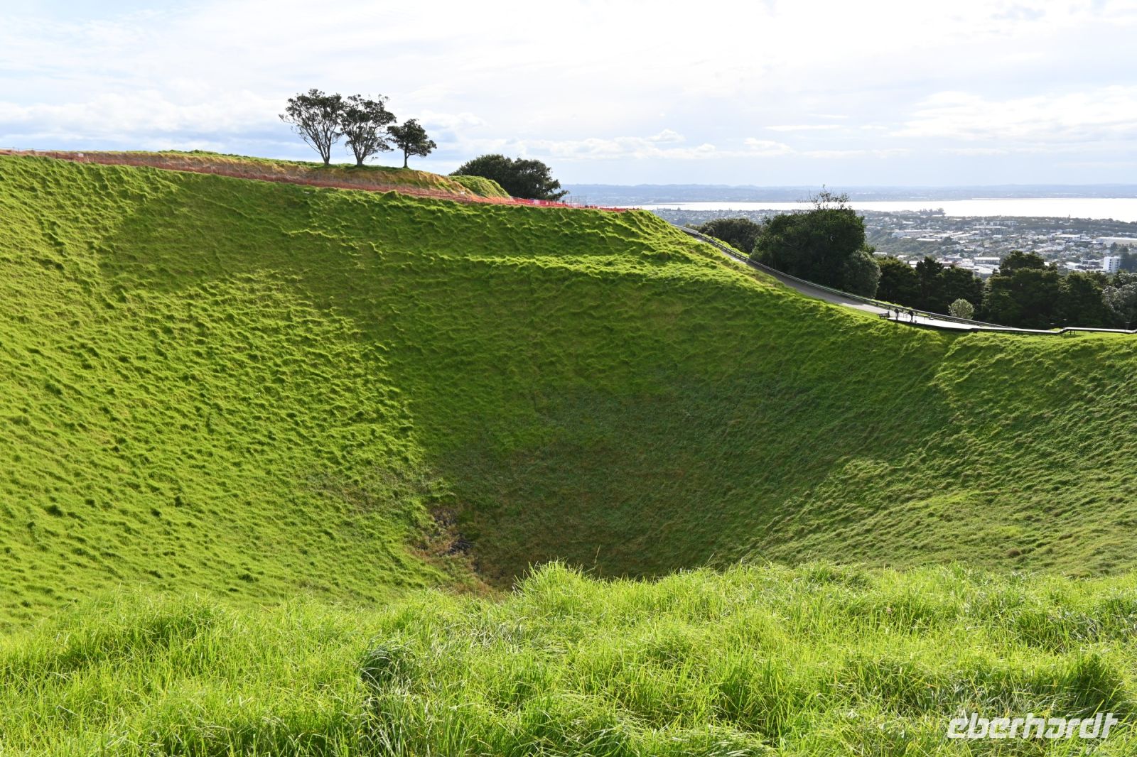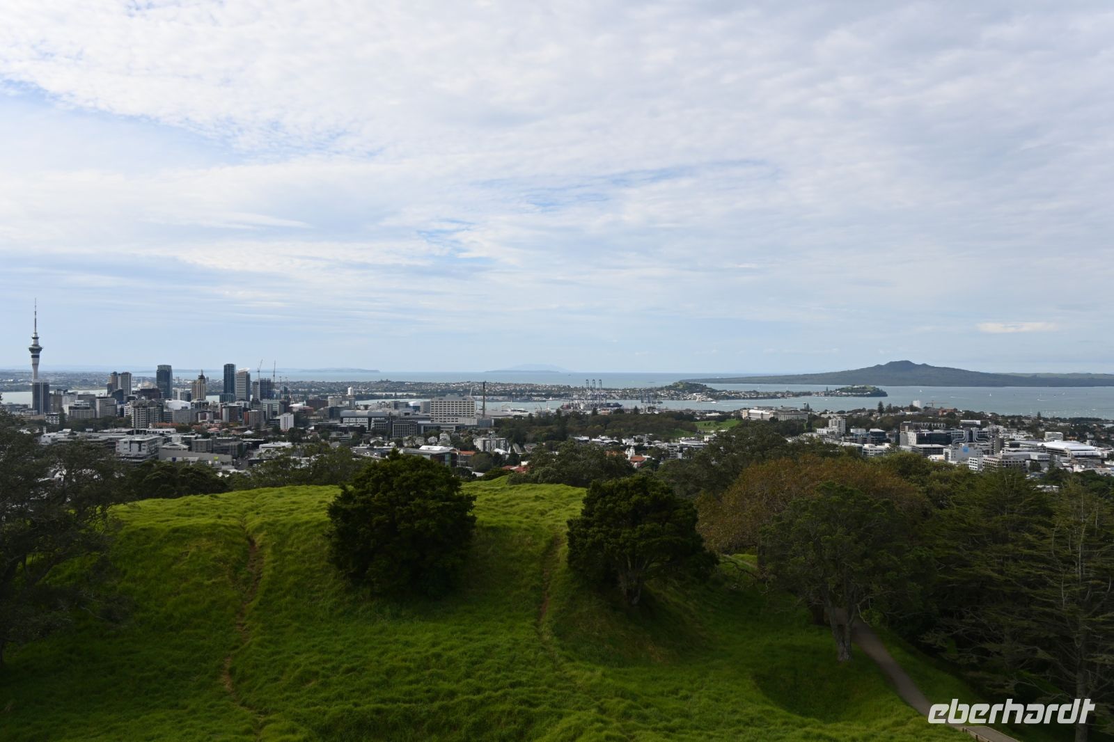 Es geht in die Innenstadt von Auckland. Um uns etwas die Beine zu vertreten und die schlechte Luft im Flieger zu vergessen, machen wir einen Stopp am Mt. Eden, einem ehemaligen Vulkan. Von hier oben hat man einen wundervollen Blick über Auckland. Aus dem Stadtbild sticht der Skytower klar heraus. Mit seinen 328 Metern Höhe ist er nur 40 Meter kleiner als der Berliner Fernsehturm. Auckland ist zwar nicht die Hauptstadt Neuseelands, aber mit seinen 1,6 Millionen Einwohnern bei Weitem die Größte. Das liegt vor Allem an der günstigen Lage am Meer und seinen zwei natürlichen Häfen. Die vielen Jachthäfen und Segelboote haben der Stadt auch ihren Namen, die „Stadt der Segel“, gegeben.