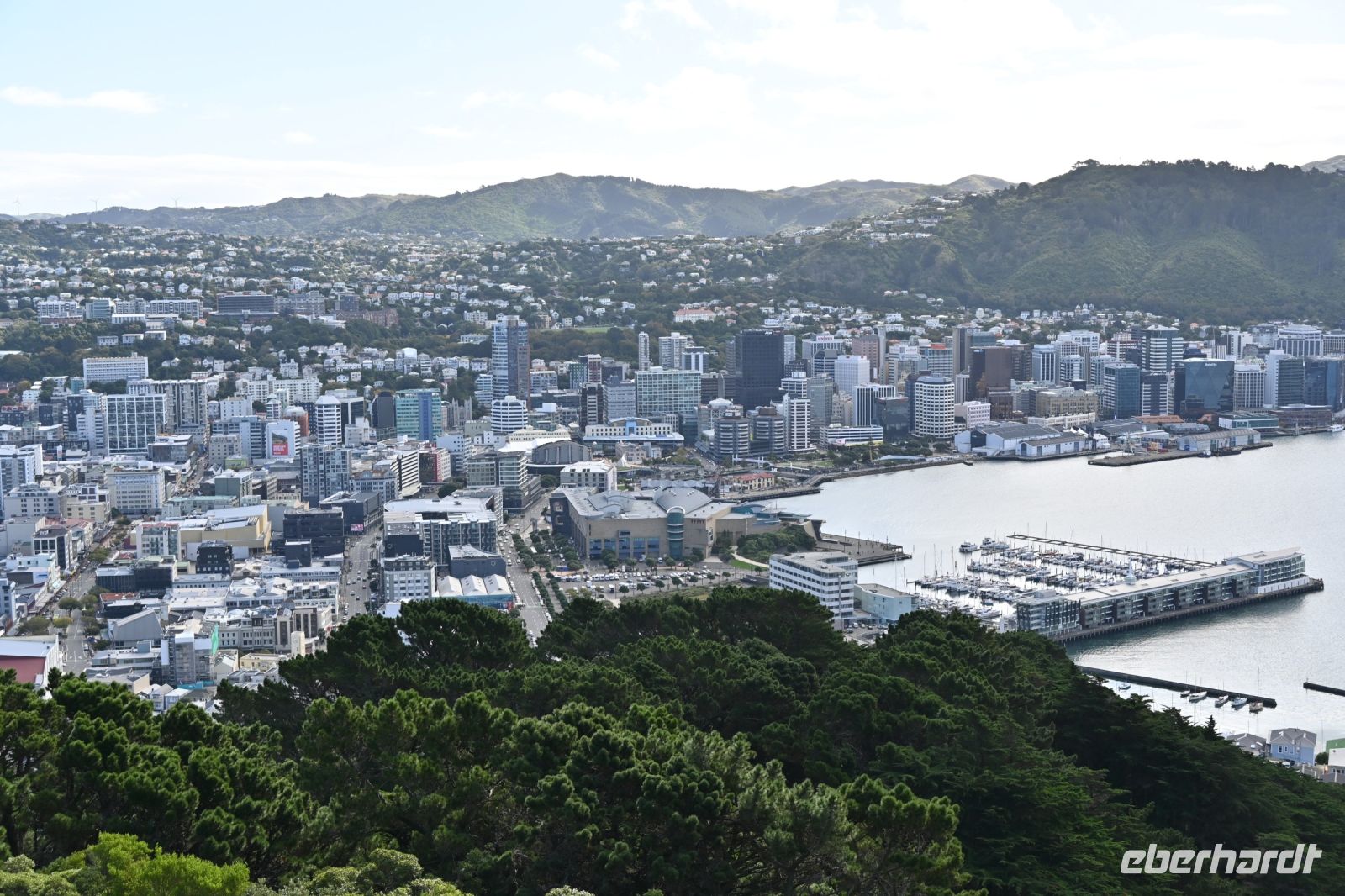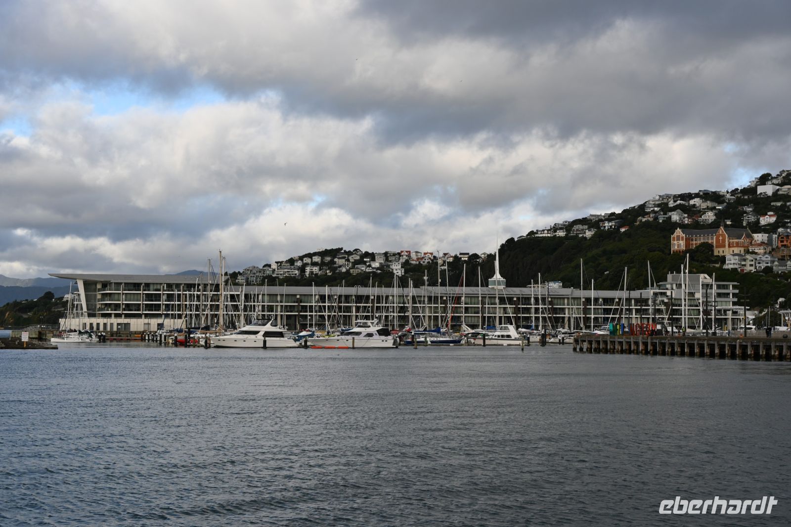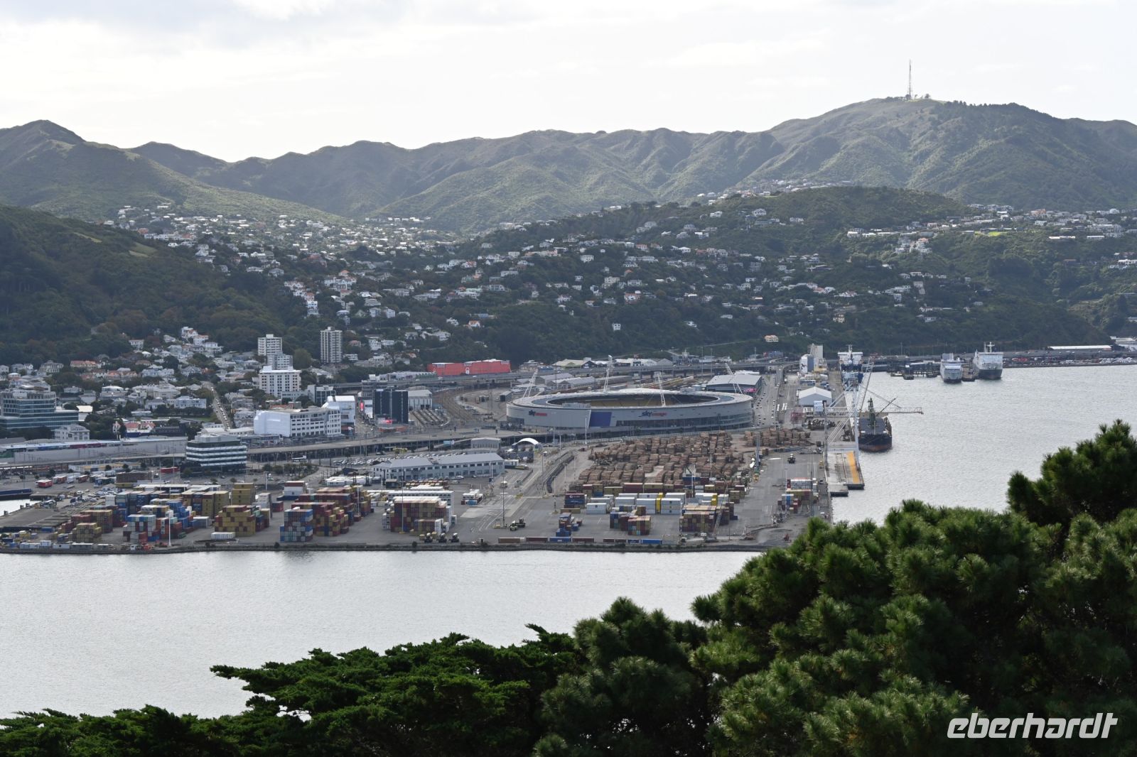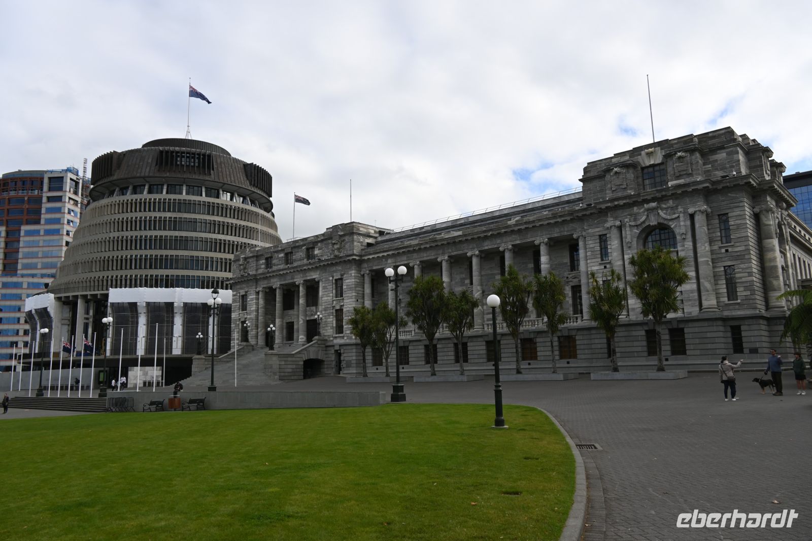 Am frühen Nachmittag erreichen wir die südlichste Stadt der Nordinsel – Wellington. Die Stadt an der Cook-Straße ist die Hauptstadt des Landes, obwohl hier nur 4% der Bevölkerung leben. Bei unserer Einfahrt in die Stadt ist der Hafen nicht zu übersehen. Hier sind die Fähren zur Südinsel besonders auffällig. Eine davon wird uns morgen übersetzen. Was auch auffällt, ist das viele Holz, das hier gestapelt wird. Die hier auf der Insel gefällten Fichten werden hauptsächlich nach China importiert. Gleich darauf ist man mitten in der Stadt und Helle macht mit uns eine kleine Rundfahrt. Besonders auffällig ist das Nationalmuseum an der Hafenpromenade. Das „Te Papa“ ist für alle Besucher kostenfrei und stellt die Geschichte, Natur und die Moari-Kultur vor. Am Mount Victoria, dem 196 Meter hohen Hügel, verschaffen wir uns einen Überblick über die Stadt und deren umliegende Ortschaften. So gibt es hier auch einen kleinen Flughafen und wir können einigen Flugzeugen bei der Landung zusehen. Warum die Stadt „Windy City“ genannt wird, wird uns hier oben auch deutlich. Ein kalter Wind weht uns um die Ohren. Mit unserem Bus fahren wir wieder in die Innenstadt, ins Regierungsviertel. Der „Beehive“ ist wohl eines der bekanntesten Gebäude des Landes und wurde als neues Parlamentsgebäude, direkt neben dem vorherigen, errichtet. Dieses war zu klein geworden. Nachdem auffiel, dass auch der Bienenstock zu klein ist, wurden beide Gebäude genutzt. Auf der anderen Straßenseite steht ein deutlich schöneres und imposanteres Gebäude. Dieses wurde komplett aus Kauri-Holz errichtet und wird heute von der Universität für dir Fakultät der Juristen genutzt. Es ist das größte Holzhaus der südlichen Hemisphäre und so besonders, weil ein solcher Bau, aufgrund des unter Naturschutz stehenden Holzes, nicht mehr möglich wäre. Eine Renovierung war 1990 nur mit wiederverwerteten Holzresten aus anderen Gebäuden möglich.