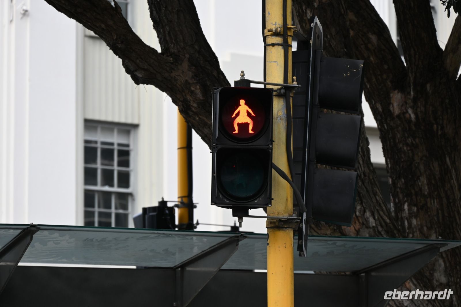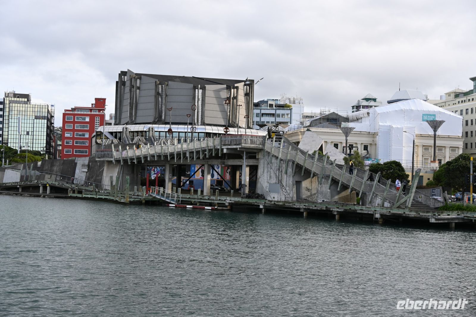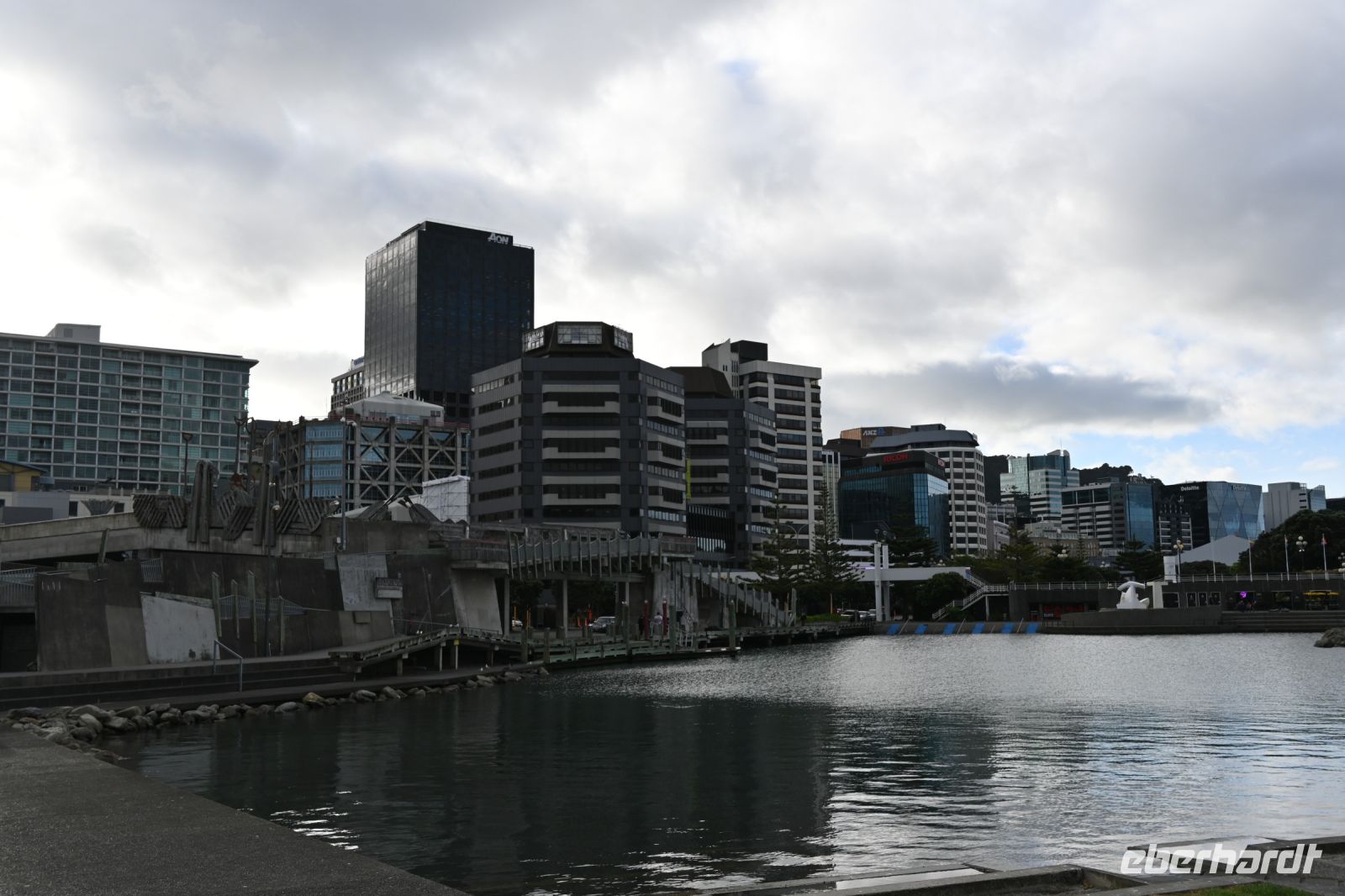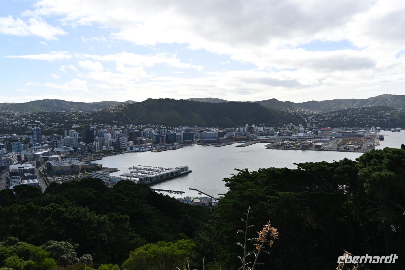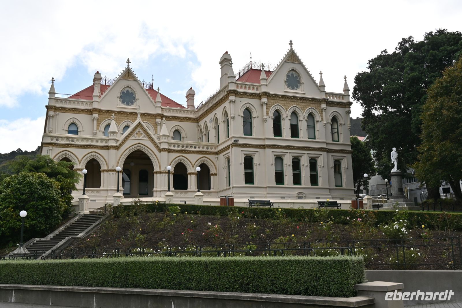 Am frühen Nachmittag erreichen wir die südlichste Stadt der Nordinsel – Wellington. Die Stadt an der Cook-Straße ist die Hauptstadt des Landes, obwohl hier nur 4% der Bevölkerung leben. Bei unserer Einfahrt in die Stadt ist der Hafen nicht zu übersehen. Hier sind die Fähren zur Südinsel besonders auffällig. Eine davon wird uns morgen übersetzen. Was auch auffällt, ist das viele Holz, das hier gestapelt wird. Die hier auf der Insel gefällten Fichten werden hauptsächlich nach China importiert. Gleich darauf ist man mitten in der Stadt und Helle macht mit uns eine kleine Rundfahrt. Besonders auffällig ist das Nationalmuseum an der Hafenpromenade. Das „Te Papa“ ist für alle Besucher kostenfrei und stellt die Geschichte, Natur und die Moari-Kultur vor. Am Mount Victoria, dem 196 Meter hohen Hügel, verschaffen wir uns einen Überblick über die Stadt und deren umliegende Ortschaften. So gibt es hier auch einen kleinen Flughafen und wir können einigen Flugzeugen bei der Landung zusehen. Warum die Stadt „Windy City“ genannt wird, wird uns hier oben auch deutlich. Ein kalter Wind weht uns um die Ohren. Mit unserem Bus fahren wir wieder in die Innenstadt, ins Regierungsviertel. Der „Beehive“ ist wohl eines der bekanntesten Gebäude des Landes und wurde als neues Parlamentsgebäude, direkt neben dem vorherigen, errichtet. Dieses war zu klein geworden. Nachdem auffiel, dass auch der Bienenstock zu klein ist, wurden beide Gebäude genutzt. Auf der anderen Straßenseite steht ein deutlich schöneres und imposanteres Gebäude. Dieses wurde komplett aus Kauri-Holz errichtet und wird heute von der Universität für dir Fakultät der Juristen genutzt. Es ist das größte Holzhaus der südlichen Hemisphäre und so besonders, weil ein solcher Bau, aufgrund des unter Naturschutz stehenden Holzes, nicht mehr möglich wäre. Eine Renovierung war 1990 nur mit wiederverwerteten Holzresten aus anderen Gebäuden möglich.