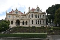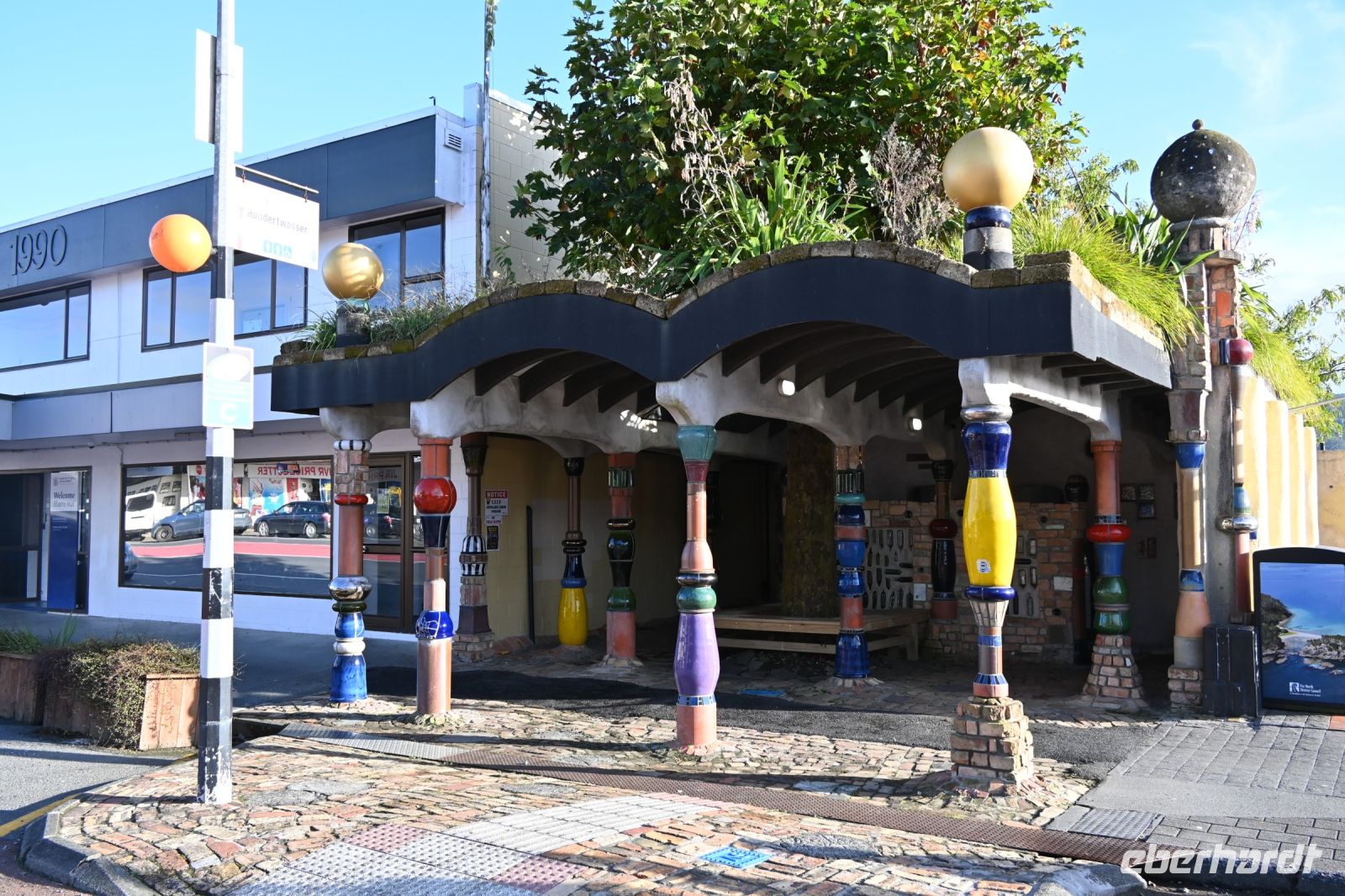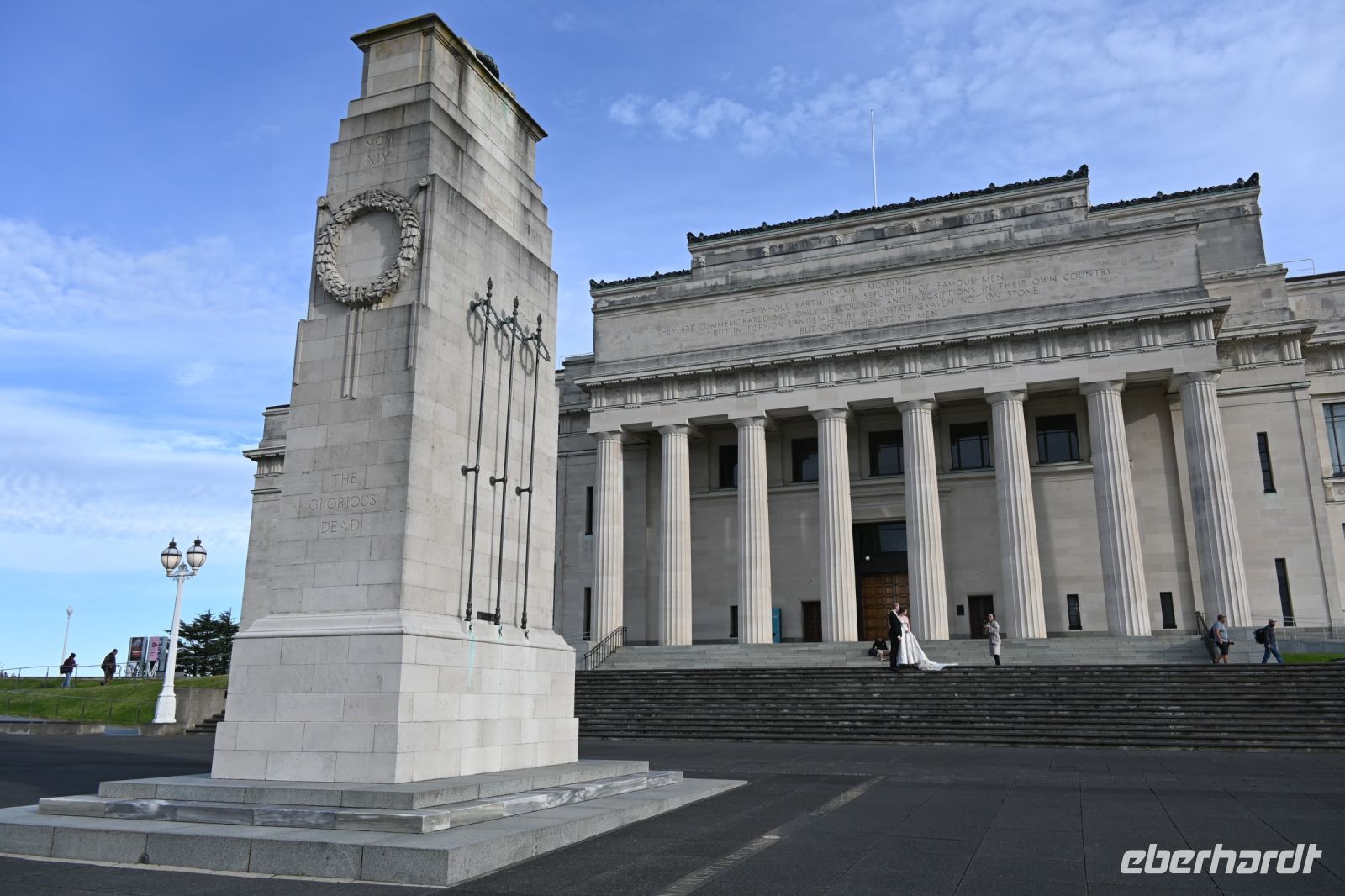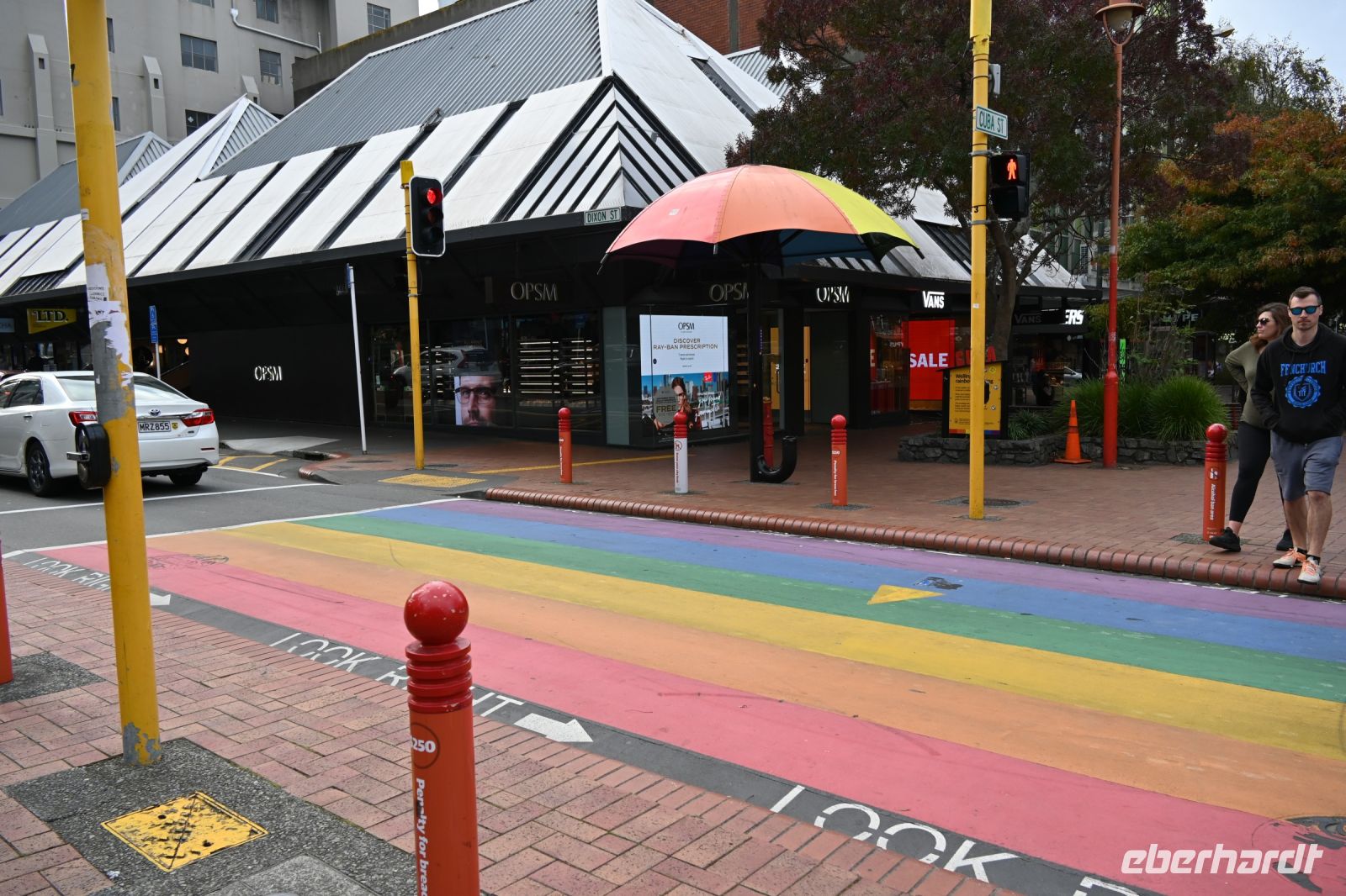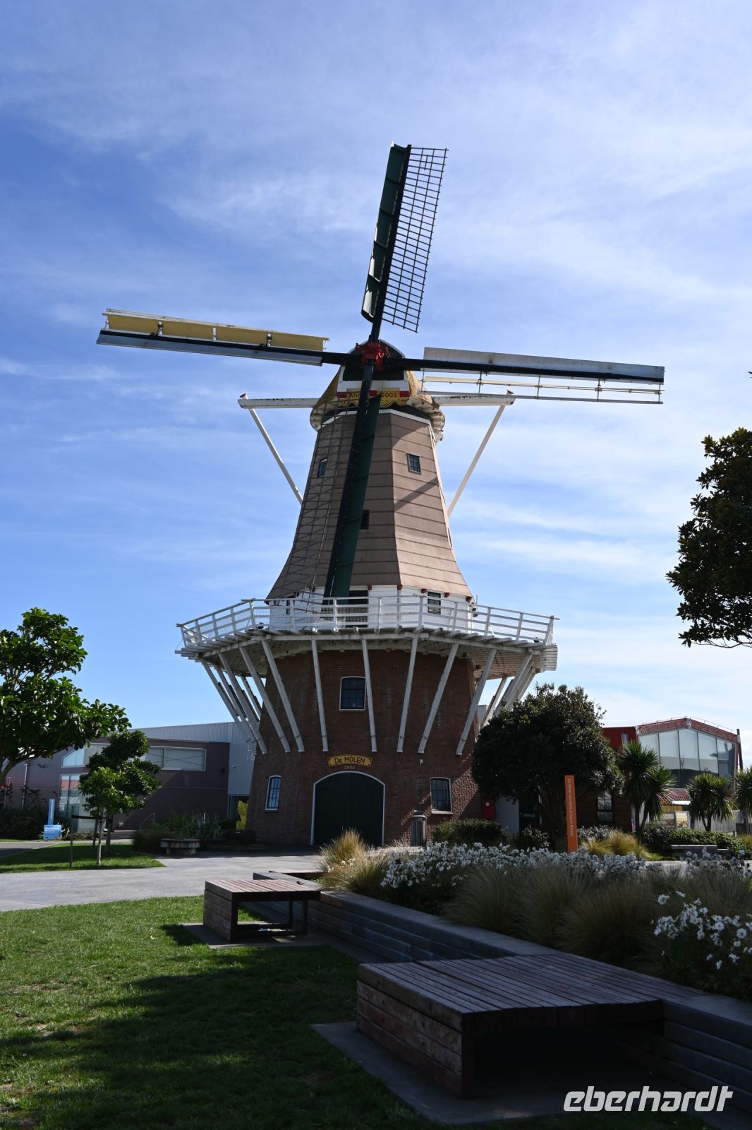 Am frühen Nachmittag erreichen wir die südlichste Stadt der Nordinsel – Wellington. Die Stadt an der Cook-Straße ist die Hauptstadt des Landes, obwohl hier nur 4% der Bevölkerung leben. Bei unserer Einfahrt in die Stadt ist der Hafen nicht zu übersehen. Hier sind die Fähren zur Südinsel besonders auffällig. Eine davon wird uns morgen übersetzen. Was auch auffällt, ist das viele Holz, das hier gestapelt wird. Die hier auf der Insel gefällten Fichten werden hauptsächlich nach China importiert. Gleich darauf ist man mitten in der Stadt und Helle macht mit uns eine kleine Rundfahrt. Besonders auffällig ist das Nationalmuseum an der Hafenpromenade. Das „Te Papa“ ist für alle Besucher kostenfrei und stellt die Geschichte, Natur und die Moari-Kultur vor. Am Mount Victoria, dem 196 Meter hohen Hügel, verschaffen wir uns einen Überblick über die Stadt und deren umliegende Ortschaften. So gibt es hier auch einen kleinen Flughafen und wir können einigen Flugzeugen bei der Landung zusehen. Warum die Stadt „Windy City“ genannt wird, wird uns hier oben auch deutlich. Ein kalter Wind weht uns um die Ohren. Mit unserem Bus fahren wir wieder in die Innenstadt, ins Regierungsviertel. Der „Beehive“ ist wohl eines der bekanntesten Gebäude des Landes und wurde als neues Parlamentsgebäude, direkt neben dem vorherigen, errichtet. Dieses war zu klein geworden. Nachdem auffiel, dass auch der Bienenstock zu klein ist, wurden beide Gebäude genutzt. Auf der anderen Straßenseite steht ein deutlich schöneres und imposanteres Gebäude. Dieses wurde komplett aus Kauri-Holz errichtet und wird heute von der Universität für dir Fakultät der Juristen genutzt. Es ist das größte Holzhaus der südlichen Hemisphäre und so besonders, weil ein solcher Bau, aufgrund des unter Naturschutz stehenden Holzes, nicht mehr möglich wäre. Eine Renovierung war 1990 nur mit wiederverwerteten Holzresten aus anderen Gebäuden möglich.