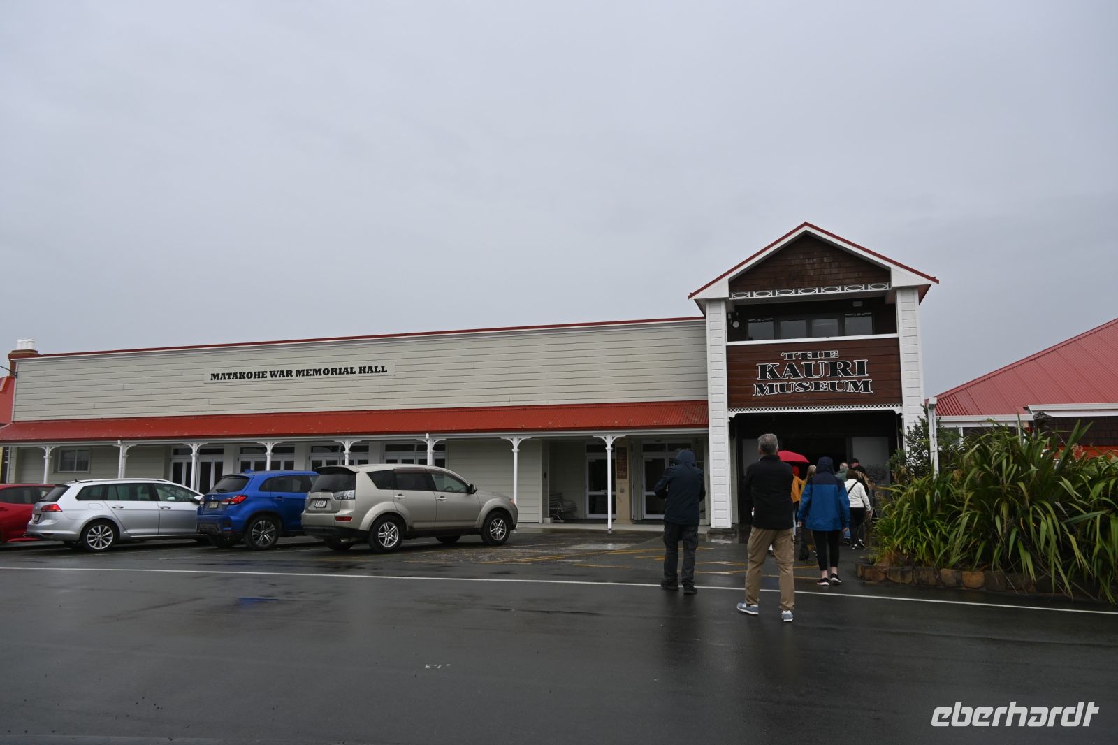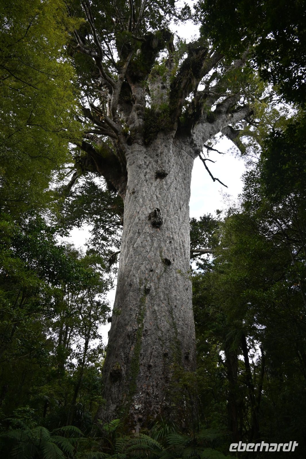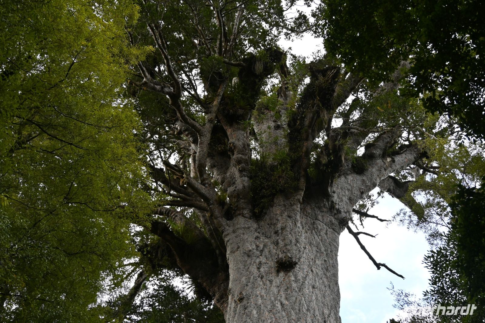 Eine endemische Pflanzenart ist der Kauri-Baum, um den es heute hauptsächlich geht. Vom damaligen Bestand sind heute nur noch 2% übrig. Anfang des 20. Jahrhunderts begann diese starke Abholzung. Durch das gerade Wachstum eignete es sich besonders gut zum Mast-Bau für Segelschiffe, aber auch Möbel wurden daraus hergestellt. Die Geschichte und Verarbeitung dieses Baumes lernen wir im Kauri-Museum in Matakohe kennen. Hier lernen wir, dass nicht nur das Holz für die Menschen wertvoll war, sondern auch das Harz. Teilweise wurde auch versucht dieses aus den Bäumen zu zapfen, jedoch starb der Baum kurze Zeit später auch ab. Das Harz diente als Kleber für den Schiffbau, später wurde es auch für die Farbherstellung genutzt. Nach der Mittagspause nehmen wir wieder im Bus platz und es geht in den Kauri-Wald. Sehr kurvenreich ist die Strecke im Waipoua Forest, doch zugleich auch wunderschön. Viele Palmen und Farne säumen den Weg und alles ist sehr mystisch. An einem kleinen Parkplatz machen wir Stopp und hier ist der Eingang zum „Herr des Waldes“ – Tane Mahuta. Da viele Kauri-Bäume auch von einem Pilz befallen wurden und gestorben sind, gibt es hier besondere Schutzmaßnahmen. Bevor wir den Weg betreten, müssen unsere Schuhe gebürstet und desinfiziert werden, damit mögliche Keime abgetötet werden. Ein kurzer Weg durch den Urwald und da steht er - 45 Meter hoch, circa 2.000 Jahre alt und einen Umfang von fast 14 Metern. Es wurde extra ein zweiter Aussichtpunkt weiter hinten gebaut, damit dieser Riese auf ein Bild passt.
