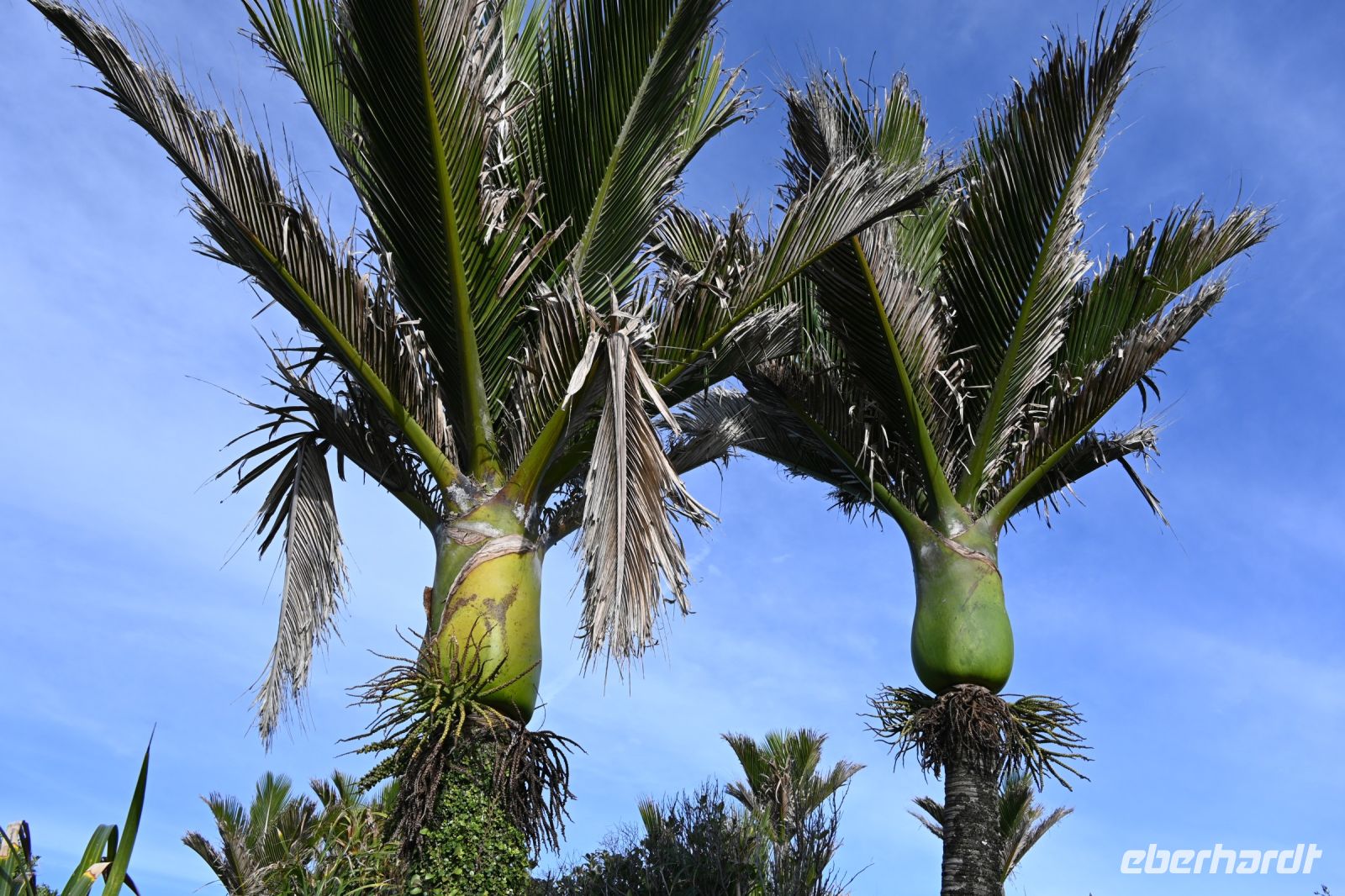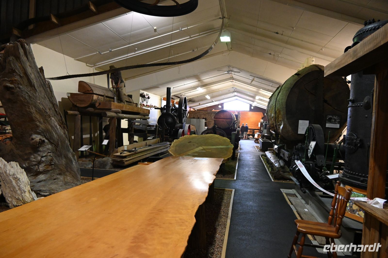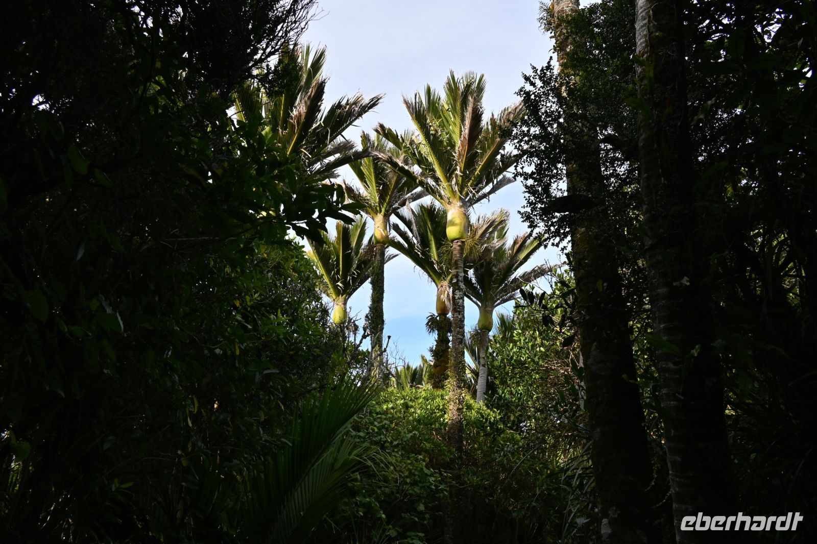 Eine endemische Pflanzenart ist der Kauri-Baum, um den es heute hauptsächlich geht. Vom damaligen Bestand sind heute nur noch 2% übrig. Anfang des 20. Jahrhunderts begann diese starke Abholzung. Durch das gerade Wachstum eignete es sich besonders gut zum Mast-Bau für Segelschiffe, aber auch Möbel wurden daraus hergestellt. Die Geschichte und Verarbeitung dieses Baumes lernen wir im Kauri-Museum in Matakohe kennen. Hier lernen wir, dass nicht nur das Holz für die Menschen wertvoll war, sondern auch das Harz. Teilweise wurde auch versucht dieses aus den Bäumen zu zapfen, jedoch starb der Baum kurze Zeit später auch ab. Das Harz diente als Kleber für den Schiffbau, später wurde es auch für die Farbherstellung genutzt. Nach der Mittagspause nehmen wir wieder im Bus platz und es geht in den Kauri-Wald. Sehr kurvenreich ist die Strecke im Waipoua Forest, doch zugleich auch wunderschön. Viele Palmen und Farne säumen den Weg und alles ist sehr mystisch. An einem kleinen Parkplatz machen wir Stopp und hier ist der Eingang zum „Herr des Waldes“ – Tane Mahuta. Da viele Kauri-Bäume auch von einem Pilz befallen wurden und gestorben sind, gibt es hier besondere Schutzmaßnahmen. Bevor wir den Weg betreten, müssen unsere Schuhe gebürstet und desinfiziert werden, damit mögliche Keime abgetötet werden. Ein kurzer Weg durch den Urwald und da steht er - 45 Meter hoch, circa 2.000 Jahre alt und einen Umfang von fast 14 Metern. Es wurde extra ein zweiter Aussichtpunkt weiter hinten gebaut, damit dieser Riese auf ein Bild passt.