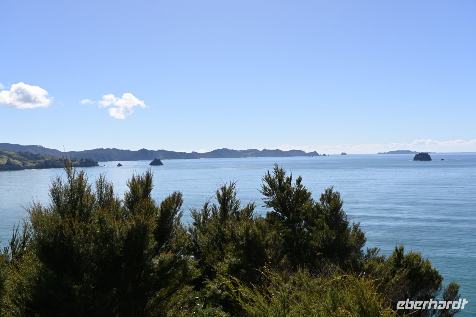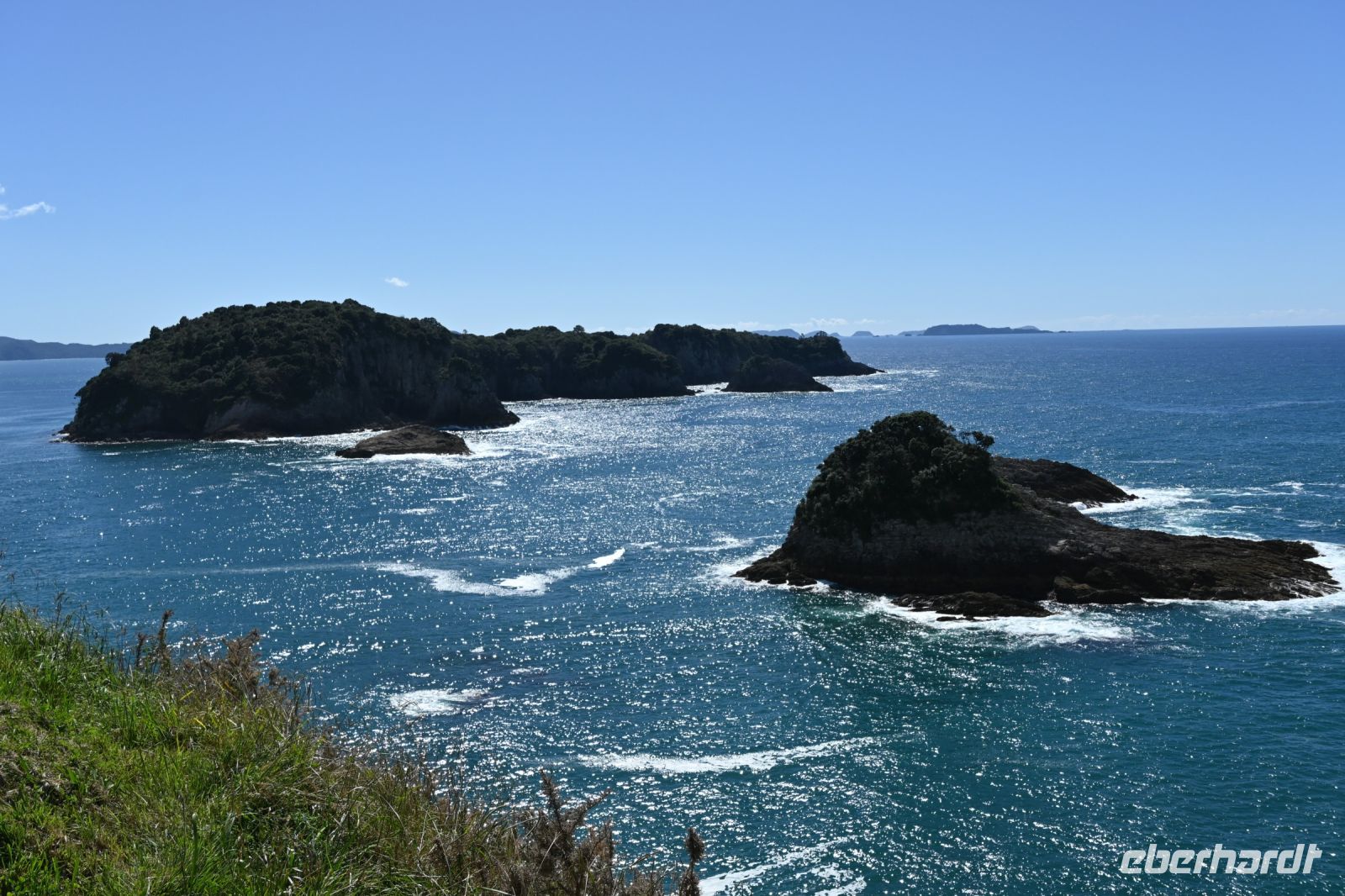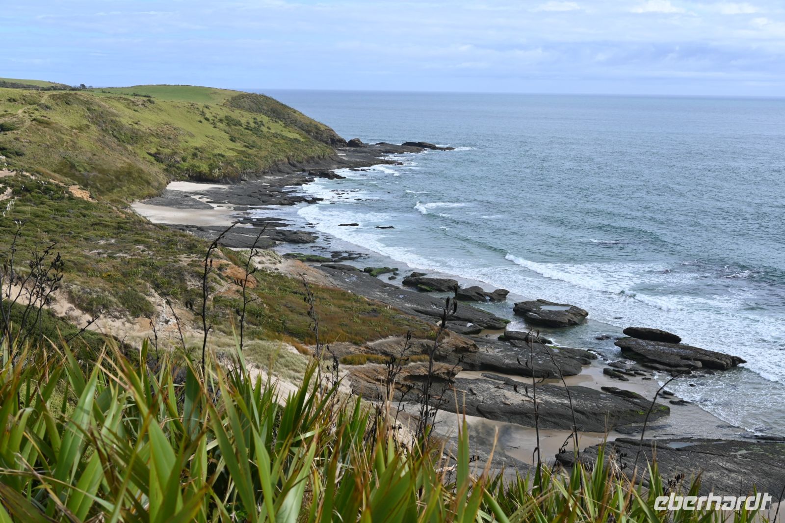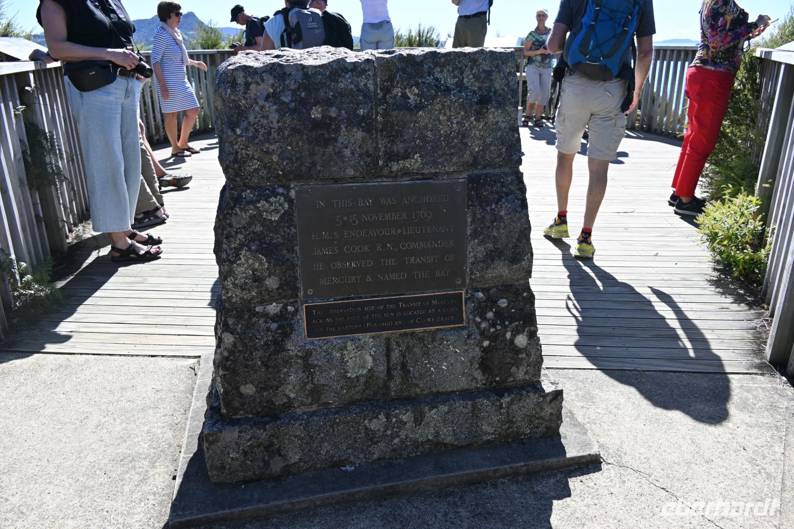Unsere Abfahrt ist heute erst 9.30 Uhr, also ein entspannter Start in den Tag. Auf dem Plan steht heute eigentlich der Besuch der Cathedral Cove, jedoch ist diese durch Rutschungen gesperrt. Helle und ich haben uns also etwas anderes überlegt. Helle fährt uns zuerst in den Ort Cooks Beach. Hierher segelte er, um die Entfernung zwischen Sonne und Erde mit Hilfe des Merkur zu vermessen. Einen tollen Blick hat man vor hier auf den Ort, die Mercury Bay und die vorgelagerten Inseln. Großartig, dass auch das Wetter so gut mitspielt. Über eine Treppe geht es nach unten und wir erreichen den Lonely Beach und als wir hier ankommen, sind wir wirklich noch allein. Hohe Klippen rahmen diesen schönen Strand ein, klares Wasser und einige Steine im Wasser machen das perfekte Foto komplett. Der Strand lädt auch dazu ein, einige Muscheln als Souvenir mitzunehmen. Hier gibt es einige Formen, die es an Nord- oder Ostsee nicht zu finden gibt. Die Herausforderung ist es, das passende runde Ober- und das flache Unterteil einer Jakobsmuschel zu finden. Als zweiten Ersatz habe ich mir noch einen Punkt, als Alternative zum eigentlichen Programm, gleich in der Nähe rausgesucht. Der „Te Pare Point“ im Ort Hahei liegt in der Bucht gegenüber der Cathedral Cove. Doch im Gegensatz zu dem beliebten Ausflugsziel, wenn es nicht geschlossen wäre, sind wir an unserem Punkt ganz allein. Dieser Punkt wurde früher von den Maori als Festung genutzt, um ankommende Schiffe rechtzeitig zu sehen und ihr Land zu beschützen.
