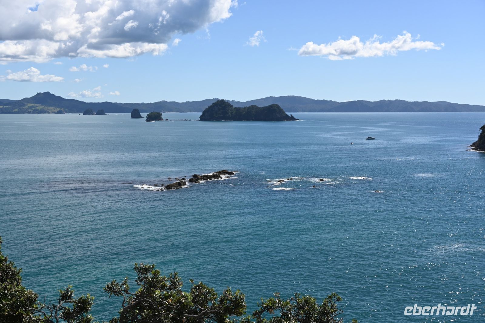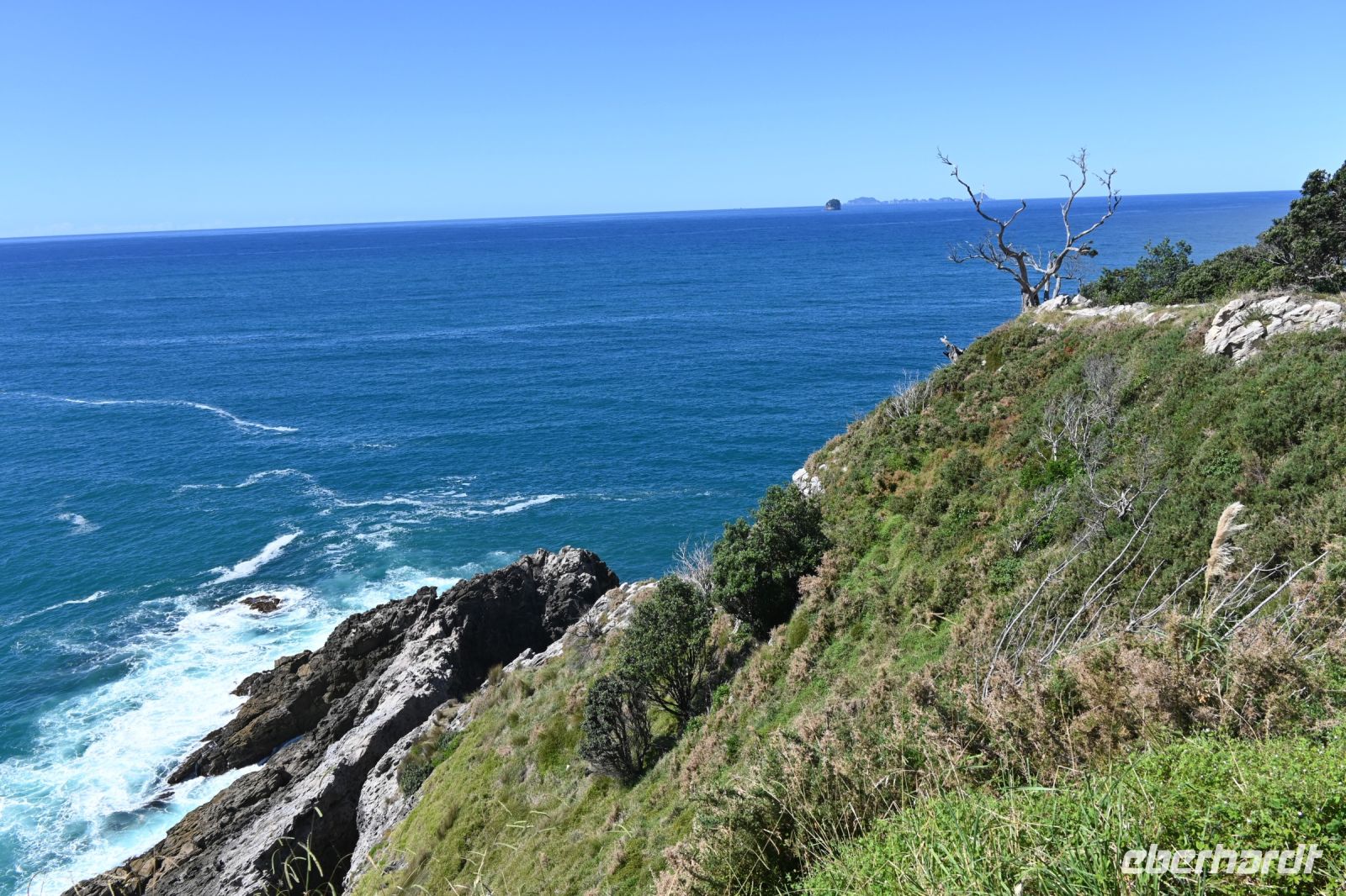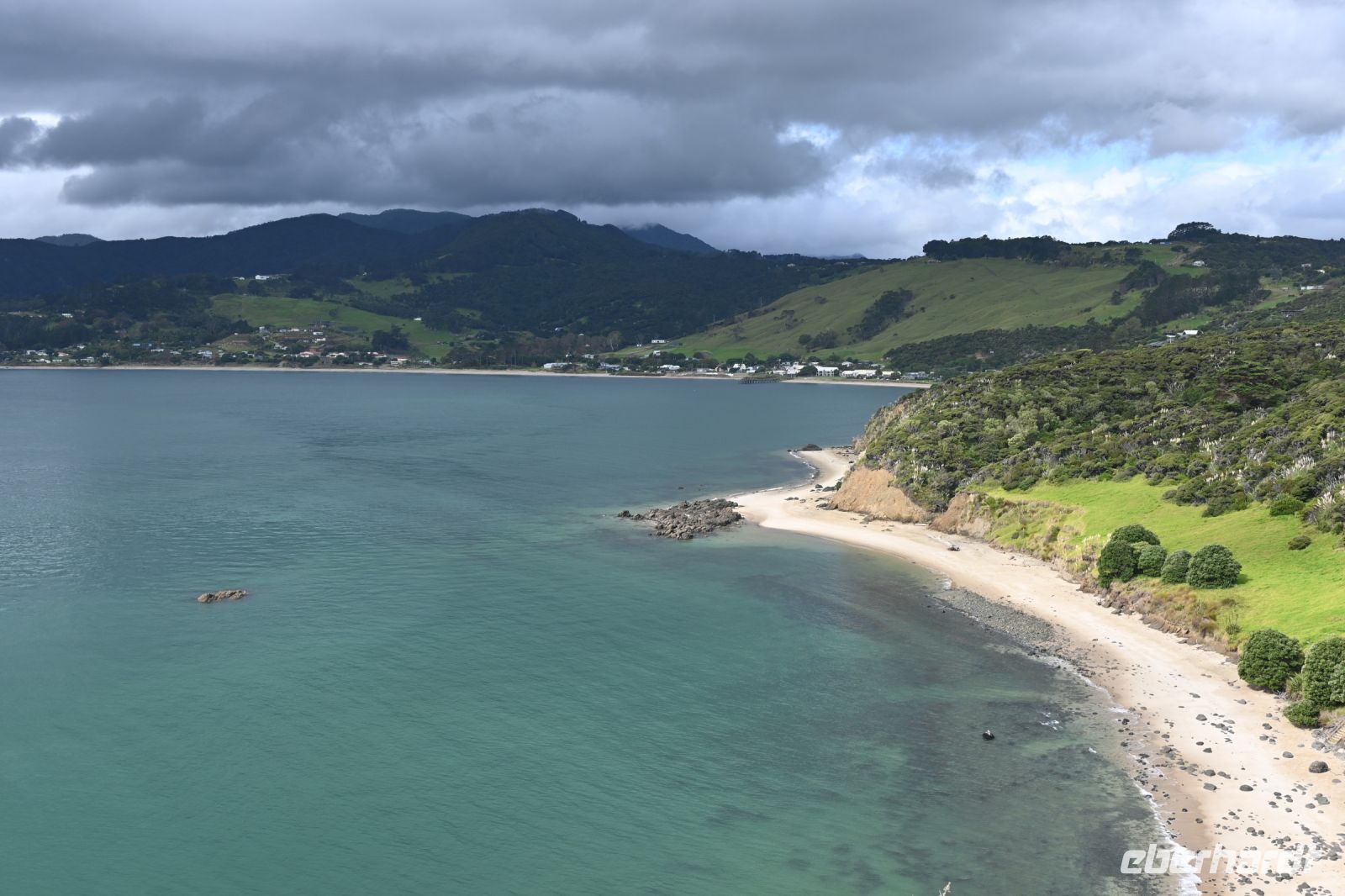 Unsere Abfahrt ist heute erst 9.30 Uhr, also ein entspannter Start in den Tag. Auf dem Plan steht heute eigentlich der Besuch der Cathedral Cove, jedoch ist diese durch Rutschungen gesperrt. Helle und ich haben uns also etwas anderes überlegt. Helle fährt uns zuerst in den Ort Cooks Beach. Hierher segelte er, um die Entfernung zwischen Sonne und Erde mit Hilfe des Merkur zu vermessen. Einen tollen Blick hat man vor hier auf den Ort, die Mercury Bay und die vorgelagerten Inseln. Großartig, dass auch das Wetter so gut mitspielt. Über eine Treppe geht es nach unten und wir erreichen den Lonely Beach und als wir hier ankommen, sind wir wirklich noch allein. Hohe Klippen rahmen diesen schönen Strand ein, klares Wasser und einige Steine im Wasser machen das perfekte Foto komplett. Der Strand lädt auch dazu ein, einige Muscheln als Souvenir mitzunehmen. Hier gibt es einige Formen, die es an Nord- oder Ostsee nicht zu finden gibt. Die Herausforderung ist es, das passende runde Ober- und das flache Unterteil einer Jakobsmuschel zu finden. Als zweiten Ersatz habe ich mir noch einen Punkt, als Alternative zum eigentlichen Programm, gleich in der Nähe rausgesucht. Der „Te Pare Point“ im Ort Hahei liegt in der Bucht gegenüber der Cathedral Cove. Doch im Gegensatz zu dem beliebten Ausflugsziel, wenn es nicht geschlossen wäre, sind wir an unserem Punkt ganz allein. Dieser Punkt wurde früher von den Maori als Festung genutzt, um ankommende Schiffe rechtzeitig zu sehen und ihr Land zu beschützen.