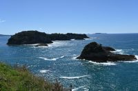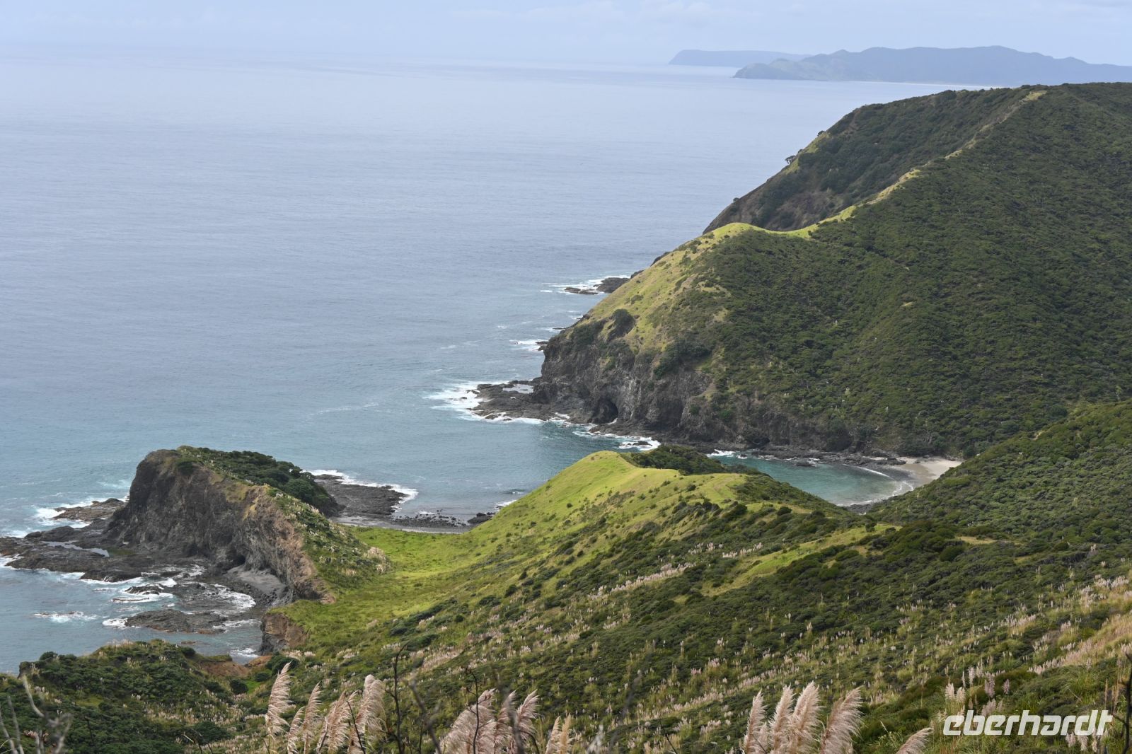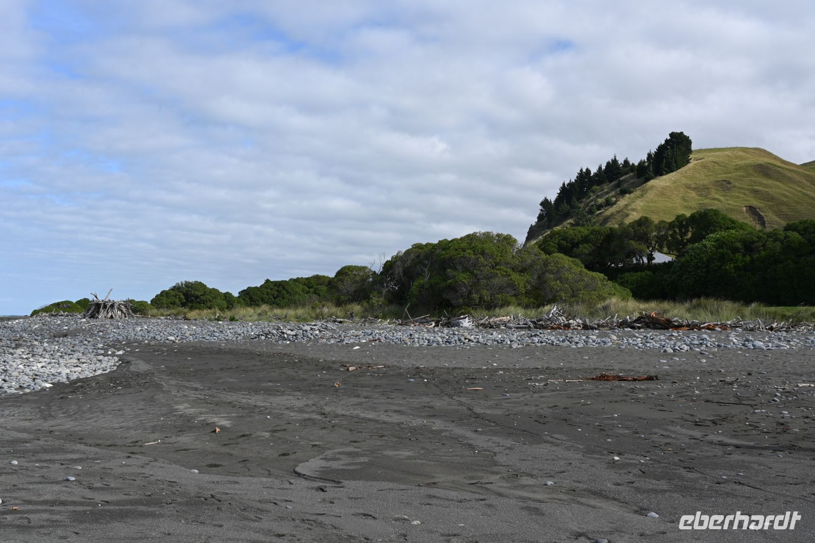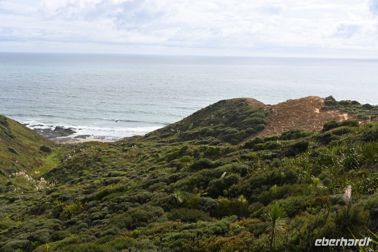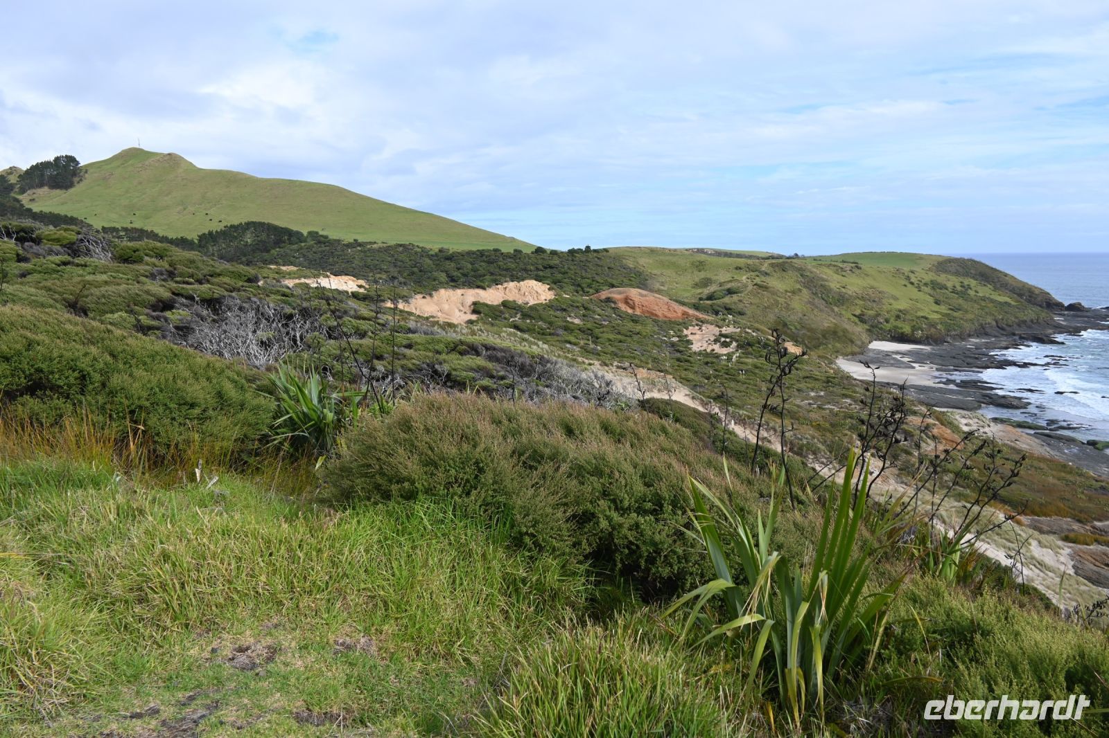 Unsere Abfahrt ist heute erst 9.30 Uhr, also ein entspannter Start in den Tag. Auf dem Plan steht heute eigentlich der Besuch der Cathedral Cove, jedoch ist diese durch Rutschungen gesperrt. Helle und ich haben uns also etwas anderes überlegt. Helle fährt uns zuerst in den Ort Cooks Beach. Hierher segelte er, um die Entfernung zwischen Sonne und Erde mit Hilfe des Merkur zu vermessen. Einen tollen Blick hat man vor hier auf den Ort, die Mercury Bay und die vorgelagerten Inseln. Großartig, dass auch das Wetter so gut mitspielt. Über eine Treppe geht es nach unten und wir erreichen den Lonely Beach und als wir hier ankommen, sind wir wirklich noch allein. Hohe Klippen rahmen diesen schönen Strand ein, klares Wasser und einige Steine im Wasser machen das perfekte Foto komplett. Der Strand lädt auch dazu ein, einige Muscheln als Souvenir mitzunehmen. Hier gibt es einige Formen, die es an Nord- oder Ostsee nicht zu finden gibt. Die Herausforderung ist es, das passende runde Ober- und das flache Unterteil einer Jakobsmuschel zu finden. Als zweiten Ersatz habe ich mir noch einen Punkt, als Alternative zum eigentlichen Programm, gleich in der Nähe rausgesucht. Der „Te Pare Point“ im Ort Hahei liegt in der Bucht gegenüber der Cathedral Cove. Doch im Gegensatz zu dem beliebten Ausflugsziel, wenn es nicht geschlossen wäre, sind wir an unserem Punkt ganz allein. Dieser Punkt wurde früher von den Maori als Festung genutzt, um ankommende Schiffe rechtzeitig zu sehen und ihr Land zu beschützen.