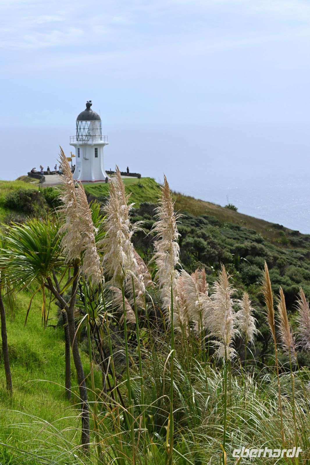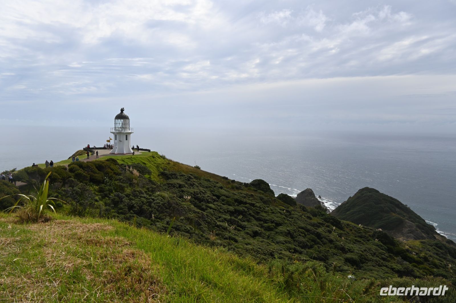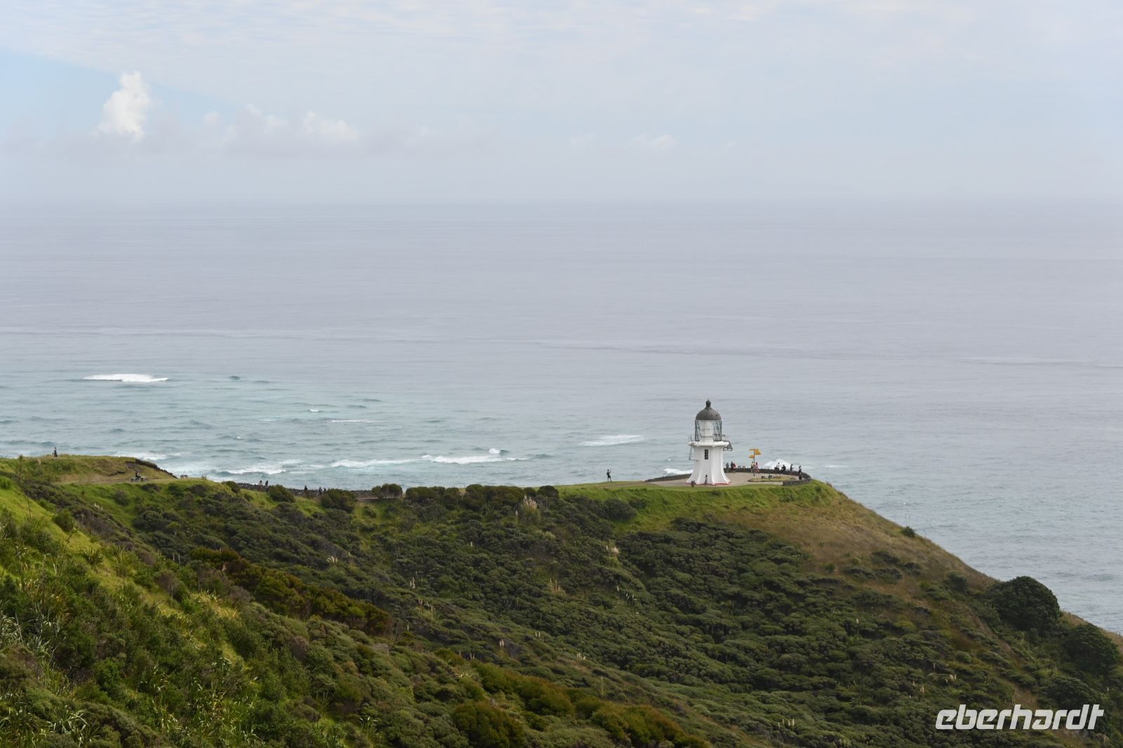Nach dem kräftigen Regen gestern Abend hangen die Wolken am Morgen noch ziemlich tief, inzwischen haben sich diese etwas verzogen und blaue Wolkenlücken sind erkennbar. Den Regen hat die Region sehr benötigt, denn seit des Zyklon Mitte Februar hier auf der Insel, gab es so gut wie keinen Regen mehr. Zur Mittagszeit erreichen wir das Kap. Noch Anfang der Woche gab es hier einen Waldbrand und die Helikopter sind noch immer unterwegs und löschen letzte Glutnester. Nach langer Zeit im Bus können wir uns etwas bewegen und genießen den kleinen Spaziergang zum Leuchtturm. Dieser steht bereits seit 1941 hier und wurde erst 1987 voll automatisiert. Es muss sehr einsam gewesen sein, hier am letzten Zipfel. Vor Allem durfte man keine Angst vor Geistern haben. Die Maori-Legende besagt, dass die Seelen der Toten hier herkommen und an den Wurzeln des Phuhutukawa-Baum, unterhalb des Leuchtturms, ins Meer gleiten, um zu ihren Ahnen zurück zu kehren. Eine Besonderheit hat dieser Ort noch. Wenn man aufs Meer hinausschaut, kann man gut erkennen, dass hier die zwei Strömungen vom Tasmanischen Meer und dem Pazifischen Ozean aufeinandertreffen. An der Grenze bildet das Wasser viele Schaumkronen und auch eine Abgrenzung durch die Farben ist gut zu erkennen. Für den kleinen Mittagssnack sucht sich jeder ein schönes Plätzchen und genießt die angenehmen Temperaturen.