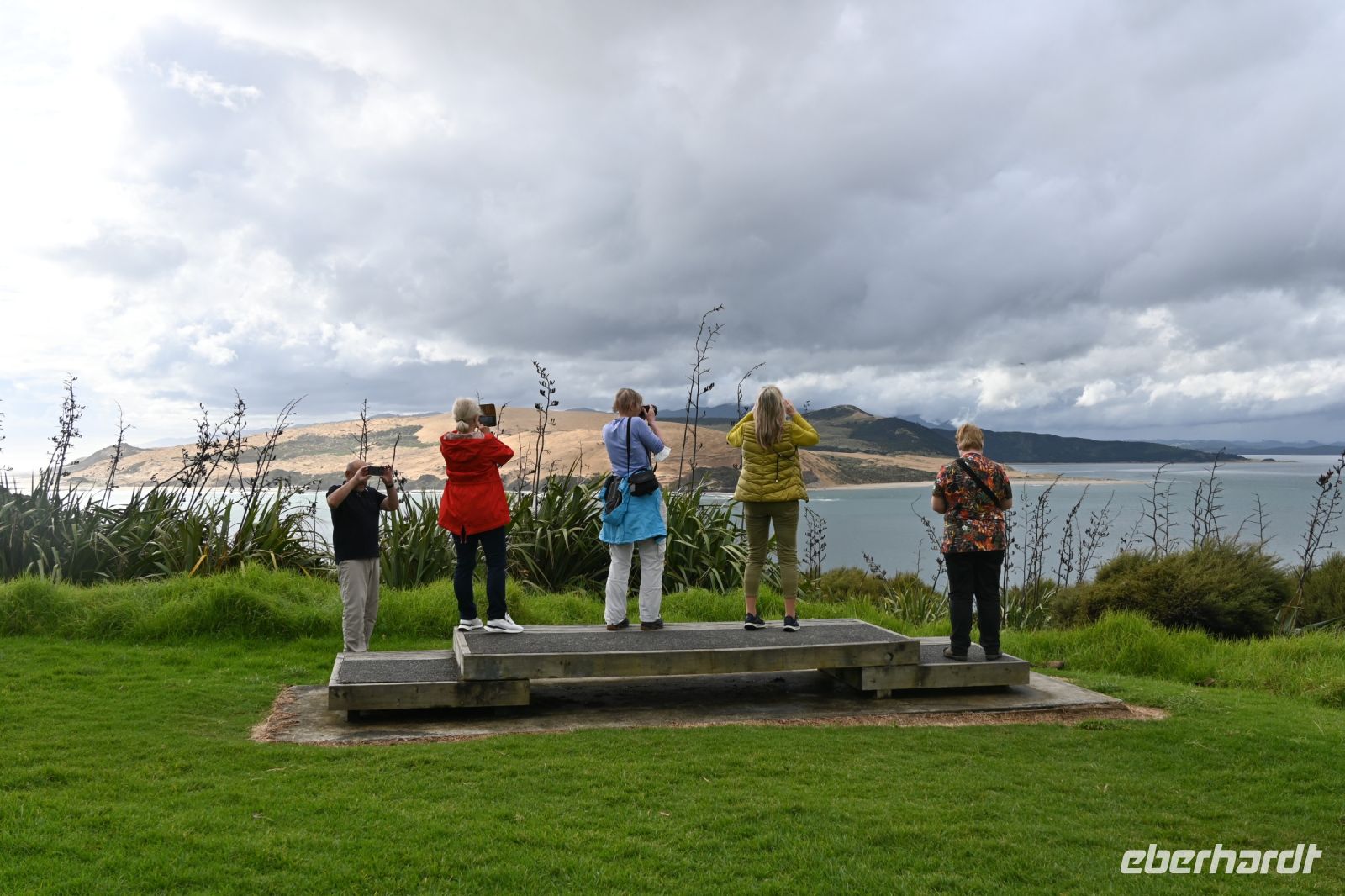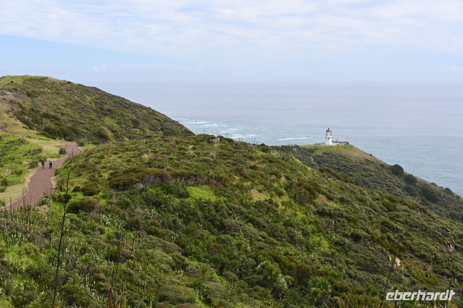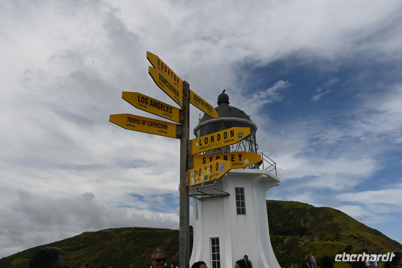 Nach dem kräftigen Regen gestern Abend hangen die Wolken am Morgen noch ziemlich tief, inzwischen haben sich diese etwas verzogen und blaue Wolkenlücken sind erkennbar. Den Regen hat die Region sehr benötigt, denn seit des Zyklon Mitte Februar hier auf der Insel, gab es so gut wie keinen Regen mehr. Zur Mittagszeit erreichen wir das Kap. Noch Anfang der Woche gab es hier einen Waldbrand und die Helikopter sind noch immer unterwegs und löschen letzte Glutnester. Nach langer Zeit im Bus können wir uns etwas bewegen und genießen den kleinen Spaziergang zum Leuchtturm. Dieser steht bereits seit 1941 hier und wurde erst 1987 voll automatisiert. Es muss sehr einsam gewesen sein, hier am letzten Zipfel. Vor Allem durfte man keine Angst vor Geistern haben. Die Maori-Legende besagt, dass die Seelen der Toten hier herkommen und an den Wurzeln des Phuhutukawa-Baum, unterhalb des Leuchtturms, ins Meer gleiten, um zu ihren Ahnen zurück zu kehren. Eine Besonderheit hat dieser Ort noch. Wenn man aufs Meer hinausschaut, kann man gut erkennen, dass hier die zwei Strömungen vom Tasmanischen Meer und dem Pazifischen Ozean aufeinandertreffen. An der Grenze bildet das Wasser viele Schaumkronen und auch eine Abgrenzung durch die Farben ist gut zu erkennen. Für den kleinen Mittagssnack sucht sich jeder ein schönes Plätzchen und genießt die angenehmen Temperaturen.