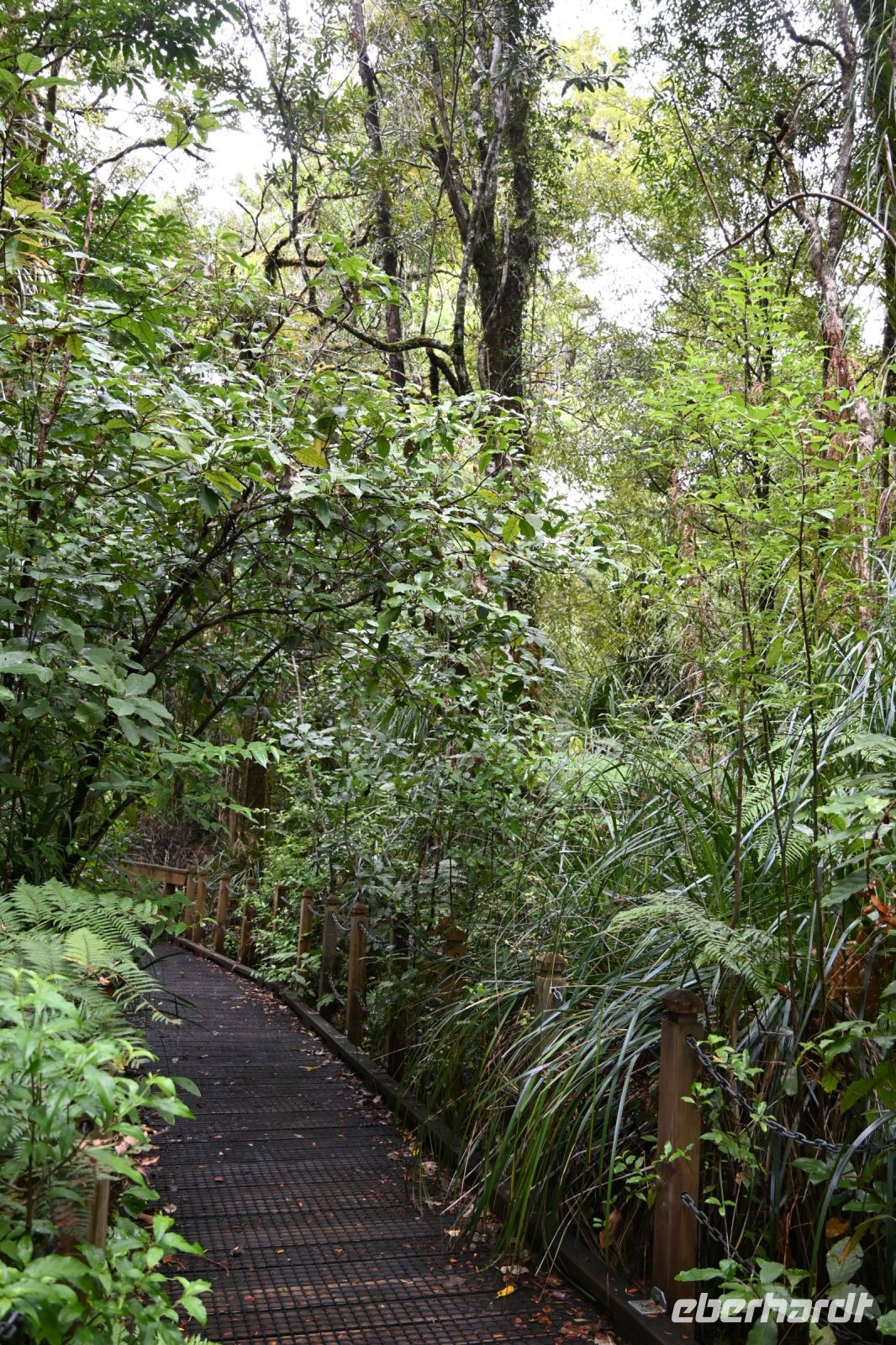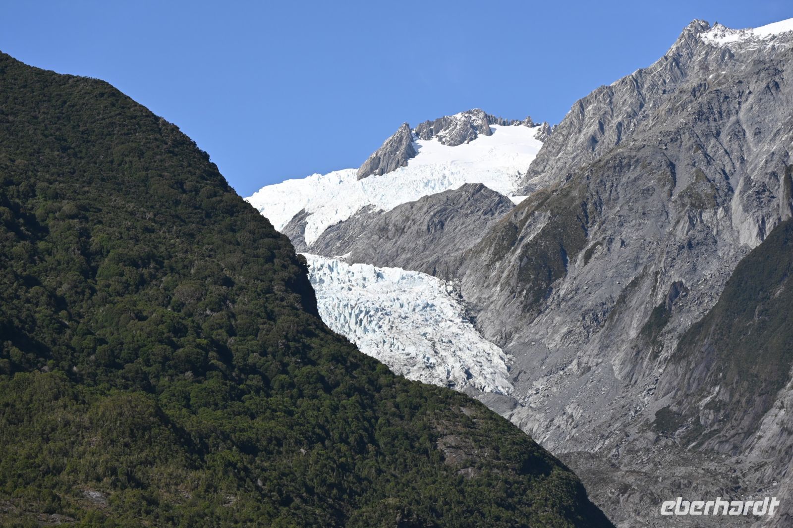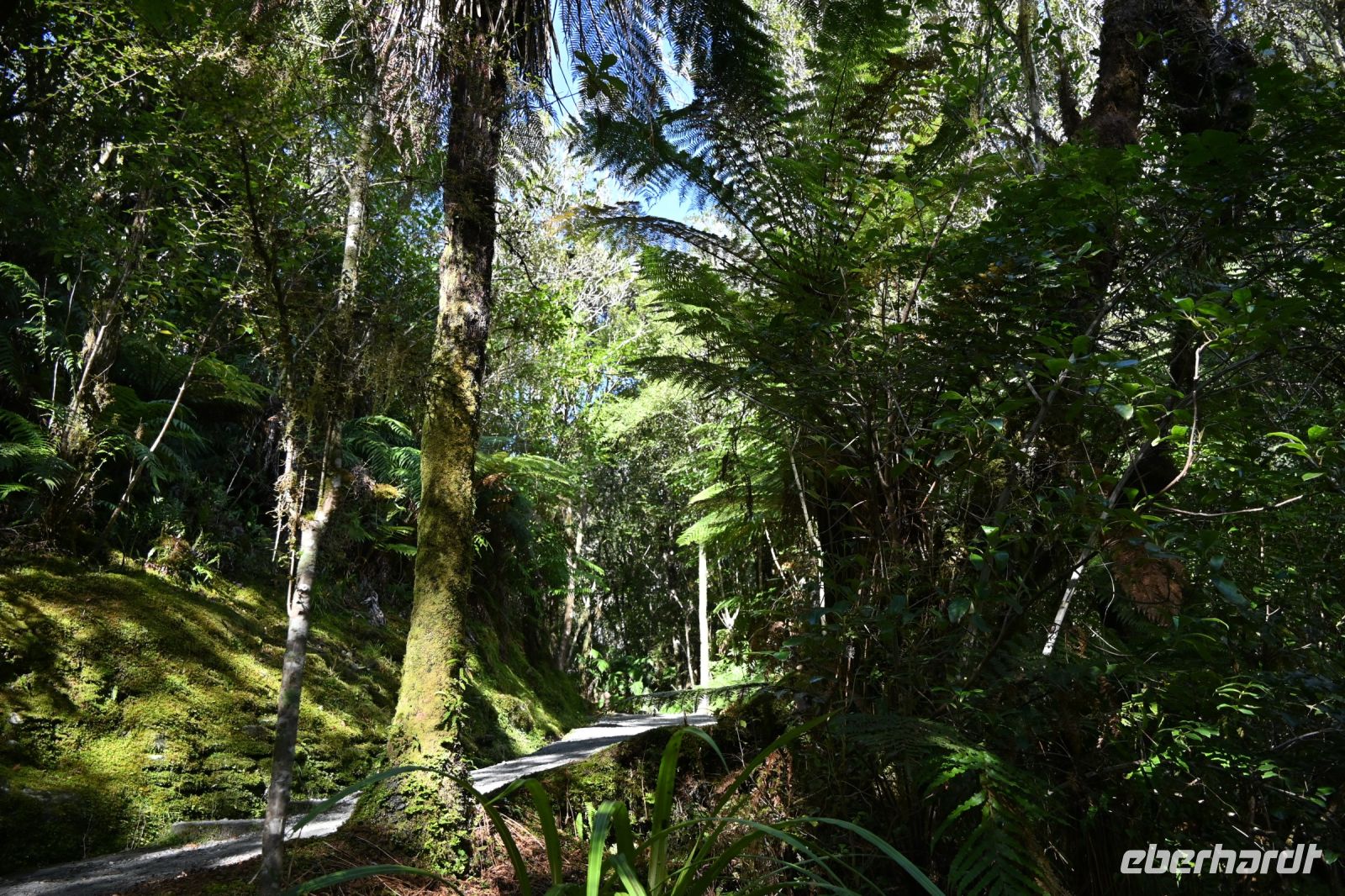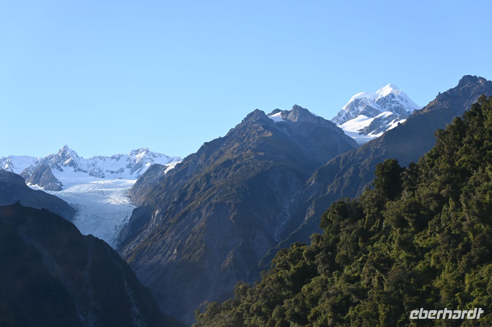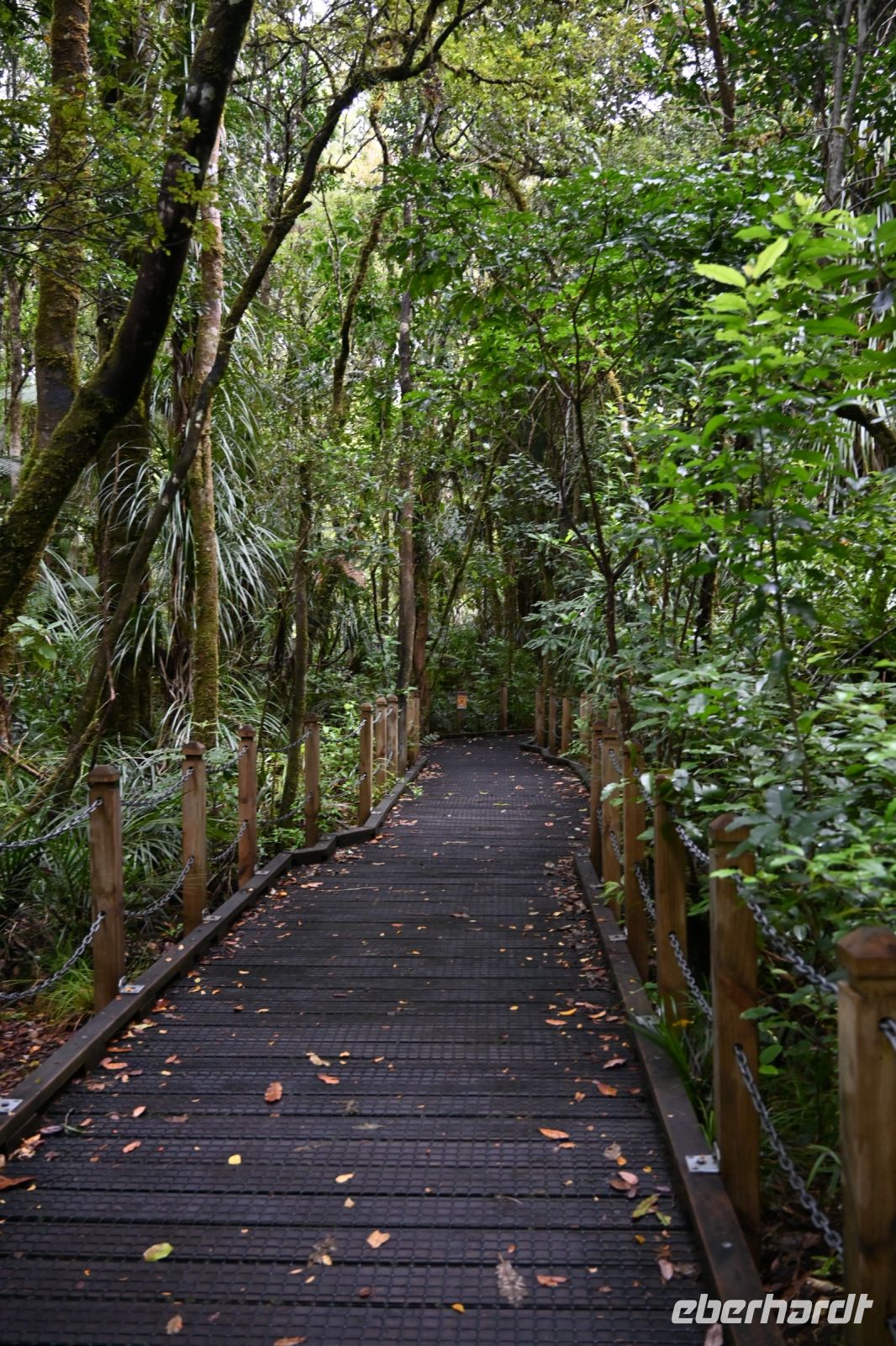 Gleich in der Nähe gibt es die Möglichkeit etwas näher an den Franz-Josef-Gletscher heranzukommen. Von einem kleinen Parkplatz starten wir den Spaziergang durch den Regenwald. Hier schließt sich ein Aussichtspunkt auf den Gletscher an. Ein Naturspektakel, denn nirgendwo auf der Welt kommen sich Regenwald und Gletscher so nahe. Der Anblick ist überwältigend, aber er regt auch zum Nachdenken an. Auf einer Schautafel wird gezeigt, wie weit der Gletscher noch vor einigen Jahren reichte, der Klimawandel hat hier also ganze Arbeit geleistet.
