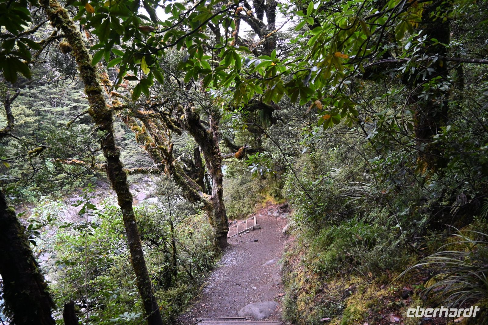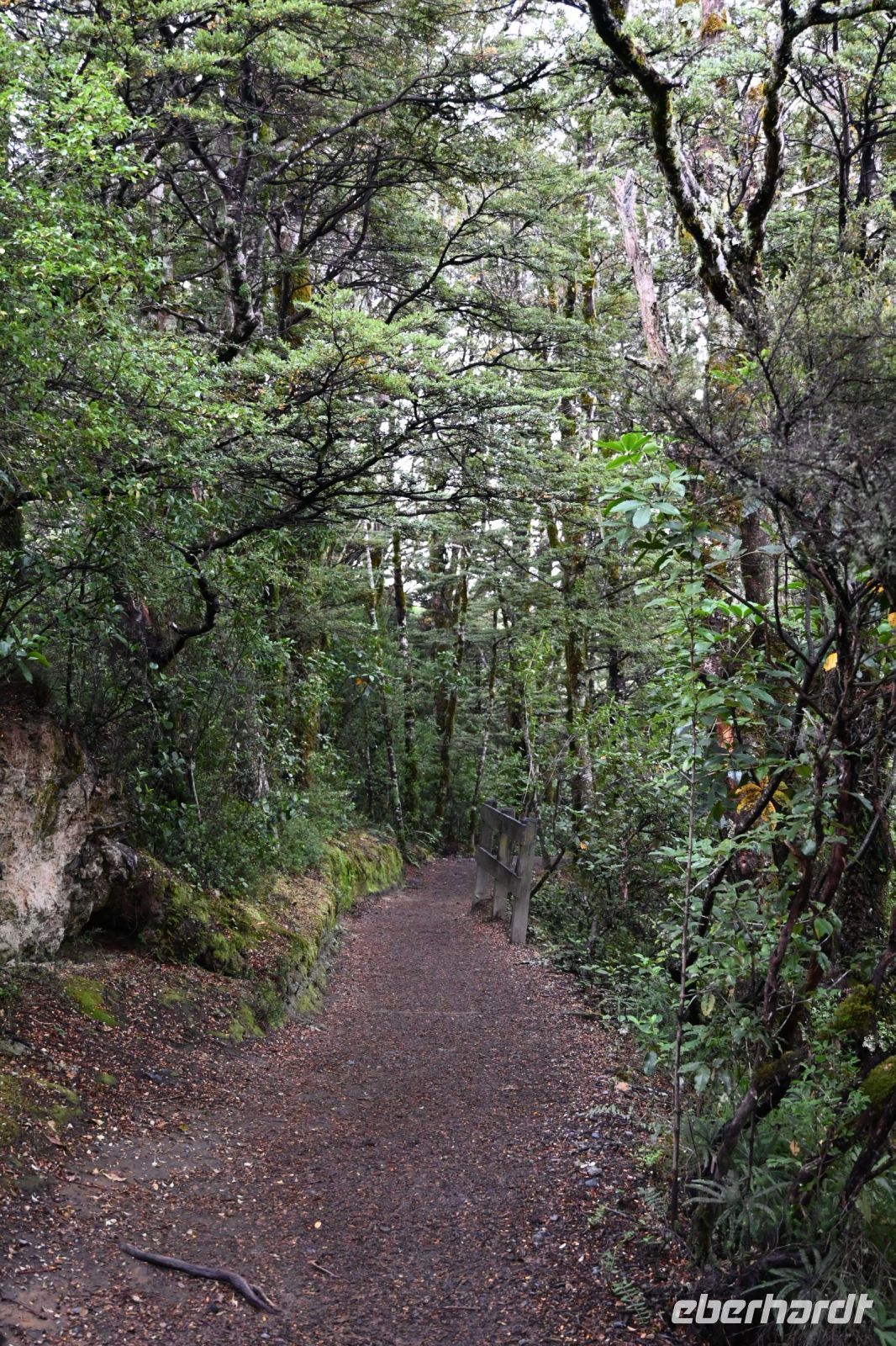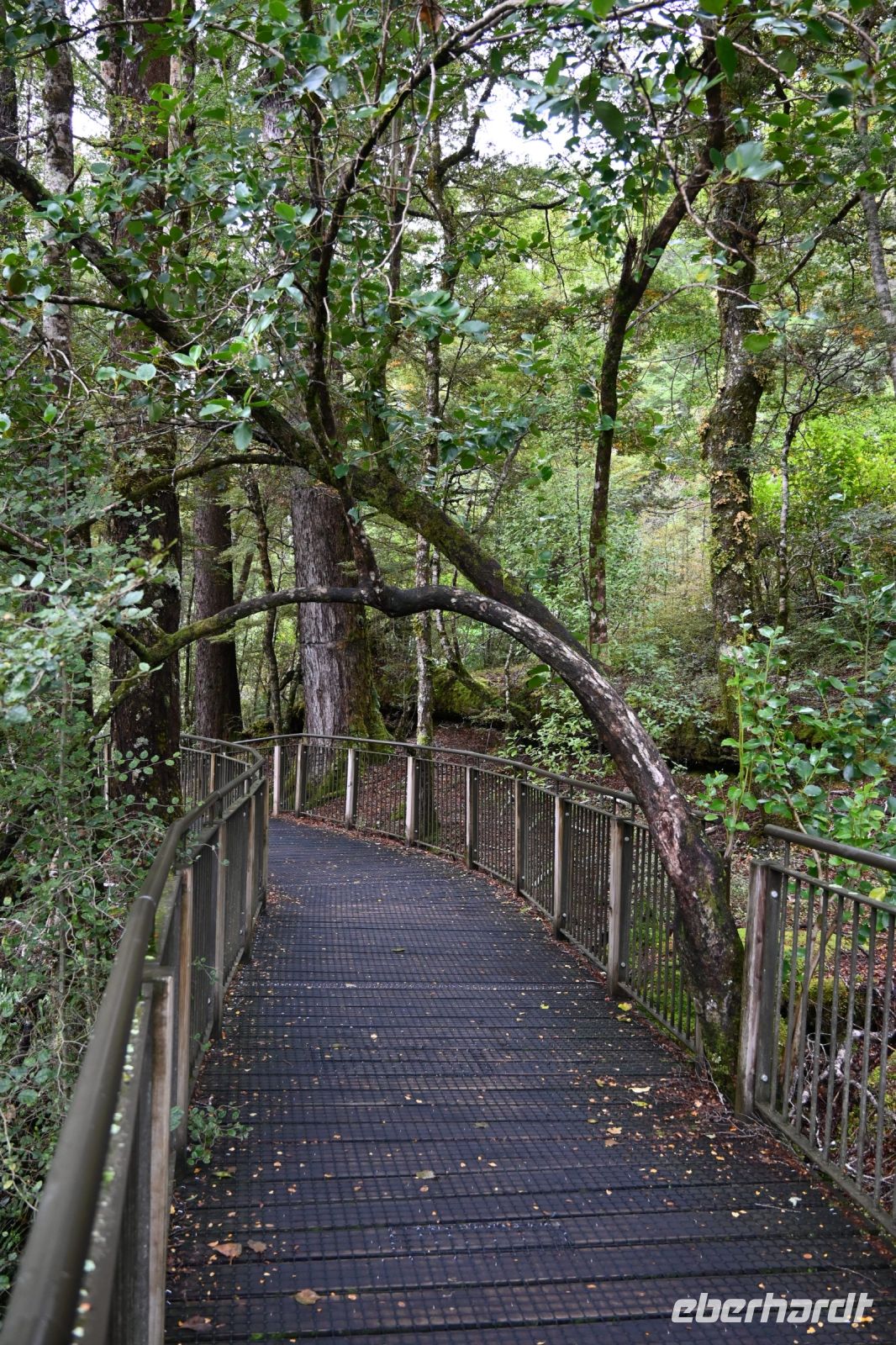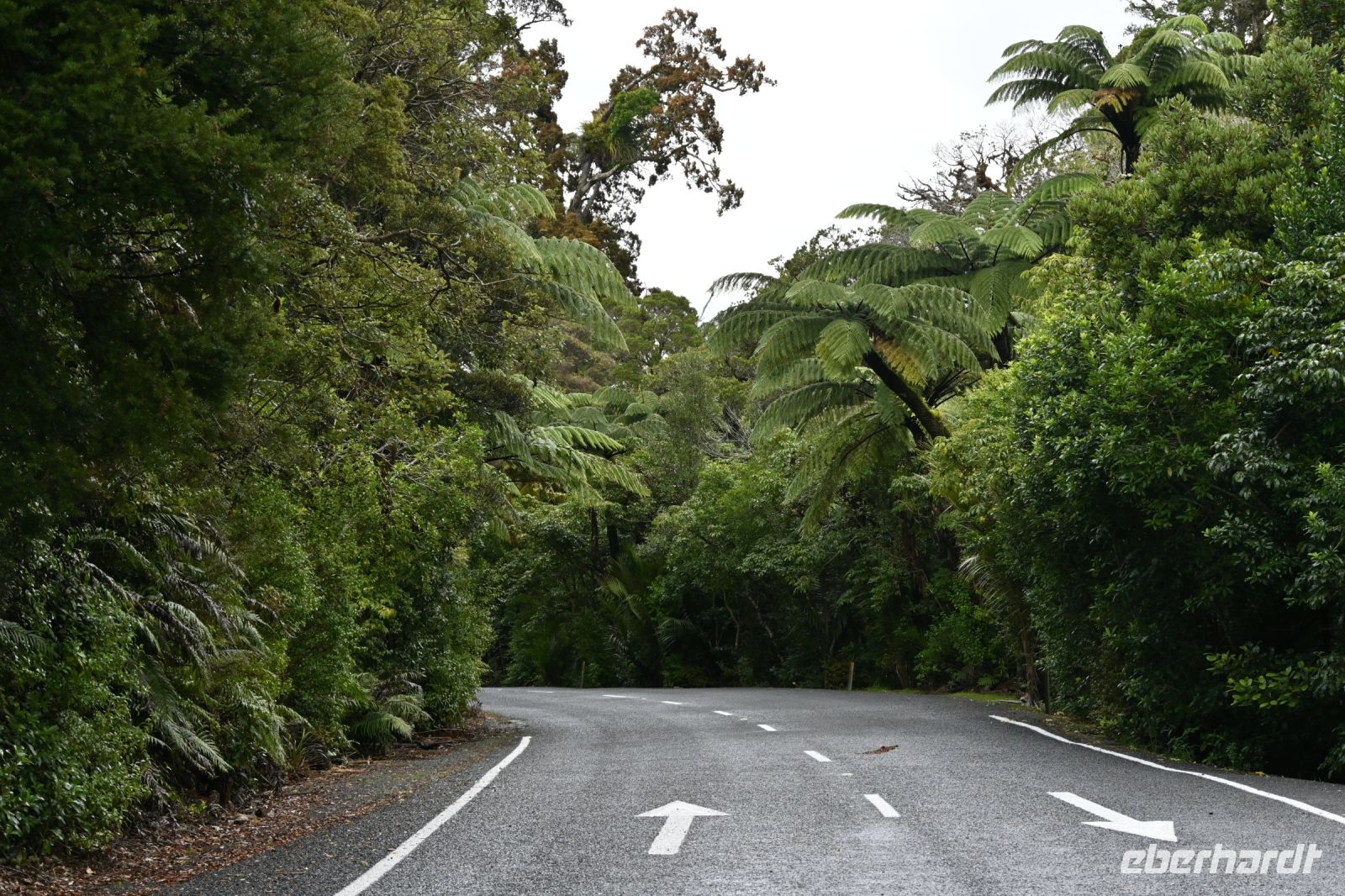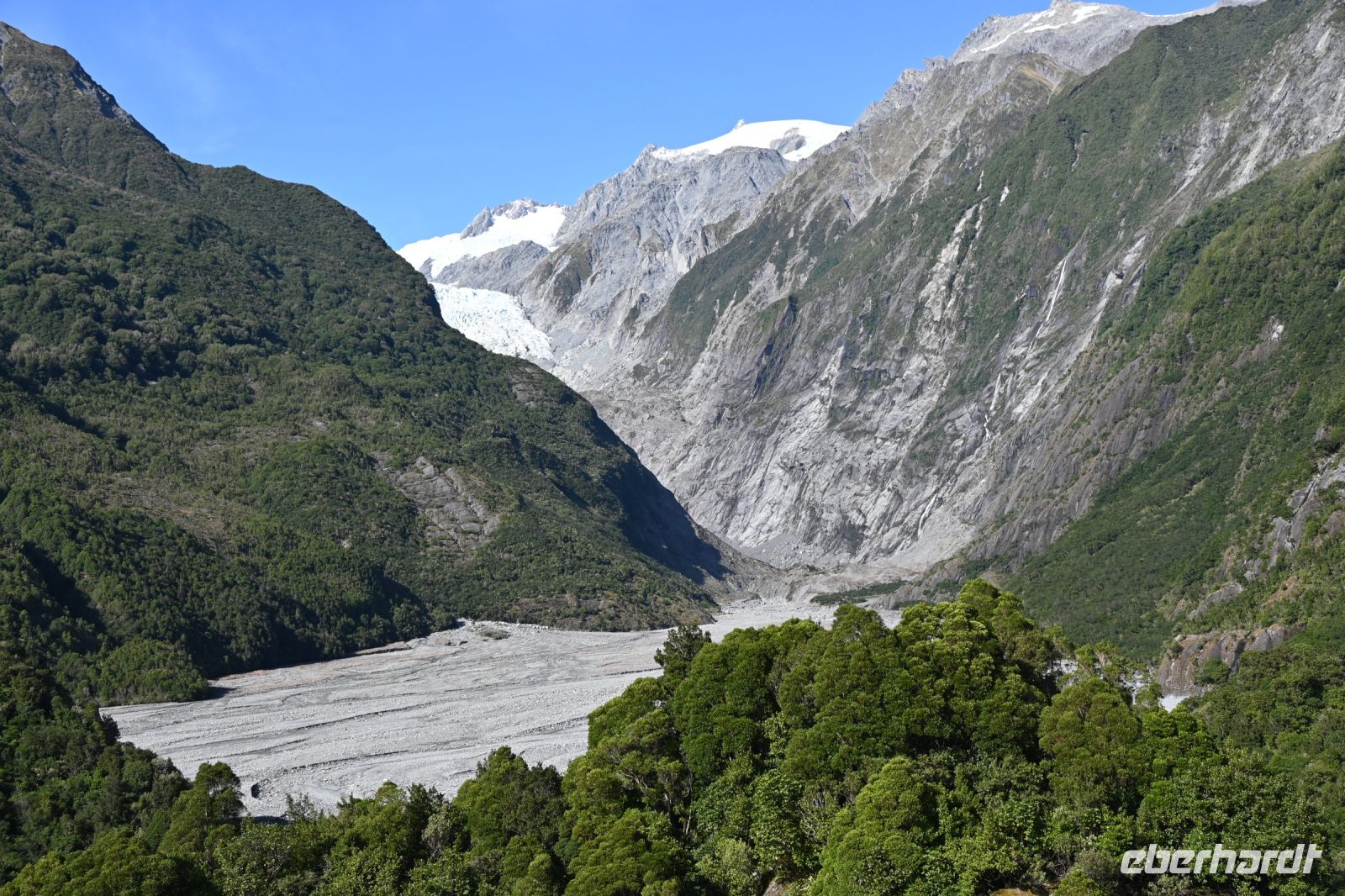 Gleich in der Nähe gibt es die Möglichkeit etwas näher an den Franz-Josef-Gletscher heranzukommen. Von einem kleinen Parkplatz starten wir den Spaziergang durch den Regenwald. Hier schließt sich ein Aussichtspunkt auf den Gletscher an. Ein Naturspektakel, denn nirgendwo auf der Welt kommen sich Regenwald und Gletscher so nahe. Der Anblick ist überwältigend, aber er regt auch zum Nachdenken an. Auf einer Schautafel wird gezeigt, wie weit der Gletscher noch vor einigen Jahren reichte, der Klimawandel hat hier also ganze Arbeit geleistet.