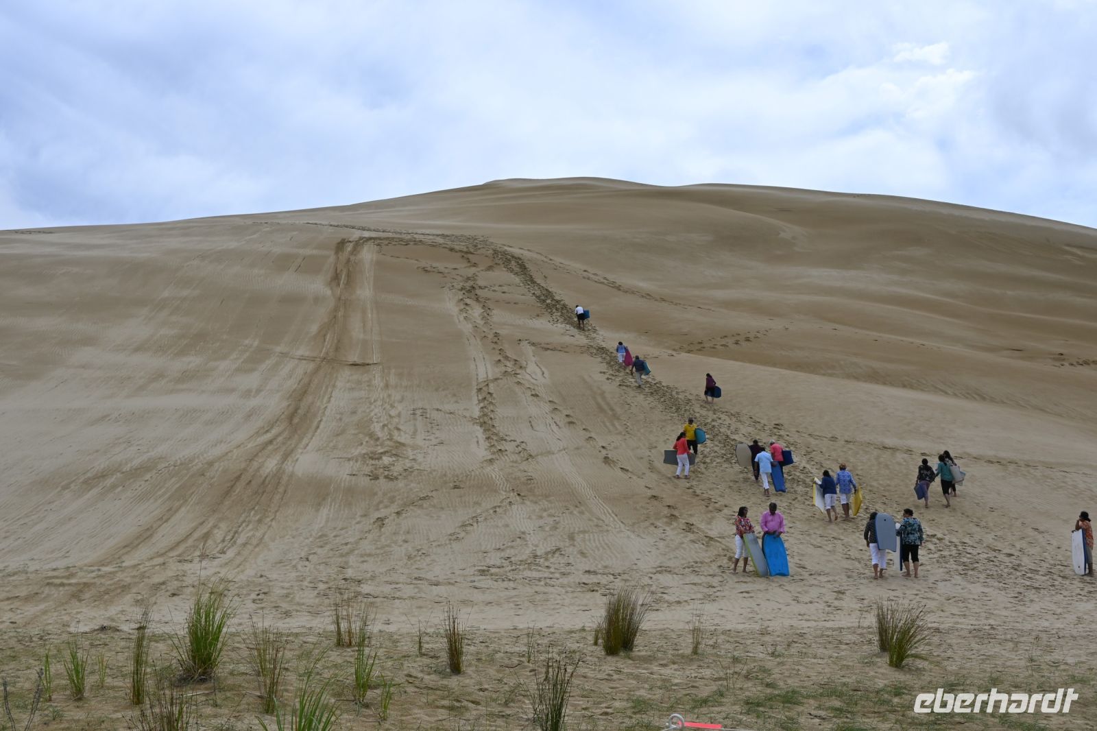Der nächste Fahrabschnitt ist nicht allzu lang. Ein Großteil der Halbinsel besteht aus Sand und so haben sich am Westufer hohe Dünen gebildet, auf denen uns gleich etwas Aktion geboten wird. Unsere Busfahrerin hat für jeden ein breites Surfbrett dabei und läuft direkt vor, die Düne hinauf. Gleich darauf geht es für uns mit dem Kopf voran, bäuchlings die Düne hinab, unsere Zehen dienen als Bremsen. Es macht allen viel Spaß, sowohl denen, die den Berg hinab düsen, als auch den Zuschauern. Mehr als zwei Abfahrten schafft leider keiner, denn der Aufstieg auf die Sanddüne, ist mehr als anstrengend.