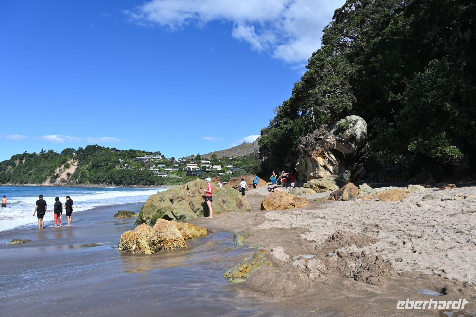 Im Ort Hahei machen wir noch eine kleine Mittagspause, es gibt köstliches Eis und am Strand kann man seine Füße ins Wasser halten oder auch baden gehen. Der offizielle Badepunkt erfolgt aber erst danach. Mit unserem Bus fahren wir zum Hot Water Beach, unter diesem Strand verlaufen heiße Quellen und wenn man sich ein Loch in den Sand buddelt, kann man hier, wie in einer Badewanne, ein schönes Bad genießen. Mit kleinen Schaufeln im Gepäck, machen wir uns auf den Weg vom Parkplatz zum Strand. Auf diesem Weg machen wir schon Witze, dass hoffentlich vorher Bescheid gesagt wurde, dass einer den Wasserhahn aufdrehen soll. Am Strand selbst ist zum Glück gar nicht so viel los. Wir machen uns also auf die Suche nach dem warmen Wasser. Wir graben zwei, drei kleine Löcher an dem Punkt unter den Klippen, aber unsere Suche ist vergeblich. Die Wellen sind leider auch sehr hoch heute und spülen die gegrabenen Löcher sofort wieder zu. Viele haben aber die Badesachen eingepackt und lassen sich trotzdem von den Wellen etwas abkühlen. Steine und Unterströmungen verhindern an diesem Strand leider das Schwimmen.