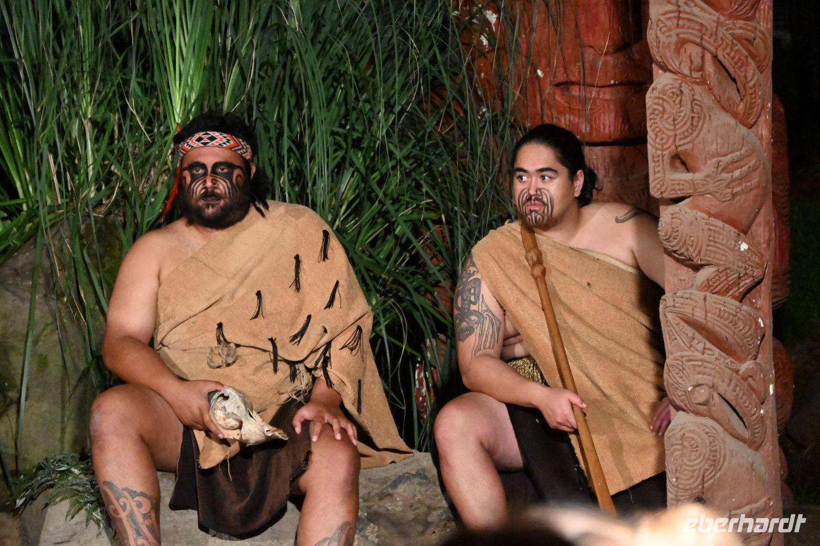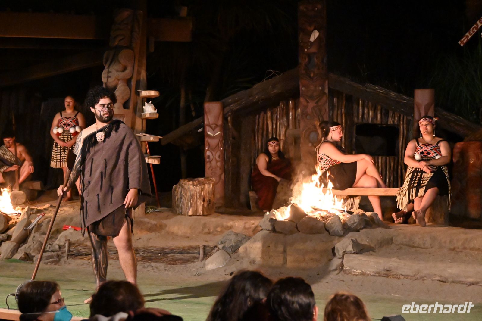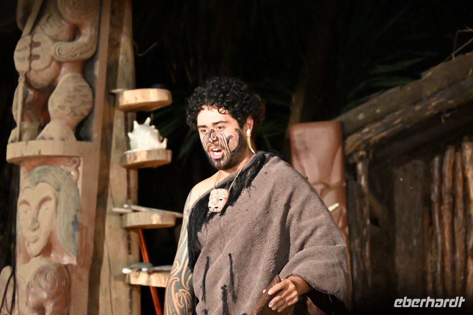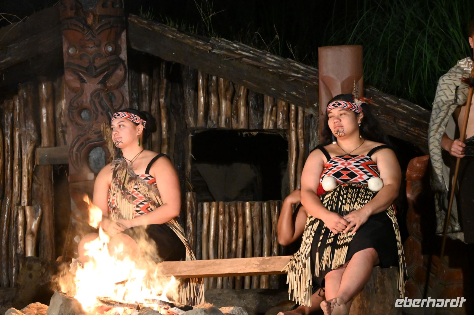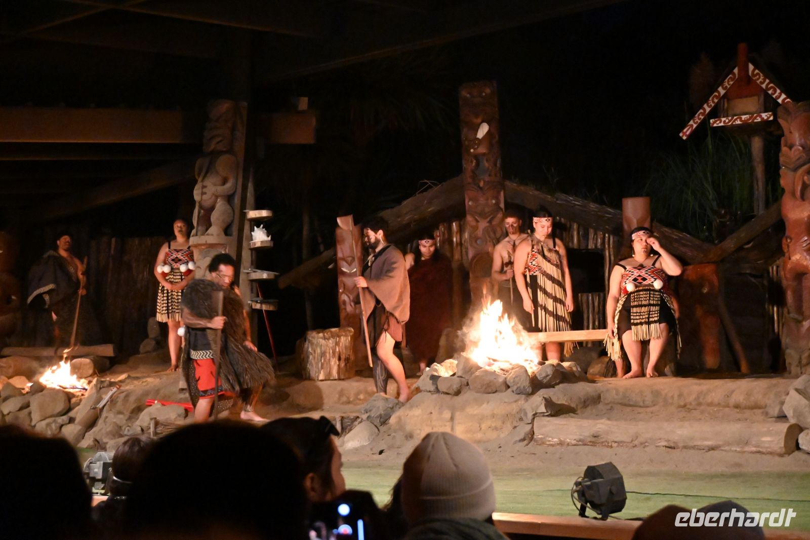 Kurz nachdem wir im Hotel ankommen, geht es für den Großteil der Gruppe schon wieder weiter. Wir werden von einem Bus abgeholt und in ein Maori-Dorf gebracht. Hier gibt es ein traditionelles Hangi-Abendessen, welches im Boden gegart wurde. Mit einer Darbietung von Liedern und Tänzen lassen wir den Abend ausklingen.