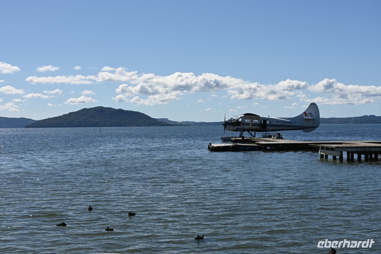 Vier Gäste unserer Gruppe nutzen die Gelegenheit vom Lake Rotorua mit einem Wasserflugzeug einen Rundflug über das Gebiet zu machen. Wir anderen nutzen die Zeit, für einen Mittagssnack oder schauen dem Start des Fliegers zu. In der Sonne lässt es sich gut aushalten. Gleich in der Nähe befindet sich eine Kiwi-Hatchery, also eine Aufzuchtstation der hier endemischen Vögel. Wir bekommen eine kleine Führung und haben Glück, es wurden gerade zwei neue Eier in die Station gebracht. Eigentlich im April total ungewöhnlich, denn die Saison endet im März. Wir können sehen, wie das Ei von einer Mitarbeiterin überprüft wird und gewaschen wird. Mit einer Lampe wird geschaut, ob das Ei noch lebt und ob Risse in der Schalen zu finden sind, die dem Küken schaden könnten. Die beiden Eier sind in Ordnung, andernfalls wird es mit klarem Nagellack repariert. Um den Kiwi-Bestand in Neuseeland wieder zu steigern, werden die Eier hier in der Station ausgebrütet und die Vögel erst wieder am Fundort ausgesetzt, wenn Sie ein Gewicht von einem Kilogramm erreicht haben. Erst dann sind sie überlebensfähig und können sich gegen ihre Fressfeinde wehren. In dieser Aufzuchtstation wurden seit 1995 bereits 2.415 Kiwi-Küken ausgebrütet. Die letzte Saison hält den Rekord mit 143 ausgebrüteten Eier.