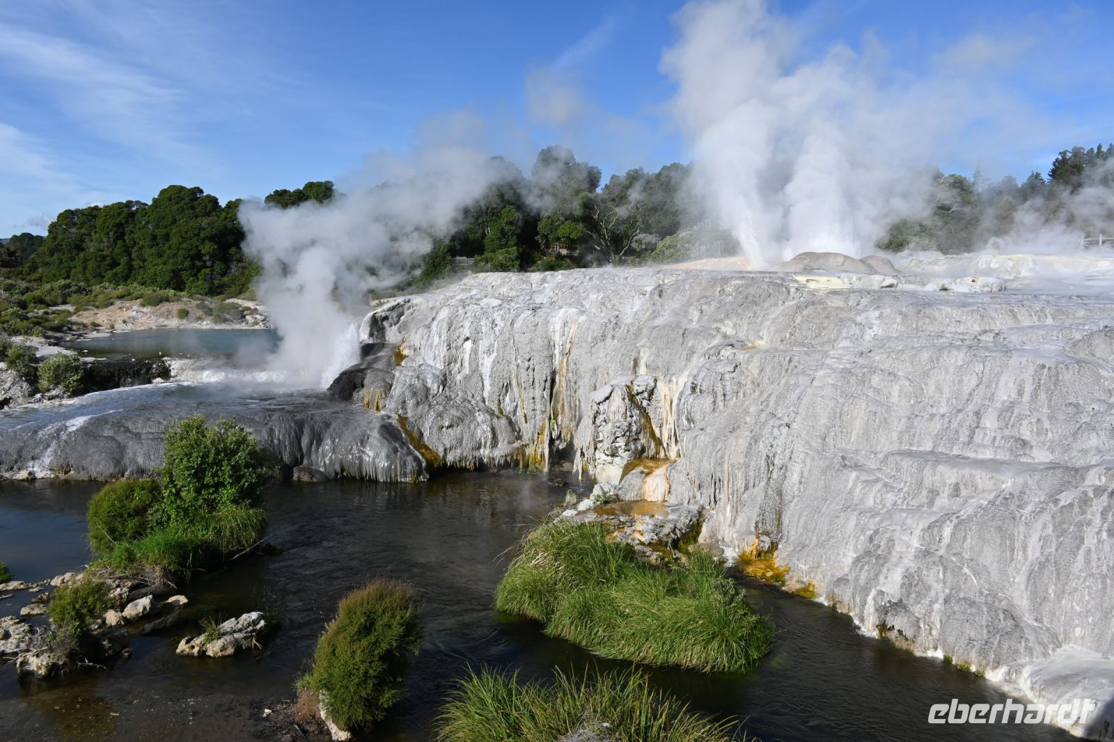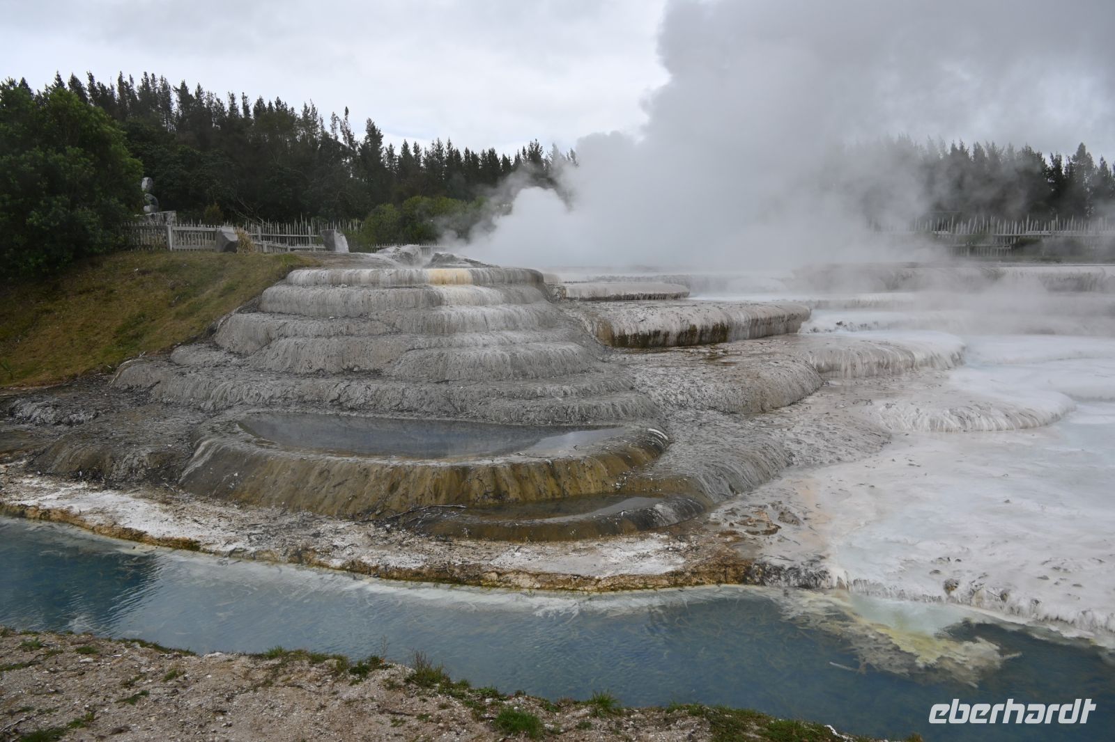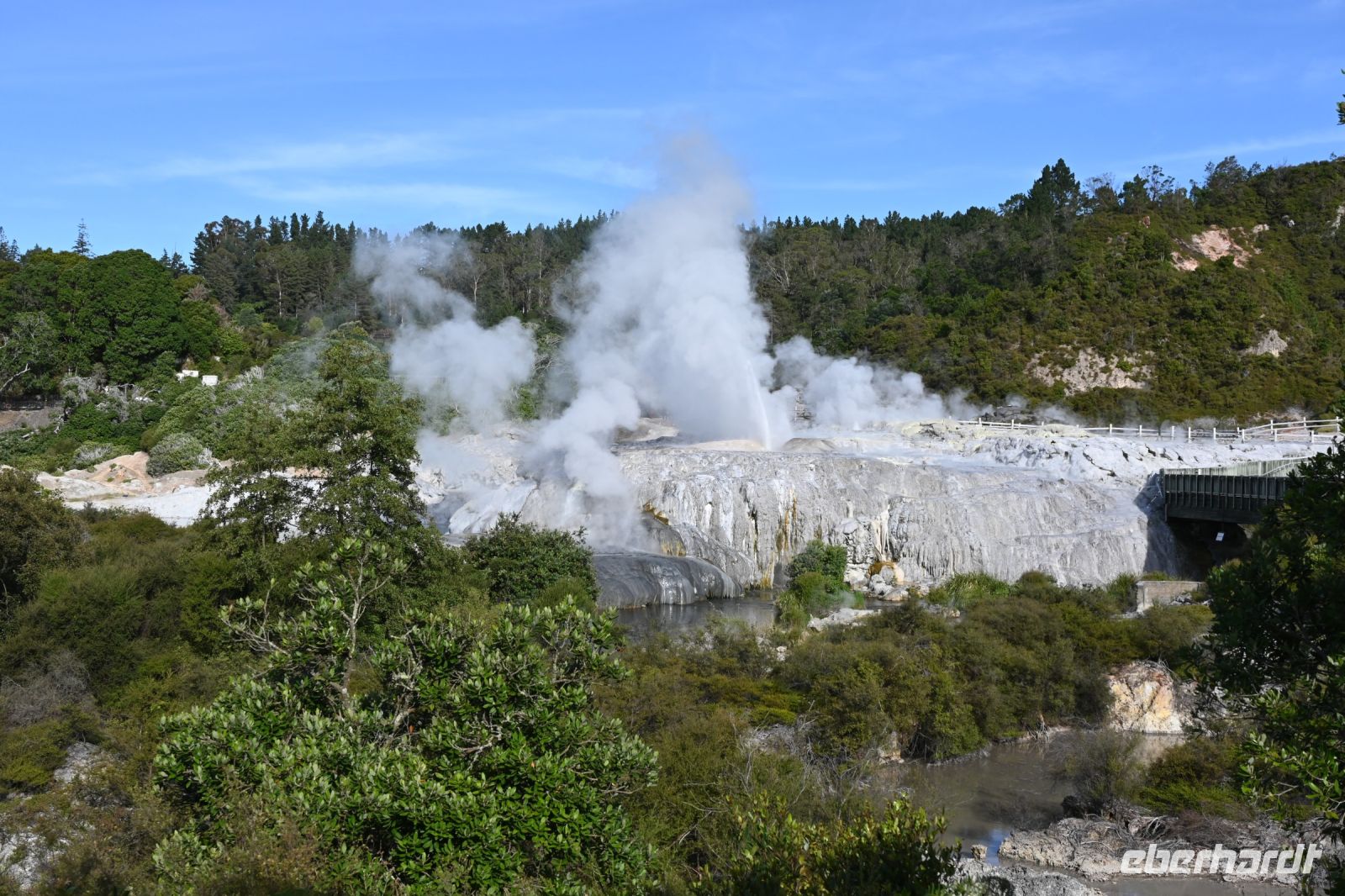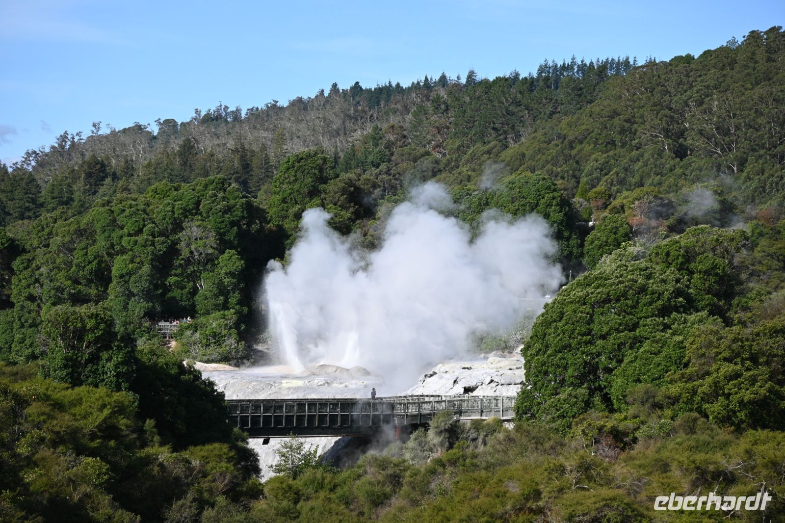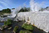 Auf dem Gelände gibt es ein kleines Kiwi-Haus. In der Station hatten die beiden Kiwis sich leider versteckt, hier haben wir mehr Glück und können gleich alle drei Bewohner sehen. Verlässt man das Haus steht man vor einem großen Schlammfeld, welcher schon zum Geothermalfeld gehört. Dieser wird hier in den Krankenhäusern auch zu medizinischen Zwecken genutzt. Am Ende des Parks sehen wir nun das große Thermalfeld mit den Sintaterrassen, welche aus dem schwefelhaltigen Wasser entstanden sind und den Geysir Pohutu. Immer wieder spuckt er kleine Wassermassen und ungefähr zweimal die Stunde spukt er eine bis zu 30 Meter hohe Fontäne in den Himmel. Dieses Spektakel bleibt uns heute leider verwehrt.