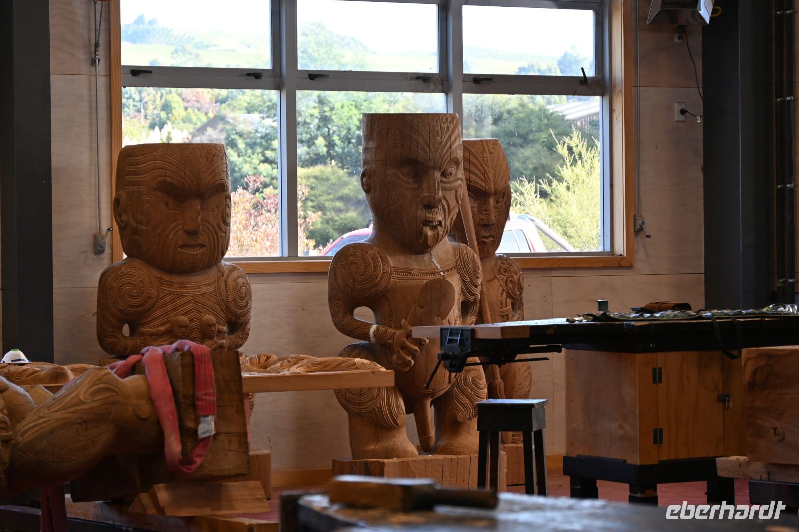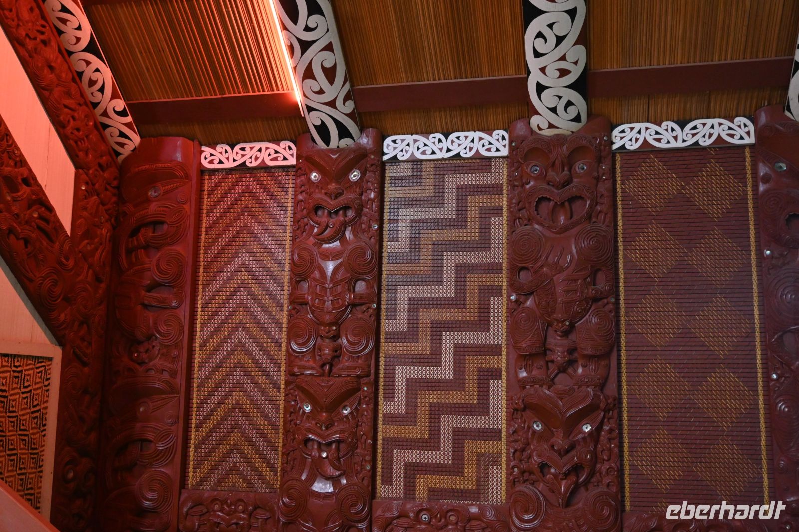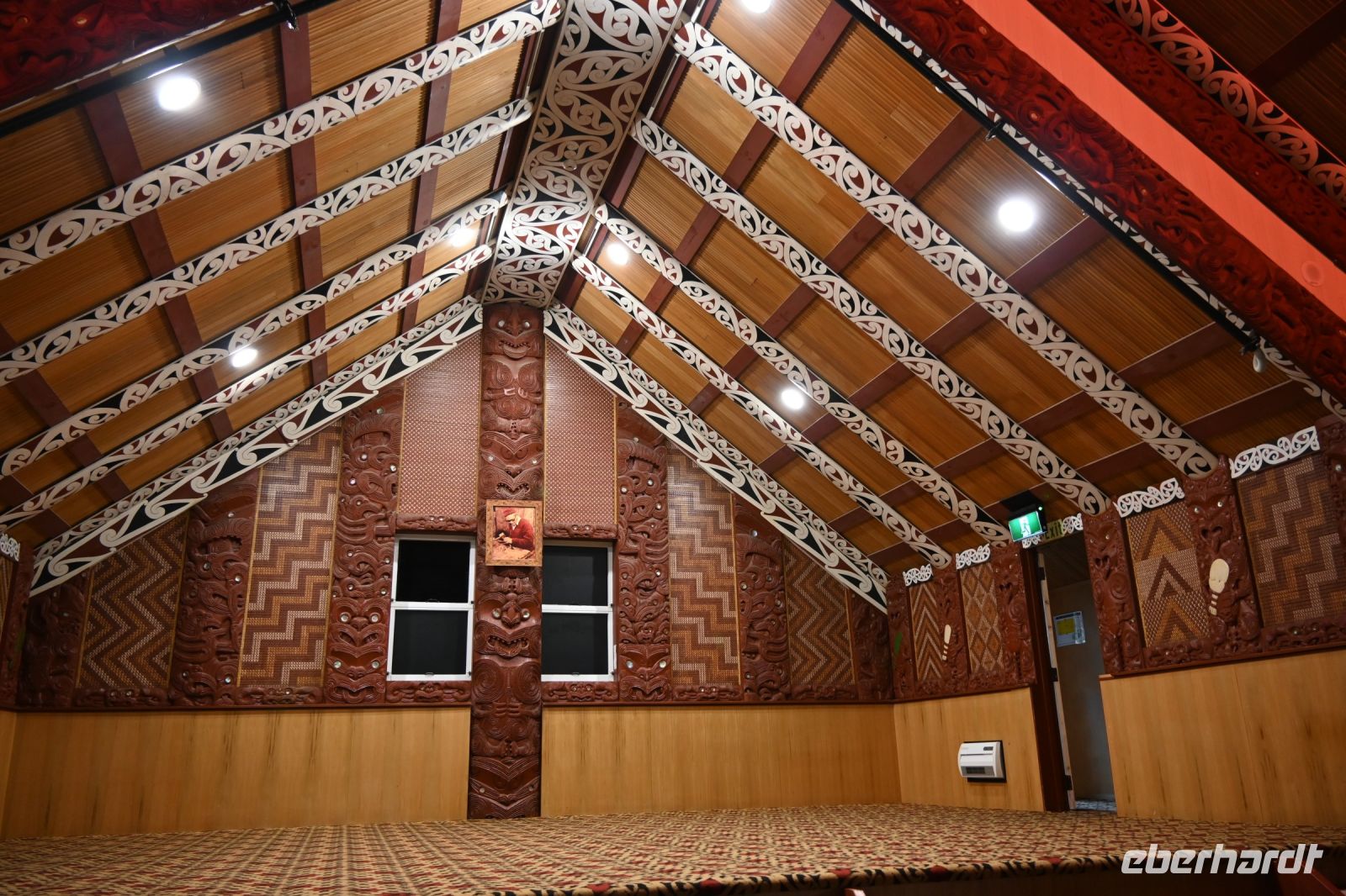 Im Anschluss geht es weiter nach „Te Puia“, dieser Ort am Rande von Rotorua vereint mehrere Sehenswürdigkeiten. Zum einen gibt es das Institut für „Maori Arts & Crafts“, hier werden die Maori-Künste im Schnitzen und Weben gelehrt. Wir können sogar einigen Schülern bei der Arbeit zusehen. Des Weiteren ist auf dem Gelände ein Maori-Dorf nachgebildet, so haben wir die Chance auch mal in ein „Wharenui“ (Versammlungshaus) zu schauen.