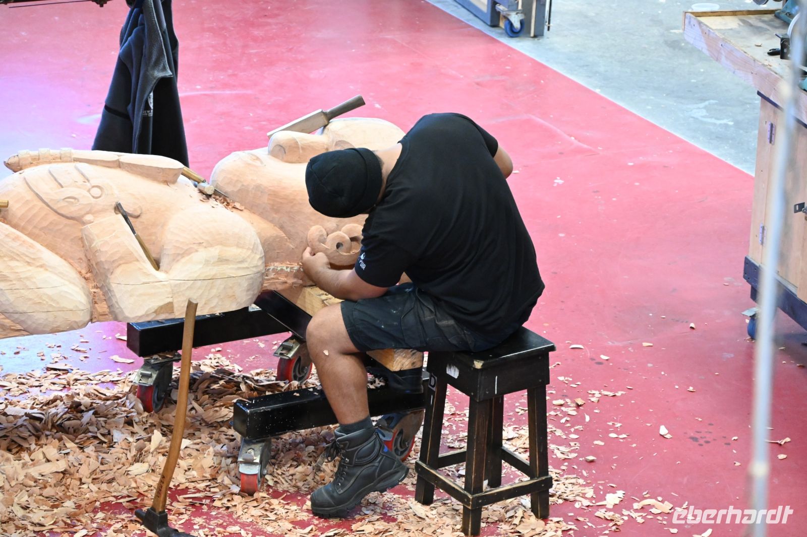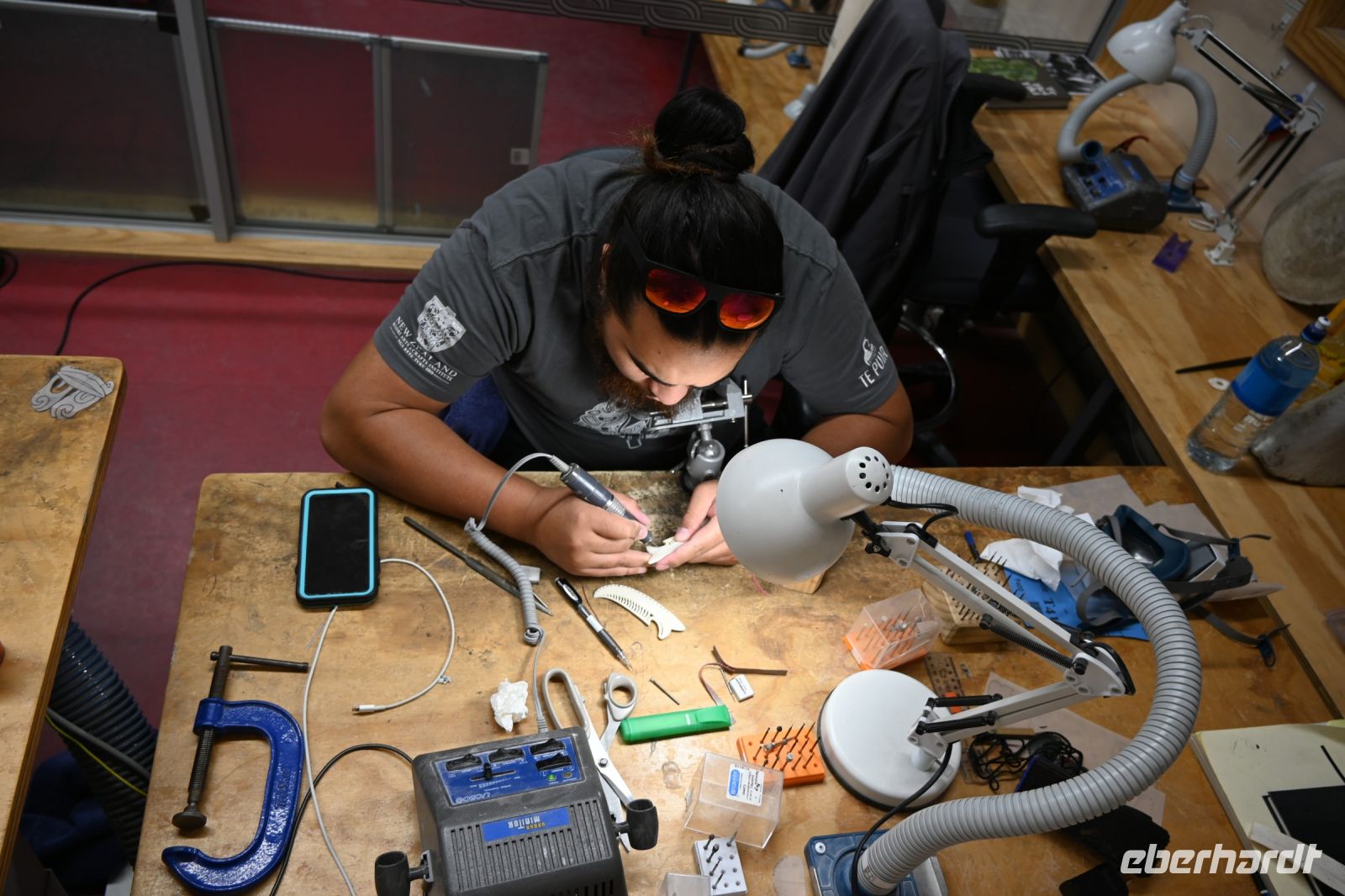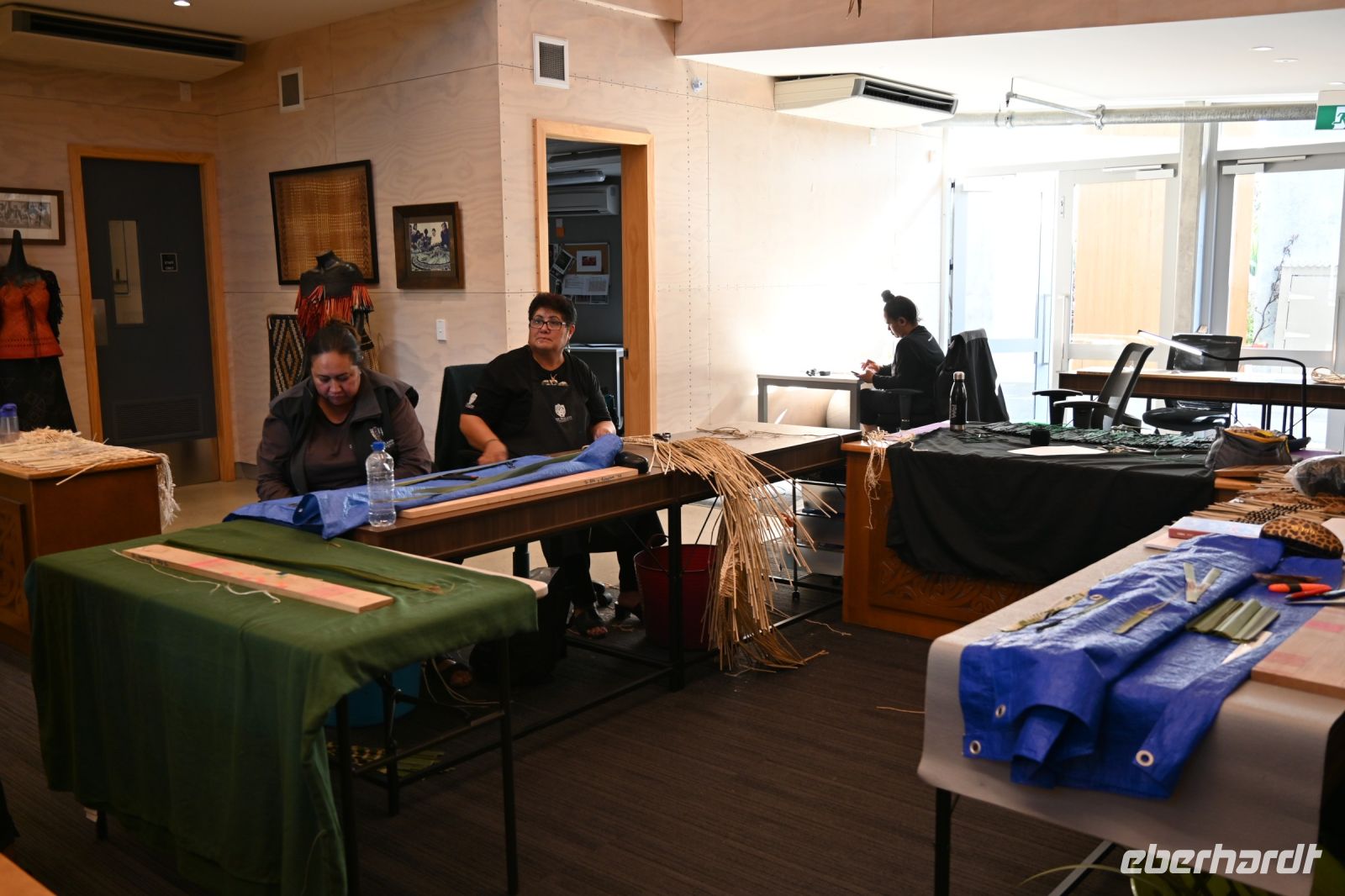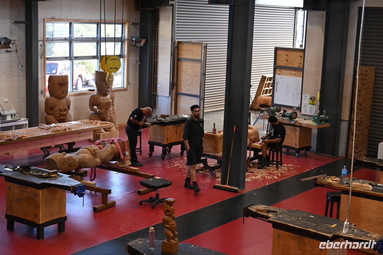 Im Anschluss geht es weiter nach „Te Puia“, dieser Ort am Rande von Rotorua vereint mehrere Sehenswürdigkeiten. Zum einen gibt es das Institut für „Maori Arts & Crafts“, hier werden die Maori-Künste im Schnitzen und Weben gelehrt. Wir können sogar einigen Schülern bei der Arbeit zusehen. Des Weiteren ist auf dem Gelände ein Maori-Dorf nachgebildet, so haben wir die Chance auch mal in ein „Wharenui“ (Versammlungshaus) zu schauen.