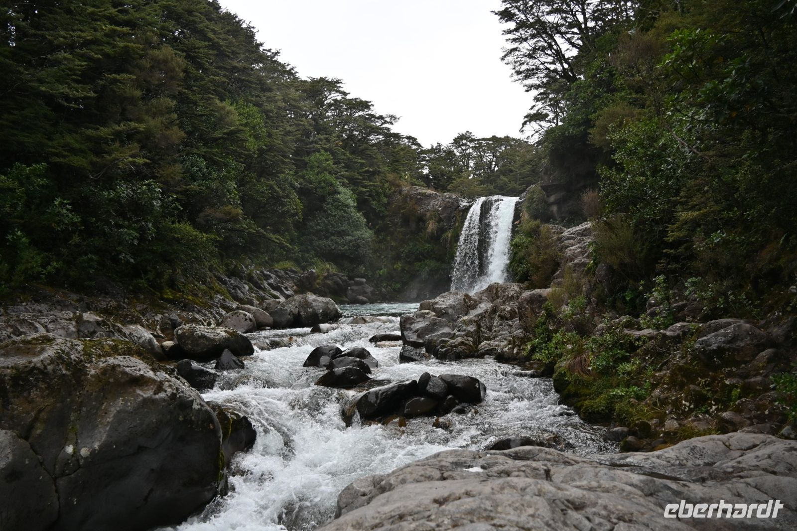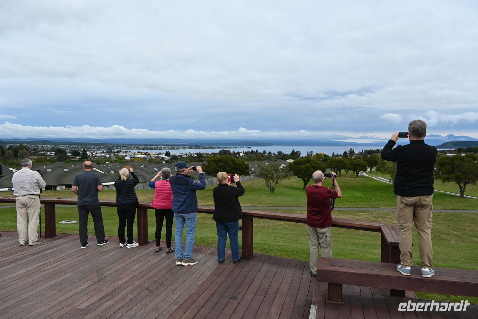 Am Vormittag werden wir auf dem Gelände des Ngati Tuwharetoa-Stammes begrüßt. Unsere Gruppe erhält eine exklusive Führung auf dem Gelände. Wir erfahren, dass der Aufbau des Versammlungshauses dem des menschlichen Körpers ähnelt und den Vorfahren des Stammes repräsentiert. Allgemein ist die Geschichte der Vorfahren sehr wichtig. Die Schnitzereien im Holz erzählen immer eine Geschichte, meist die des Stammes oder allgemein der Maori. Dabei spielen die Farben Schwarz (das Leben vor dem Licht), Weiß (das Licht) und Rot (das Blut, das durch die Adern fließt) immer eine wichtige Rolle. Immer wieder taucht auch mal die Farbe blau auf, die dann für das Meer steht. In den Schnitzereien werden Muscheln für die Augen verwendet, immer die, die in vielen Farben schimmern, damit werden die Schnitzereien zum Leben erweckt und bekommen mehr Aufmerksamkeit. Auf dem Gelände des Stammes ist auch eine Geothermalanlage, diese wurde jedoch künstlich angelegt. Wir werden später hier die Möglichkeit haben in dem warmen Quellen zu baden. Maschinell wird das heißt Wasser nach oben gepumpt und erzeugt einen künstlichen Geysir. Beim Austritt hat das Wasser 135° C. Über die Terrassen kühlt es auf circa 40° C hinunter, so dass man entspannt darin baden kann.