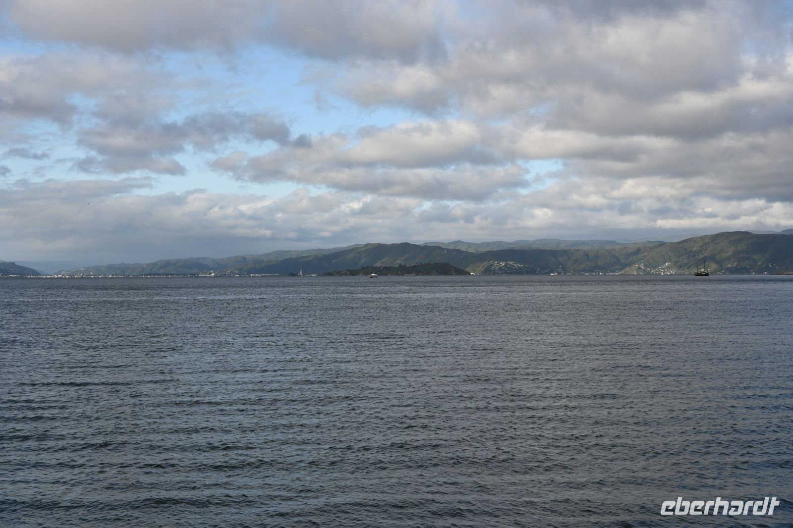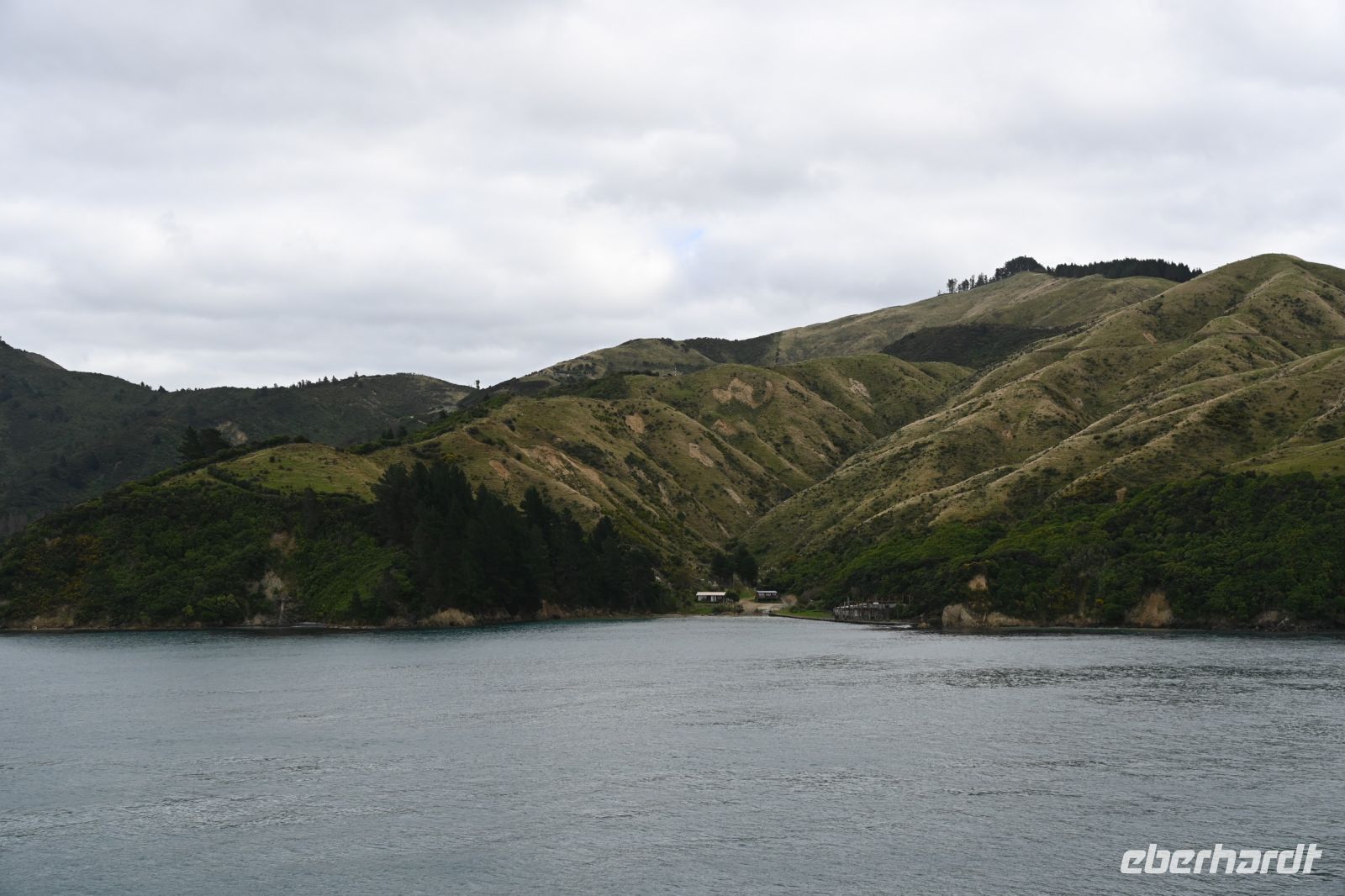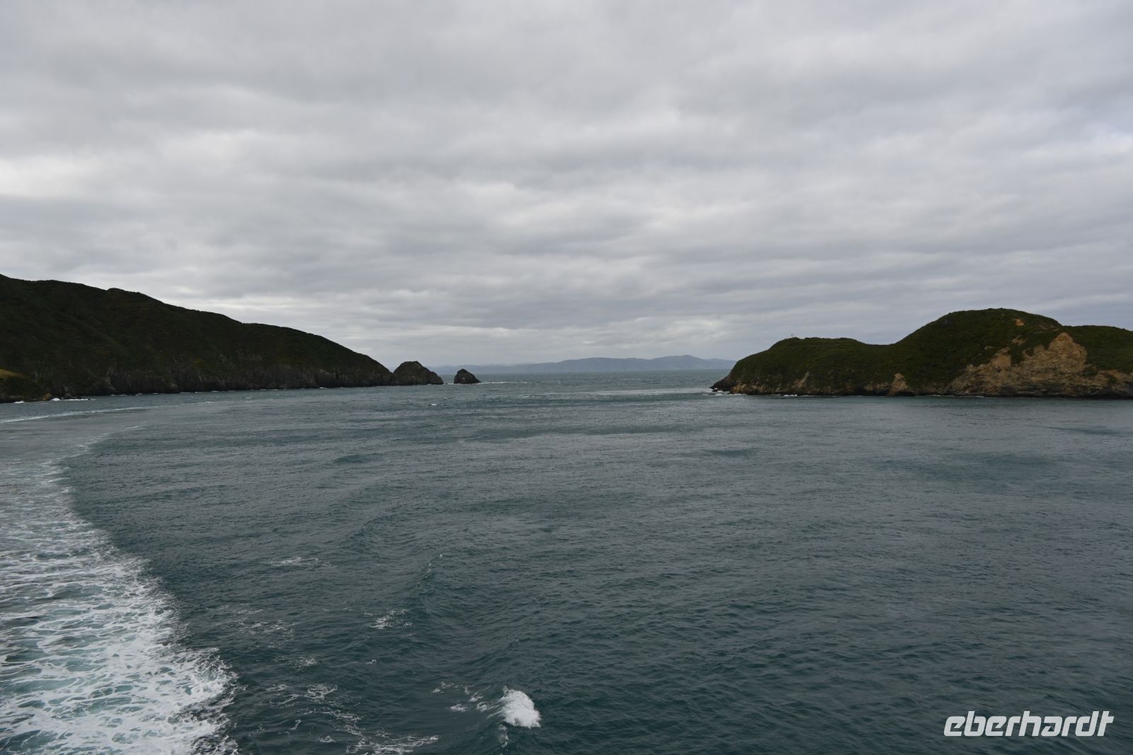 Bereits 7.30 Uhr verlassen wir unser Hotel, diesmal ohne Frühstück. Es geht direkt zum Fähranleger, wo wir einchecken und nach einiger Zeit auch mit dem Bus in das Innere des Schiffes fahren dürfen. Jeder bekommt von mir zwei Verzehrgutscheine, die wir im Restaurant gegen ein Frühstück unserer Wahl eintauschen dürfen. Schon verlassen wir den Hafen von Wellington. Die Ausfahrt dauert ungefähr eine Stunde, bevor wir die Cook Street erreichen und uns genau zwischen den beiden Inseln befinden. Das Wetter ist etwas trüb, aber einige Sonnenstrahlen schaffen es durch die Wolkendecke. Eine weitere Stunde später haben wir die Küste der Südinsel erreicht und passieren die schmale Einfahrt in die Malborough Sounds und nähern uns damit immer weiter dem Küstenort Picton. Unser Bus steht weit vorn in der Fähre und so sind wir eines der ersten Fahrzeuge, welches wieder von Board fahren darf.