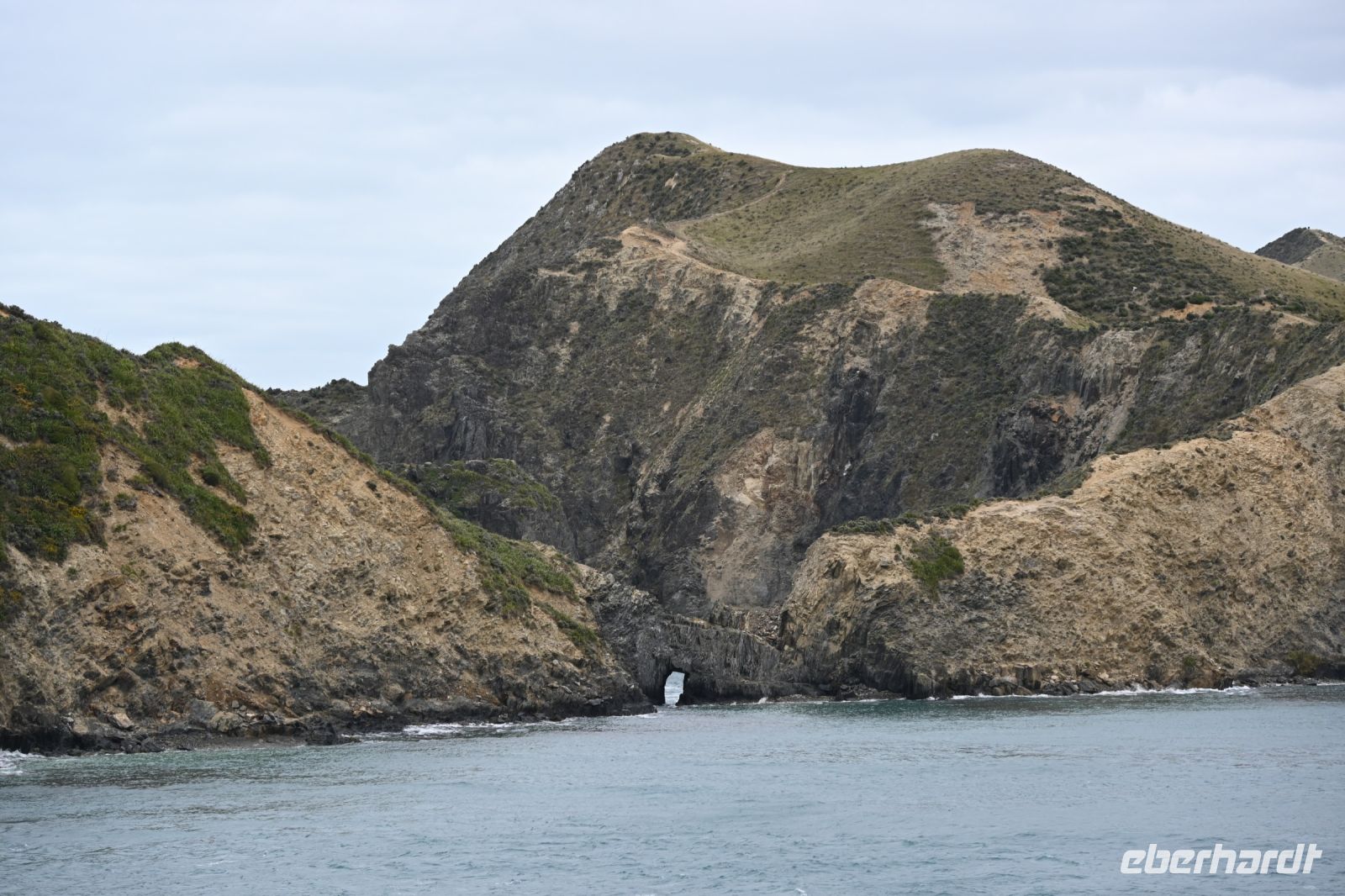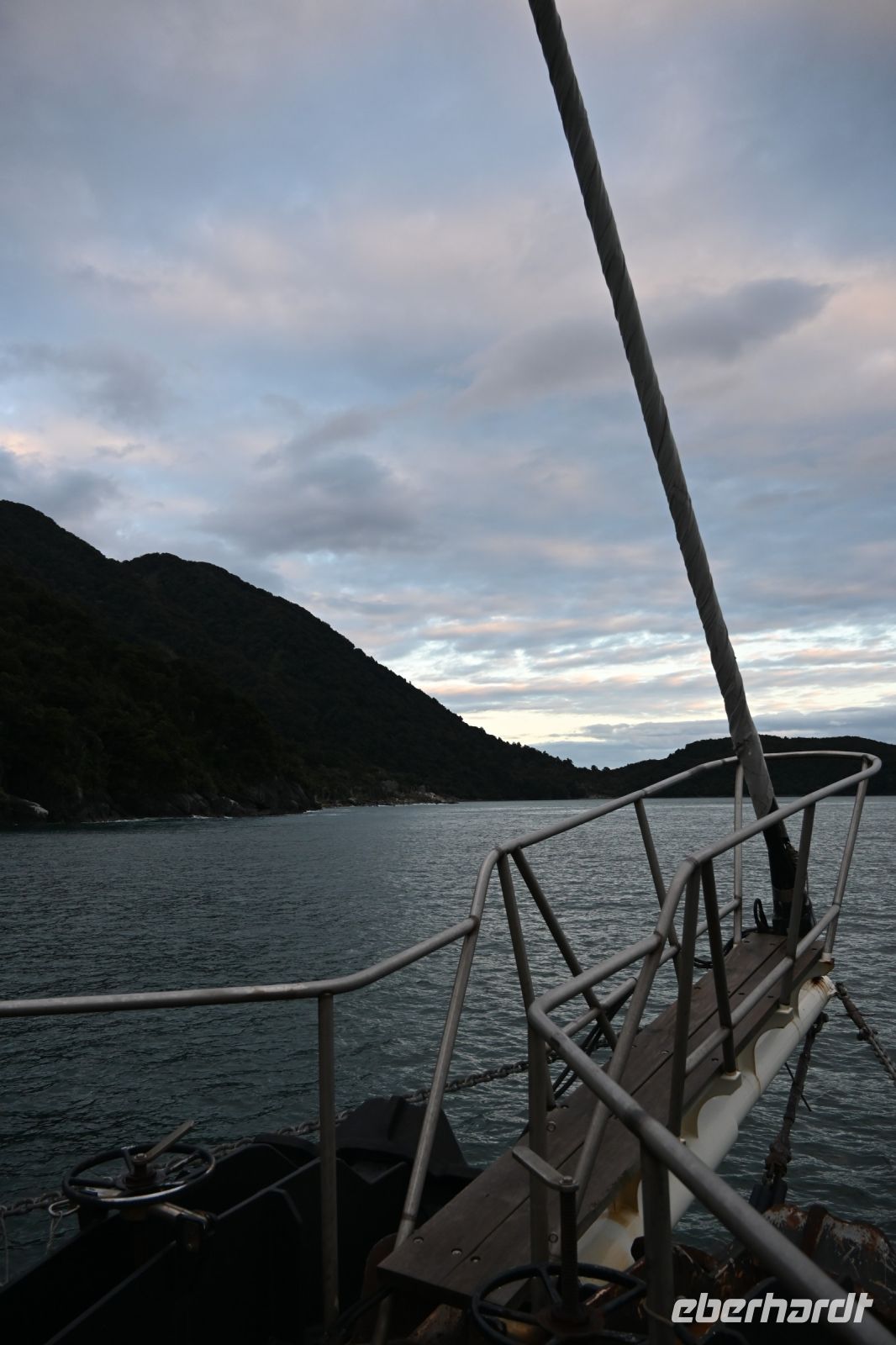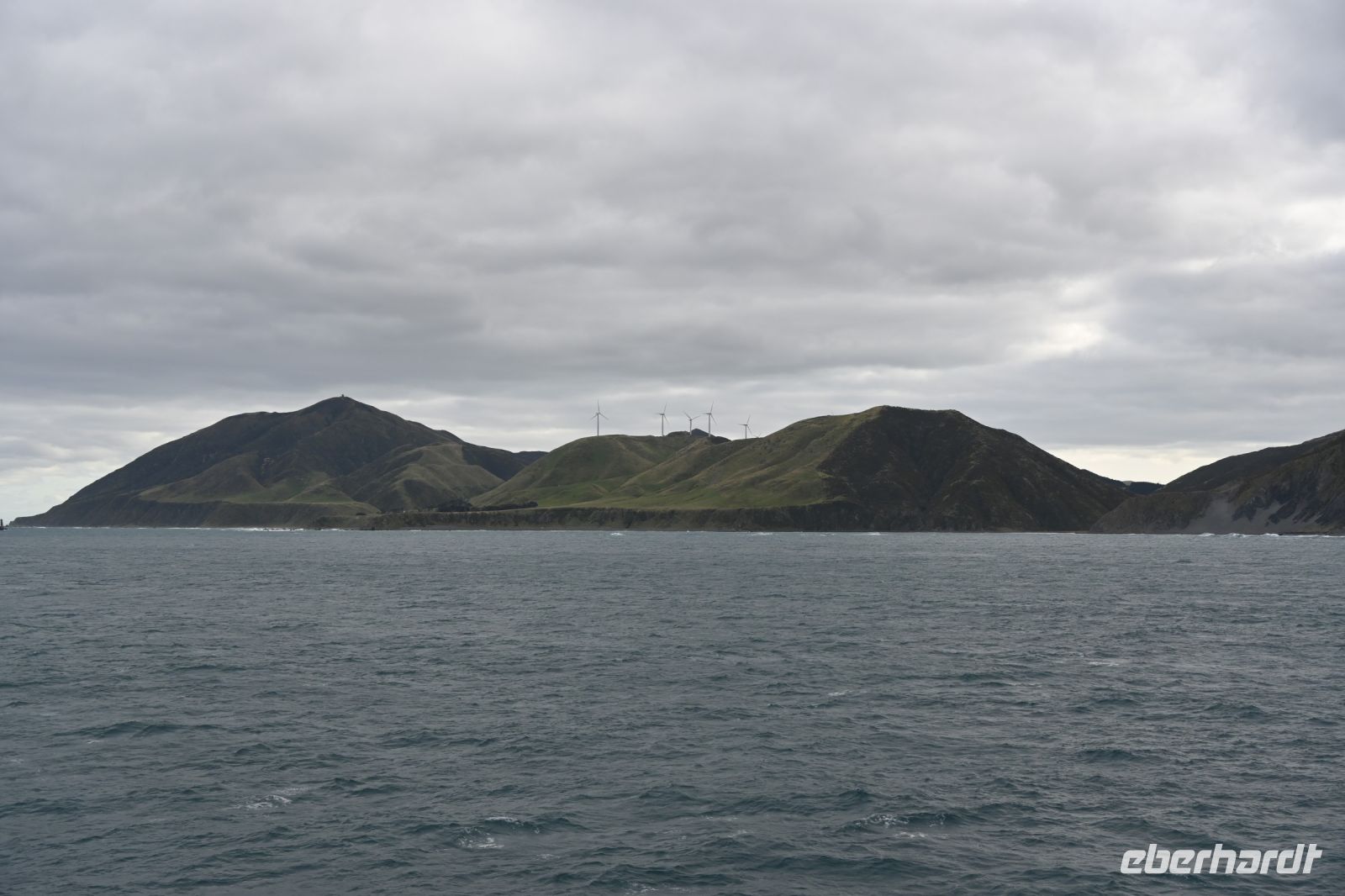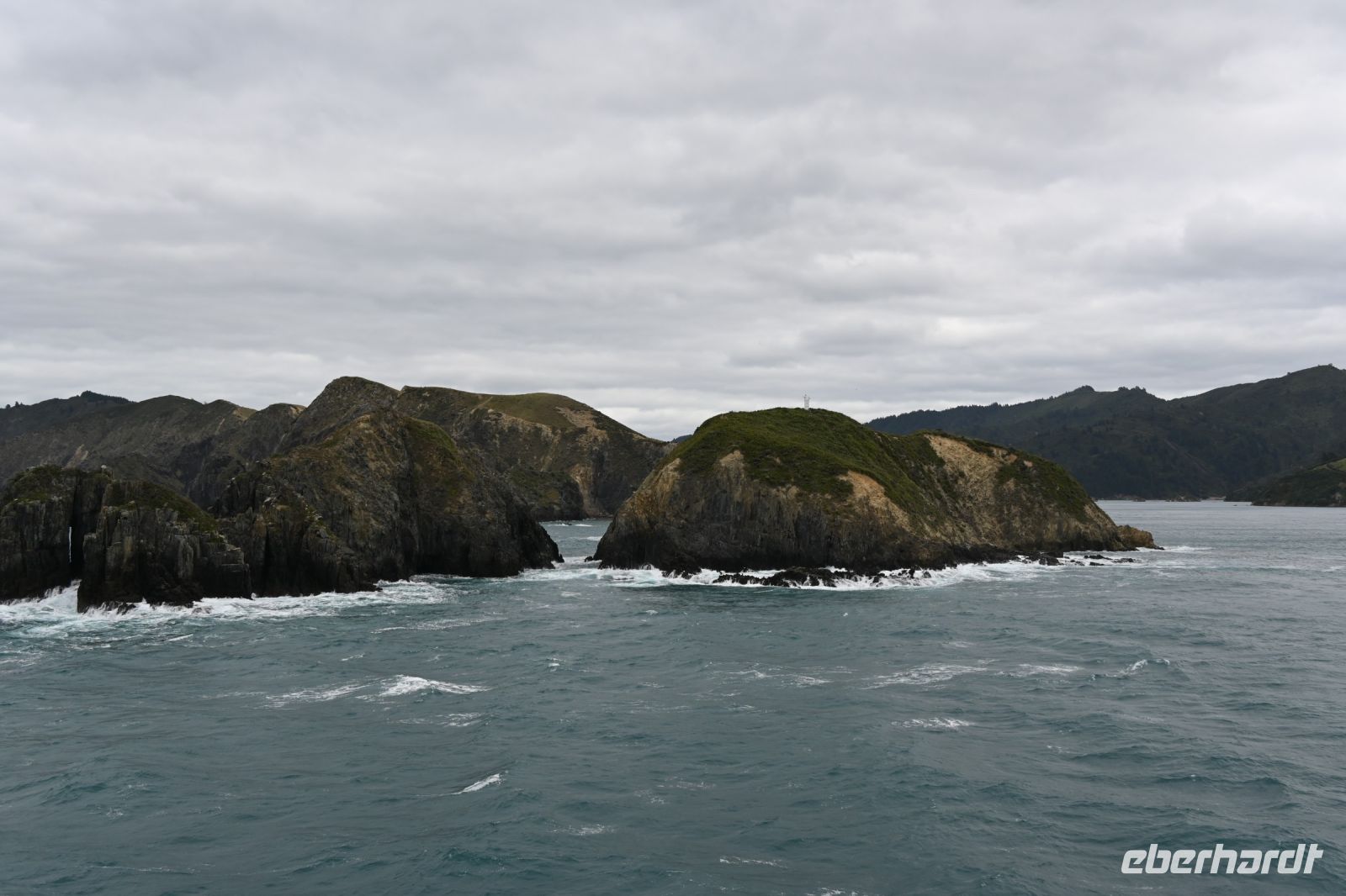 Bereits 7.30 Uhr verlassen wir unser Hotel, diesmal ohne Frühstück. Es geht direkt zum Fähranleger, wo wir einchecken und nach einiger Zeit auch mit dem Bus in das Innere des Schiffes fahren dürfen. Jeder bekommt von mir zwei Verzehrgutscheine, die wir im Restaurant gegen ein Frühstück unserer Wahl eintauschen dürfen. Schon verlassen wir den Hafen von Wellington. Die Ausfahrt dauert ungefähr eine Stunde, bevor wir die Cook Street erreichen und uns genau zwischen den beiden Inseln befinden. Das Wetter ist etwas trüb, aber einige Sonnenstrahlen schaffen es durch die Wolkendecke. Eine weitere Stunde später haben wir die Küste der Südinsel erreicht und passieren die schmale Einfahrt in die Malborough Sounds und nähern uns damit immer weiter dem Küstenort Picton. Unser Bus steht weit vorn in der Fähre und so sind wir eines der ersten Fahrzeuge, welches wieder von Board fahren darf.